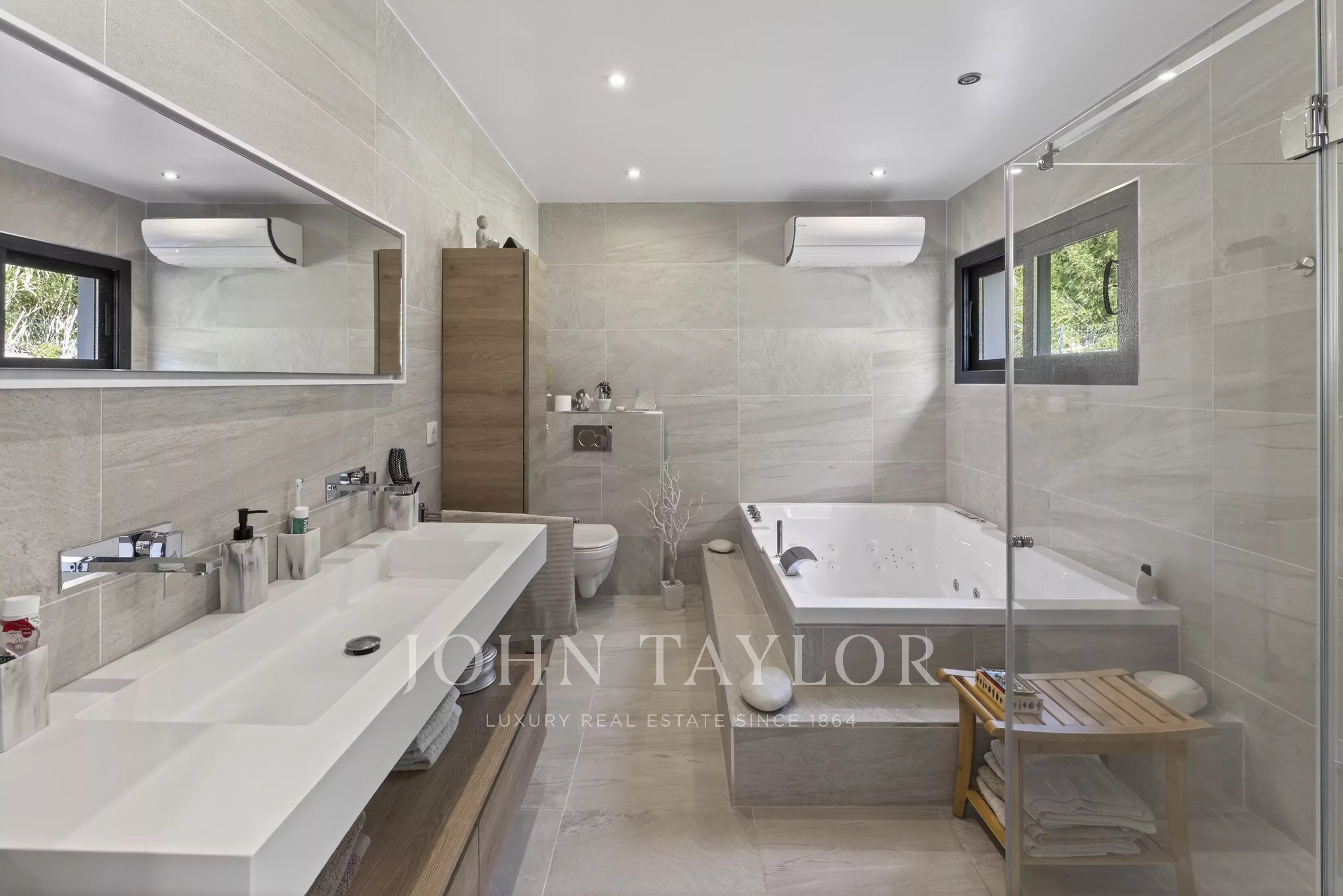 The outdoor areas are designed for relaxation: a 12 x 4 meter mirror swimming pool, jacuzzi, large wooden terrace and bioclimatic pergola. The garden is well maintained, fully enclosed and easy to care for.