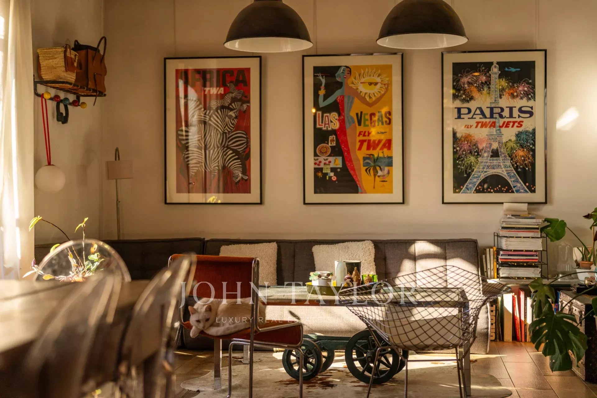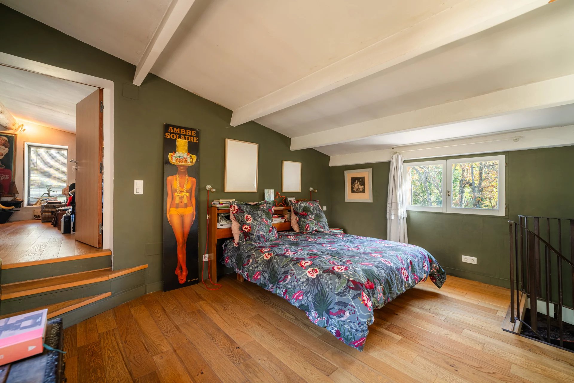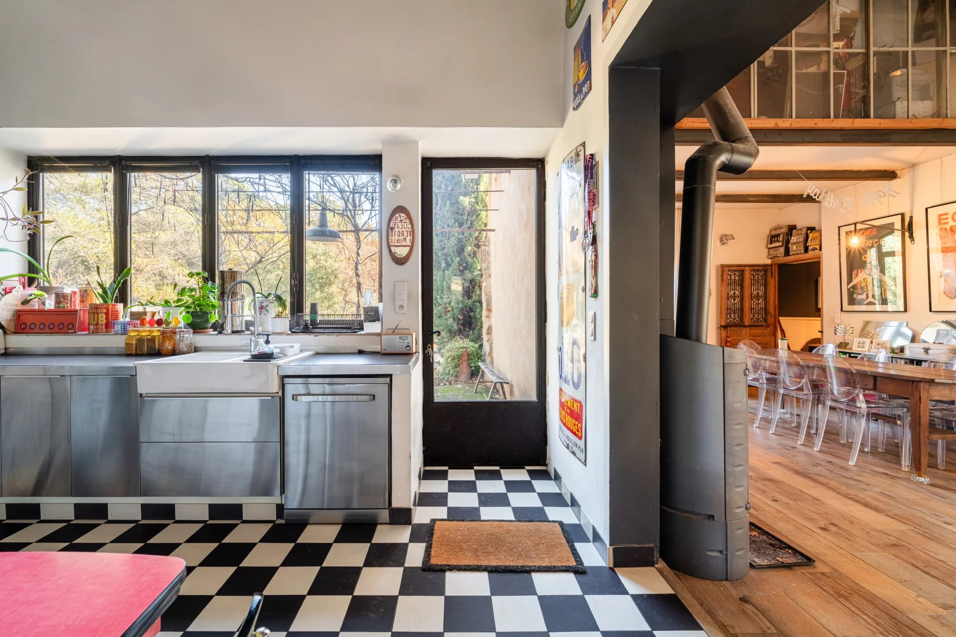 It opens onto a vast open-plan living space bathed in light, comprising a cosy living room with a wood-burning stove and an authentic, convivial workshop kitchen, extended by a terrace sheltered by an arbour.