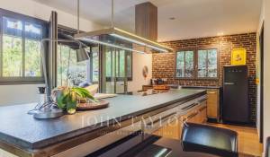 The main living area features a vast living room opening onto a modern kitchen, creating a bright, convivial space that opens onto the lush garden surrounding the villa.