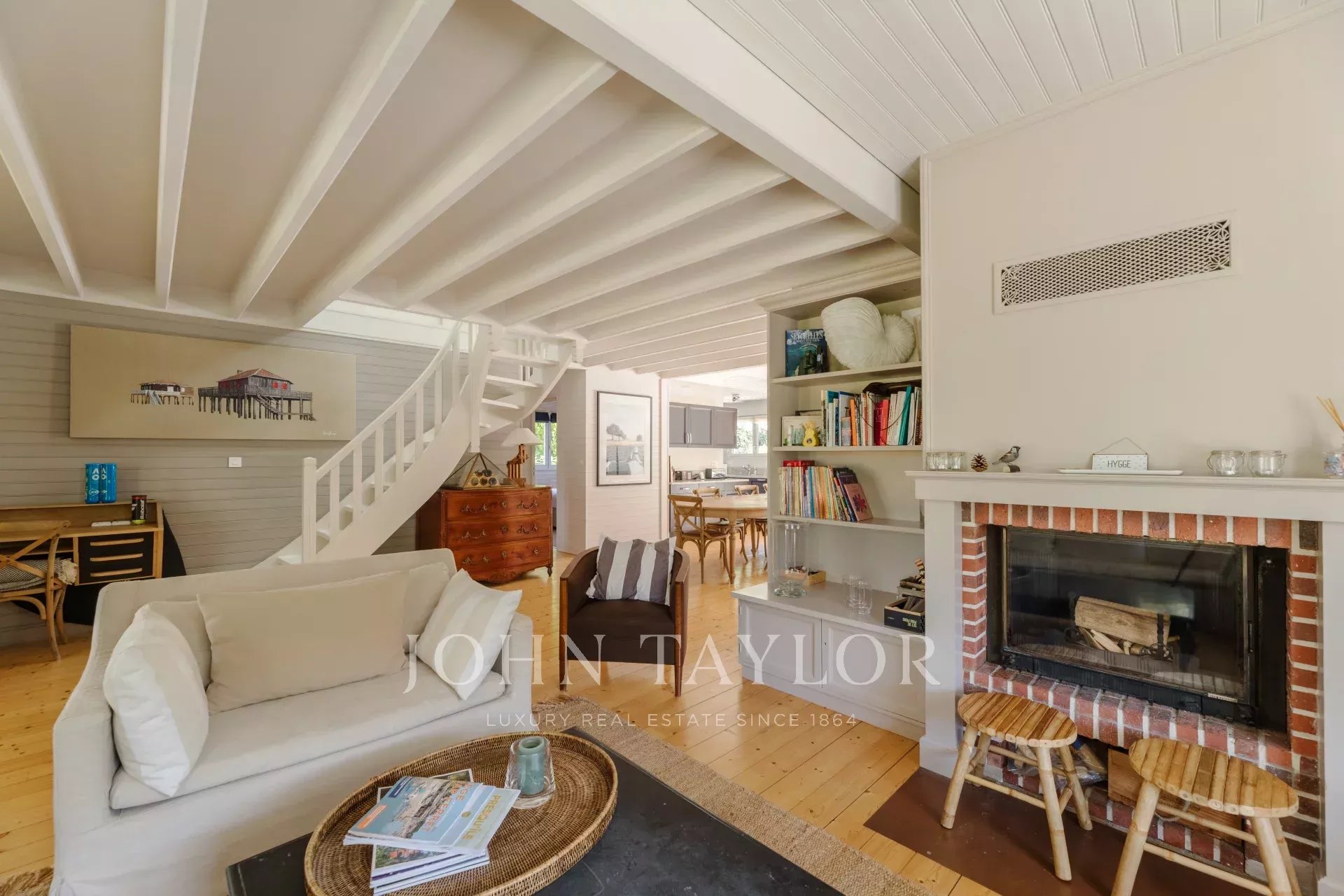 Erected overlooking the famous Dune du Canon, this charming wooden residence with white roof boards offers a vast living room with fireplace and French-style ceiling, opening onto a chic and functional high-end kitchen.