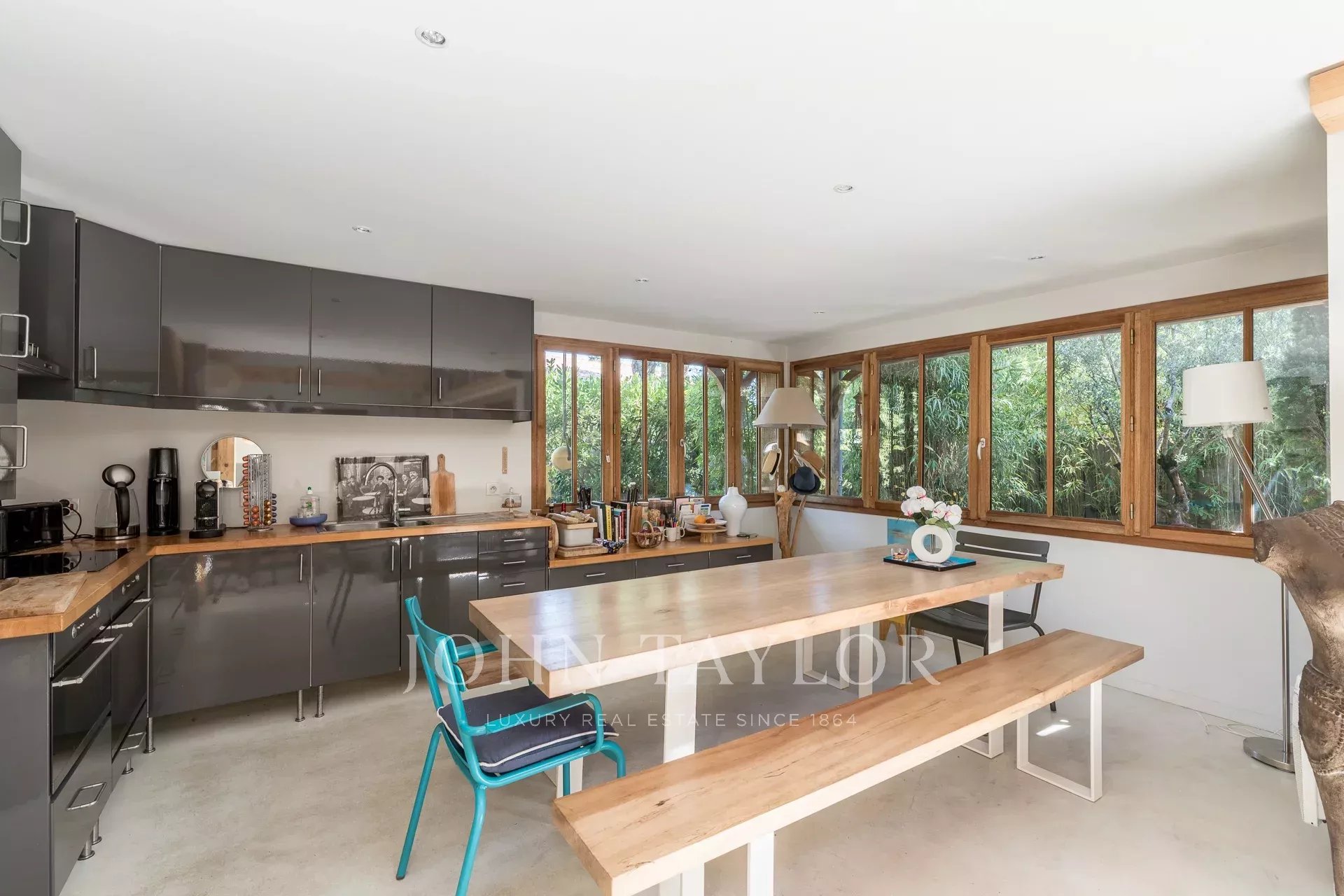 Outside, a pleasant partially covered terrace allows you to enjoy the sun throughout the day. The property sits on a beautifully landscaped and tree-filled plot of around 500 m², with the potential to add a swimming pool.