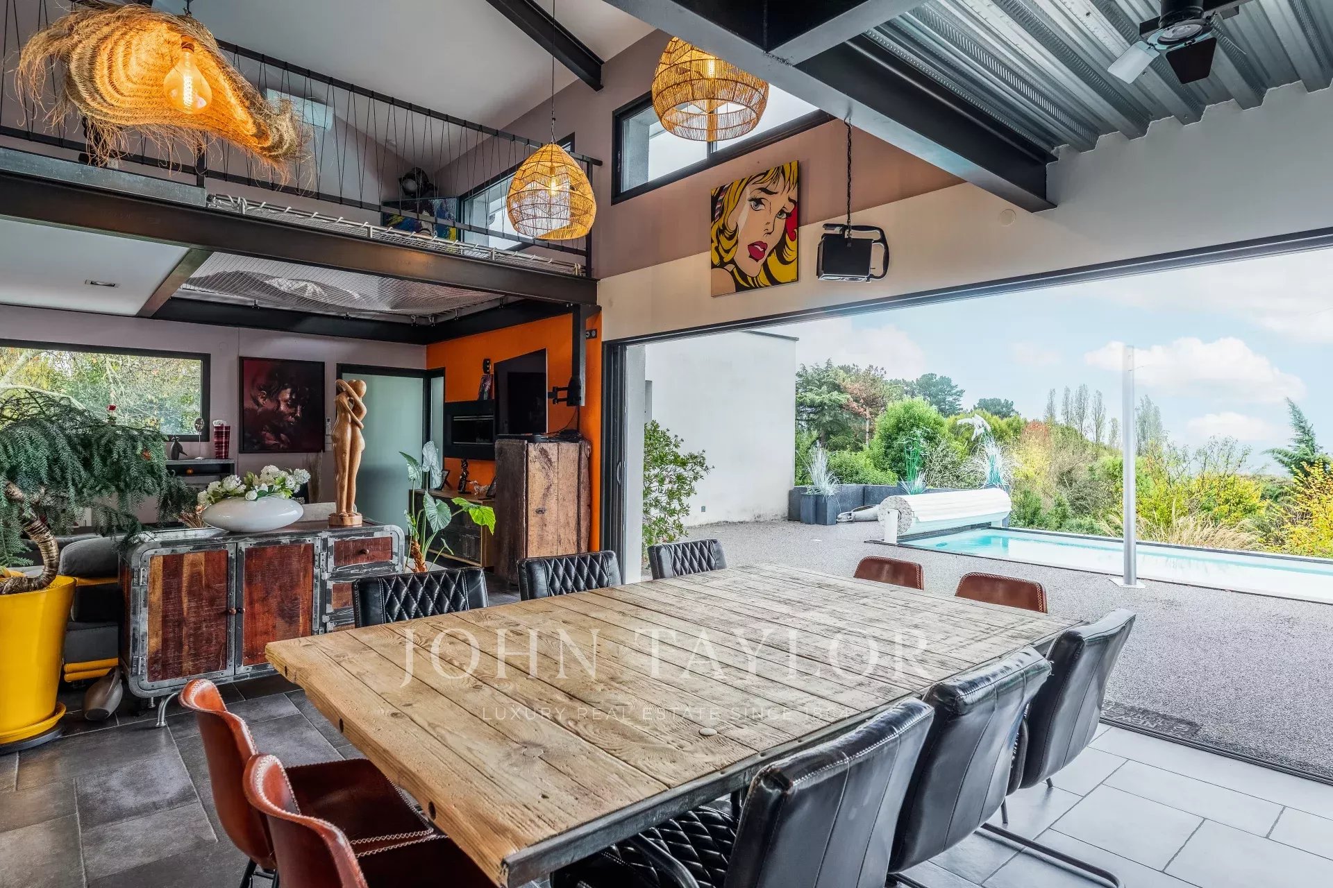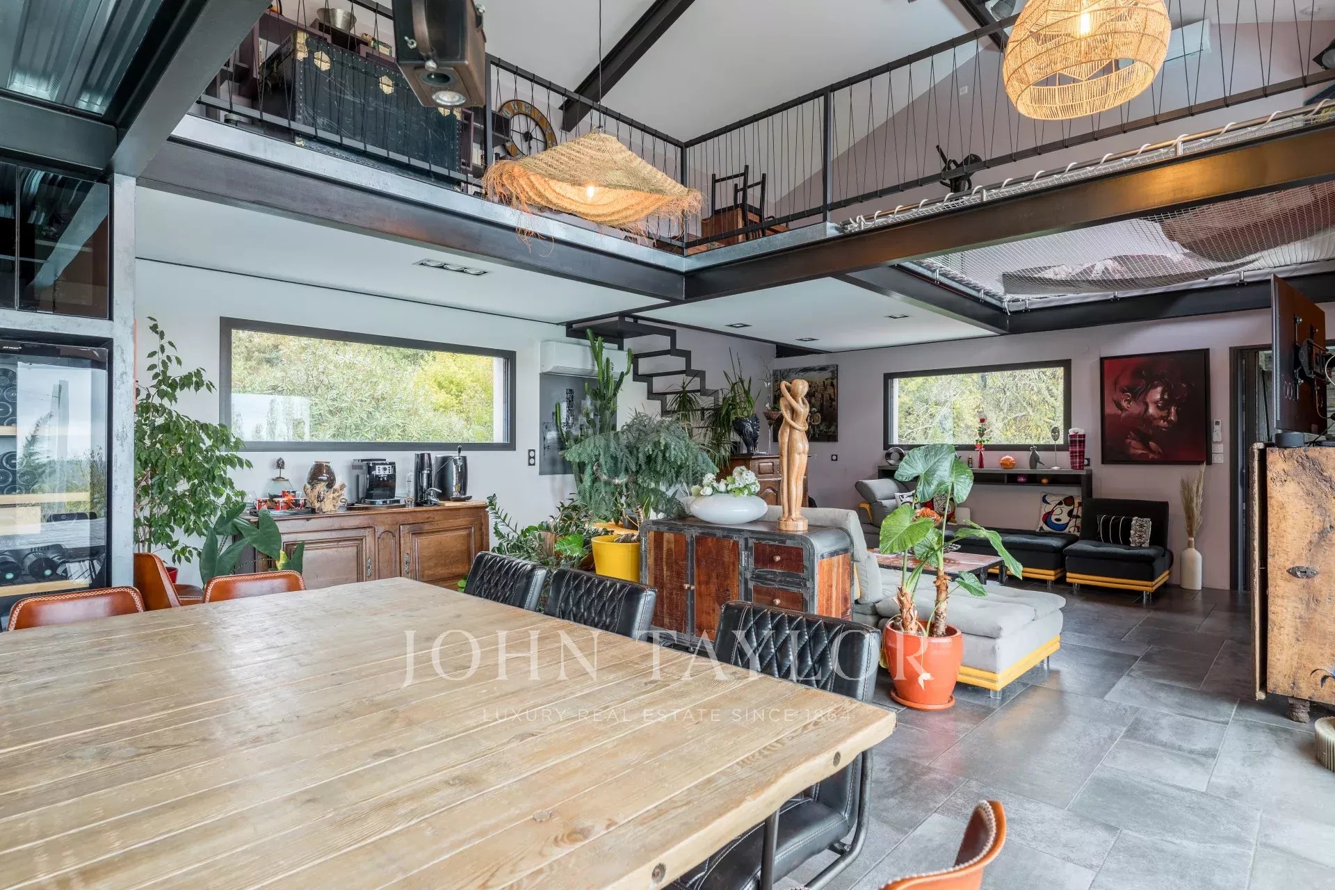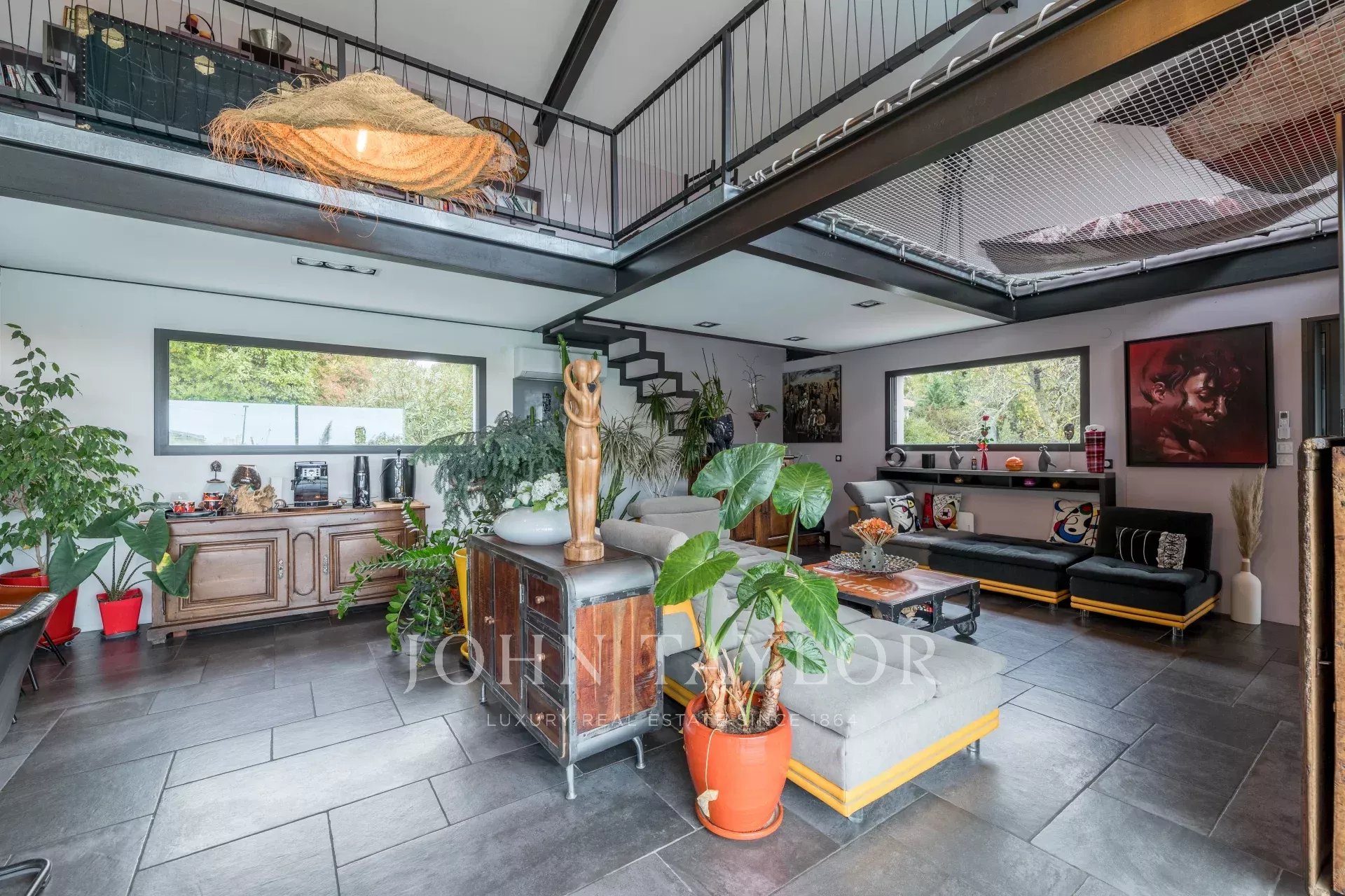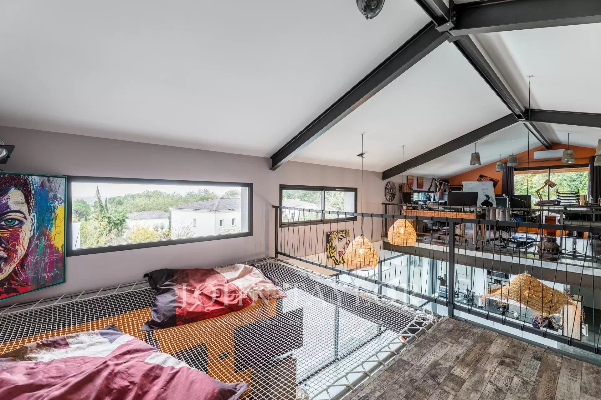 Also on the ground floor, a master suite, a true peaceful haven, includes a shower room, separate toilet, and a jacuzzi, perfect for intimate relaxation. On the opposite side, two additional bedrooms share a shower room and separate toilet. Overlooking the living area, a mezzanine offers numerous possibilities for customization, whether for additional bedrooms or a leisure space. This level is completed by a suspended net, an original feature that adds real charm to this unique space.