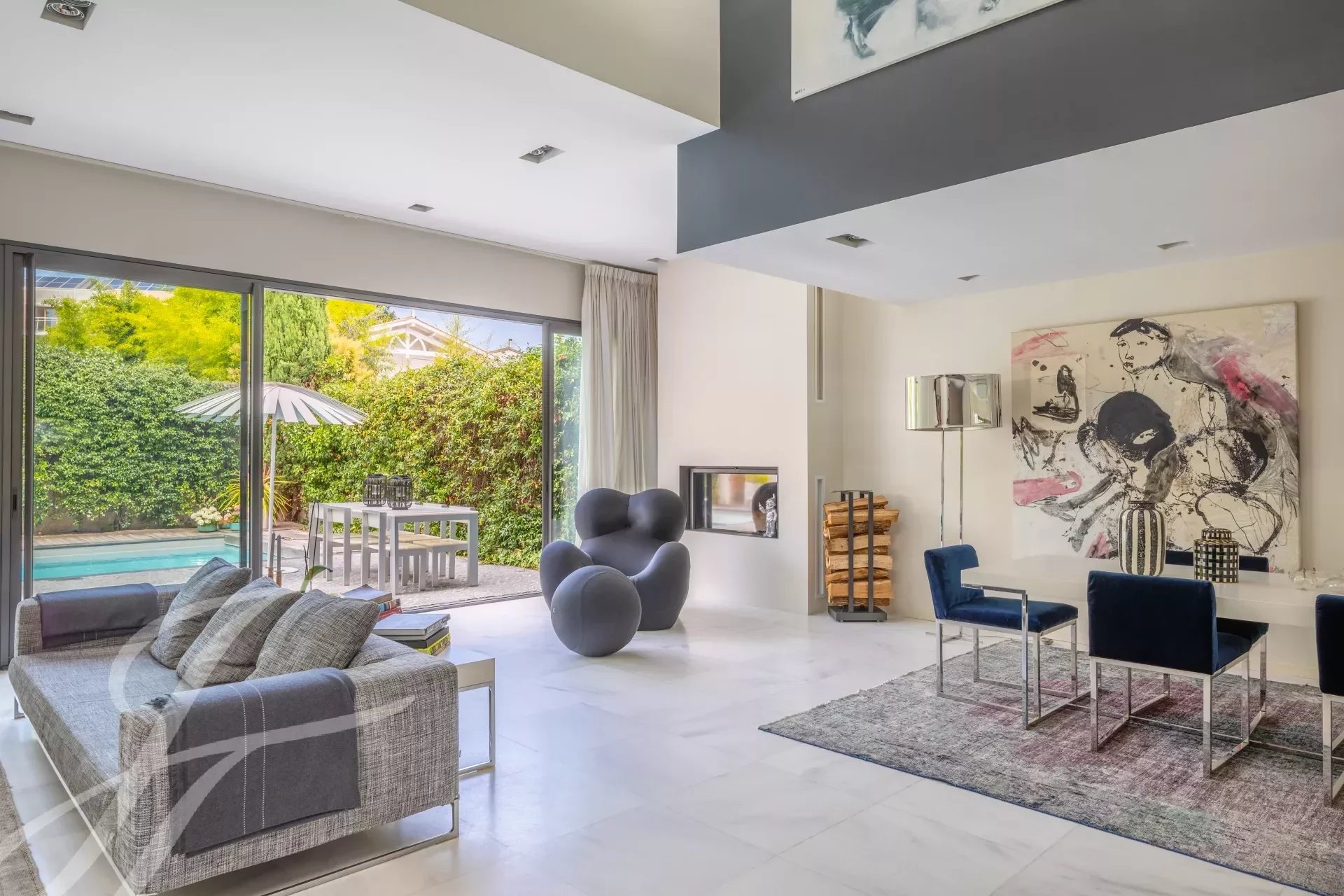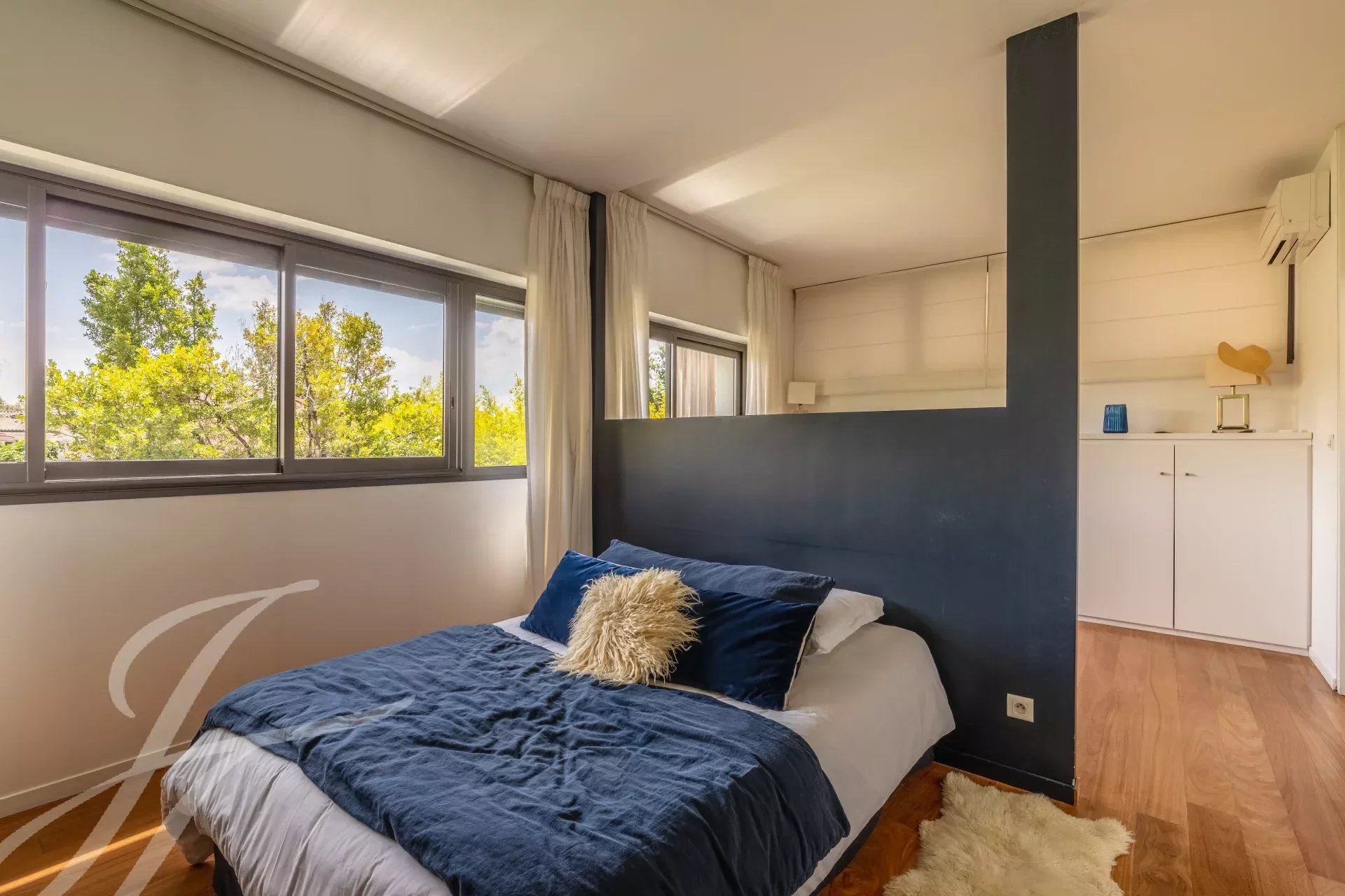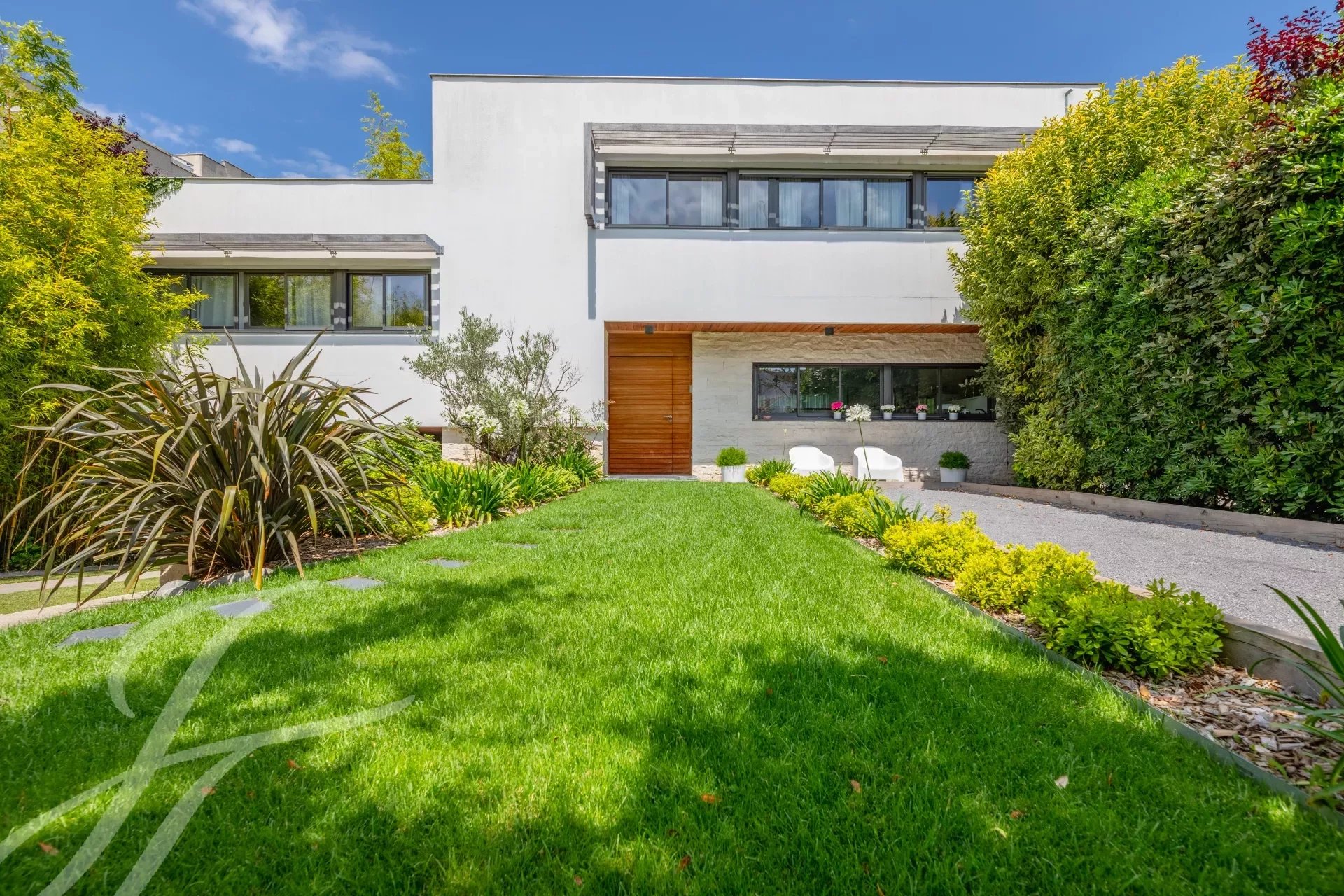The interior, the result of a subtle marriage of elegance and sobriety, blends noble materials such as marble and wood, and seduces us with its striking volumes, such as the vast 90 m2 living room. A large fitted kitchen completes the first level. The cathedral living room offers an incredible view of the upper floor, where the sleeping quarters feature 4 bedrooms and a generous master suite. The latter boasts a beautiful dressing area, where quality joinery has been custom-designed. An office, a bathroom, 2 shower rooms and a play or reading area add to everyday comfort. Last but not least, the parcel of land provides comfortable, sheltered parking for vehicles. A rare property, as much for its features as for its address.