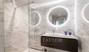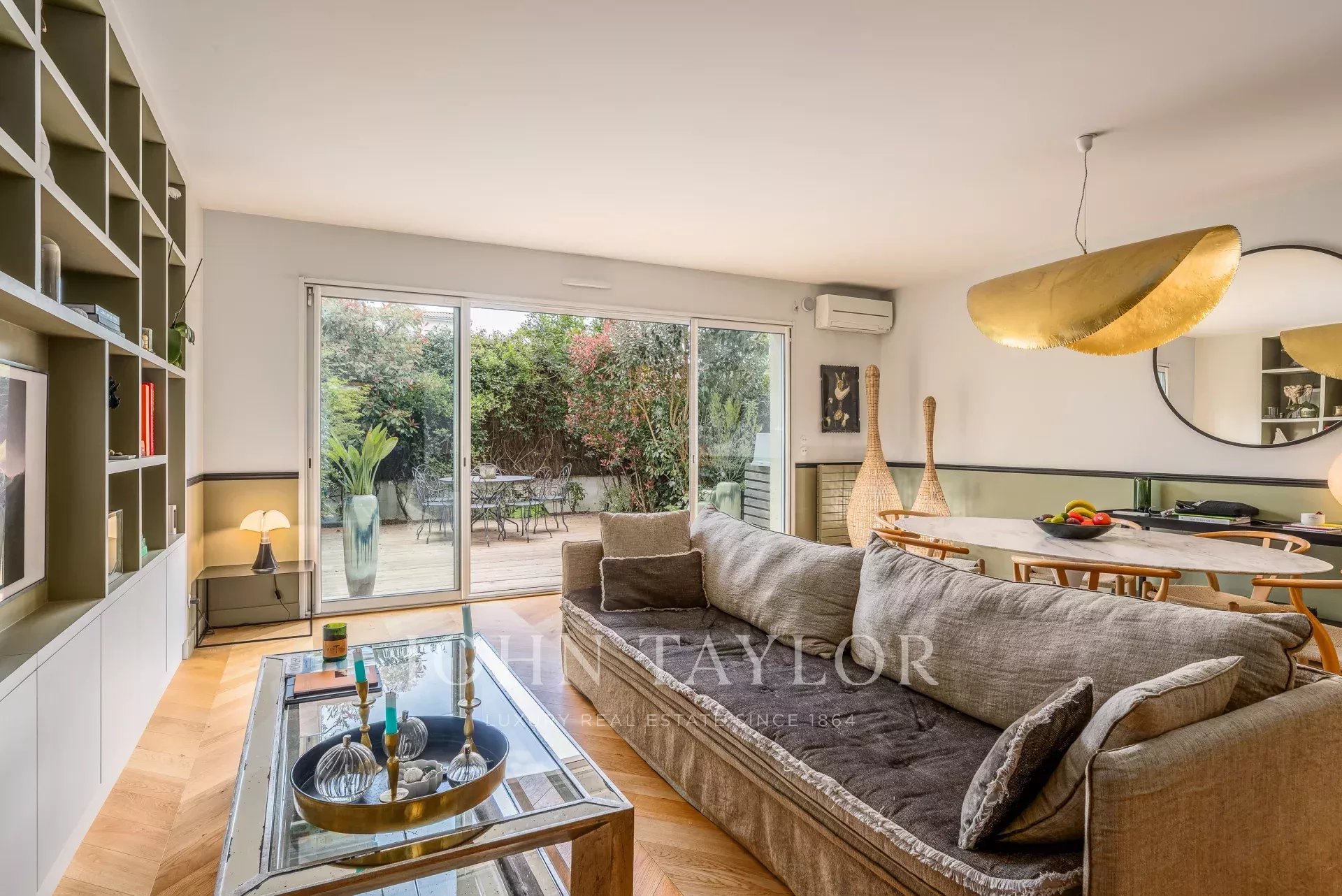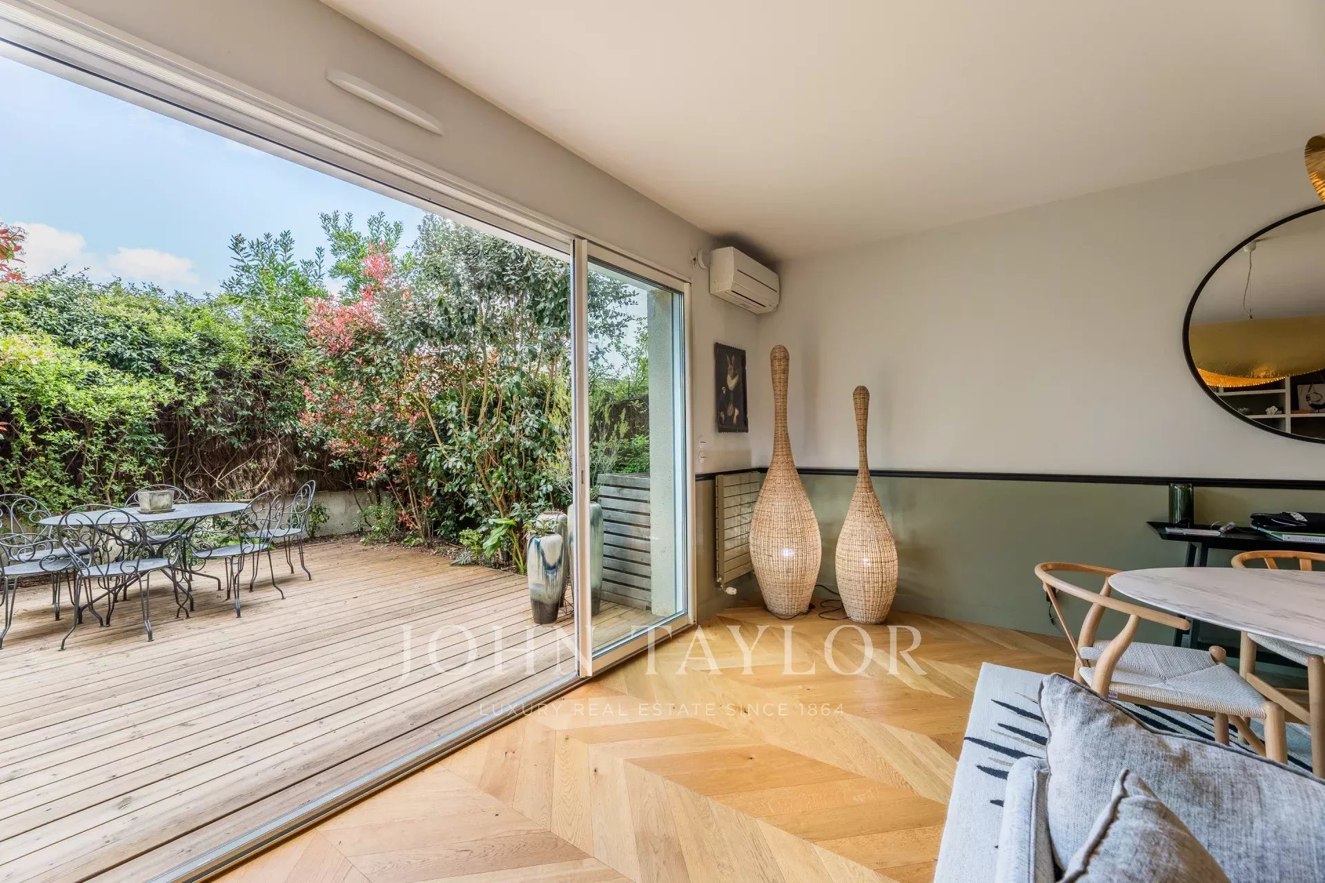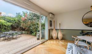 Fully renovated three years ago, the property offers a contemporary lifestyle, enhanced by high-end finishes and a rare selection of refined materials. From the moment you enter, the eye is drawn to the natural light and generous volumes of the living area, which opens seamlessly onto an intimate garden of approximately 50 m². The open-plan living and fitted kitchen area spans over 50 m², where Patagonian stone, clean lines, and bespoke furnishings create a harmonious dialogue with the surrounding light.