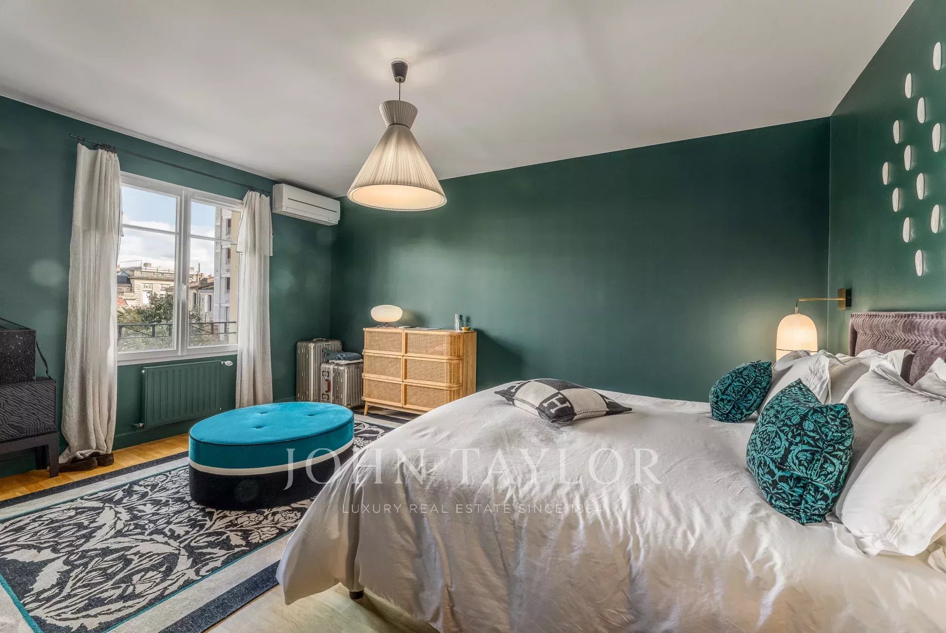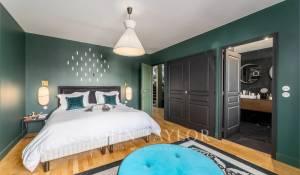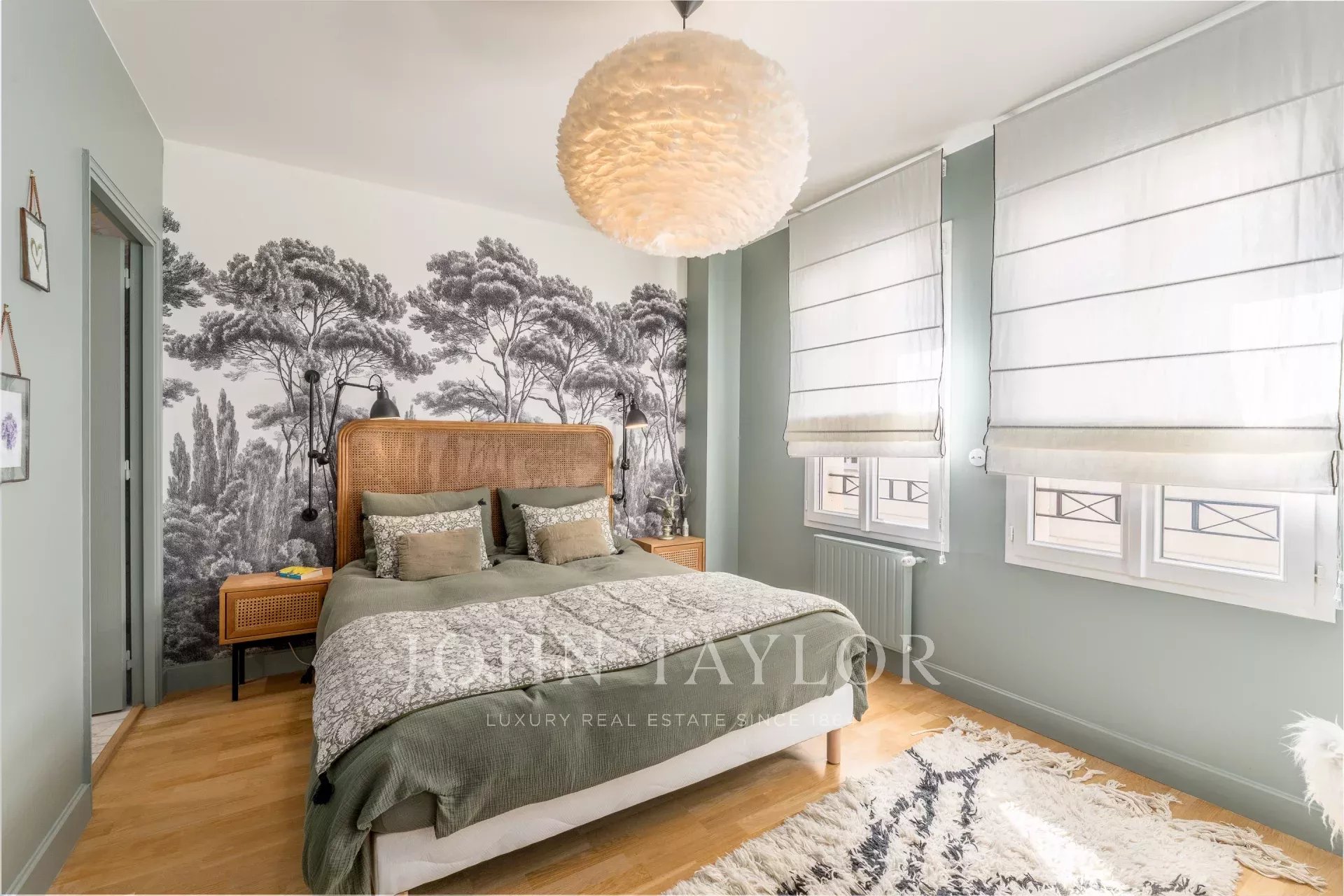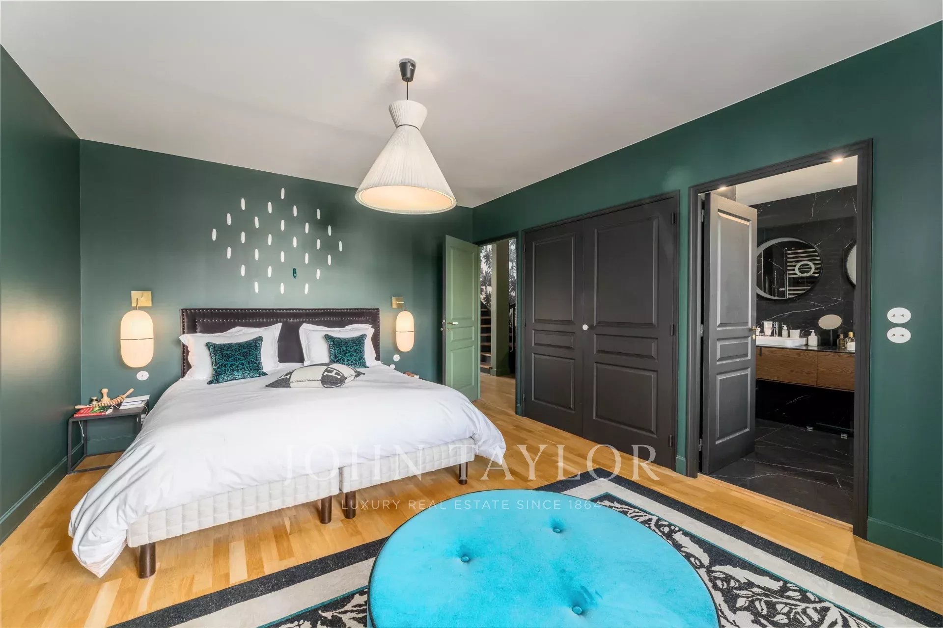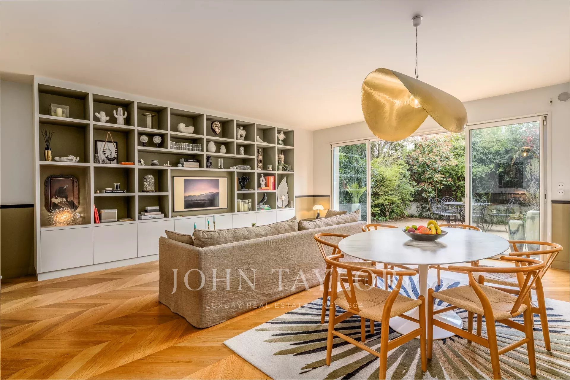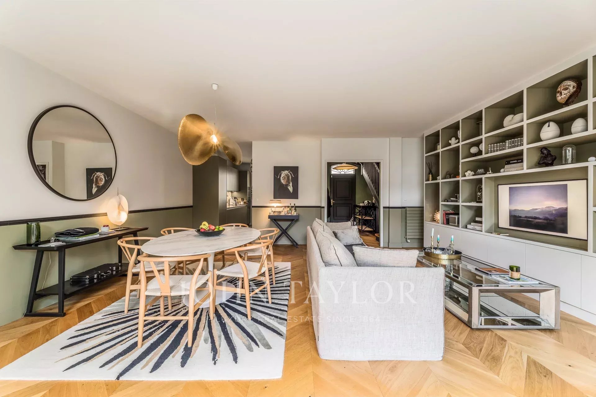 Every detail has been carefully considered: Pierre Frey wallpapers, herringbone parquet flooring, premium materials, and a custom-designed library contribute to a warm, sophisticated, and distinctly chic atmosphere.