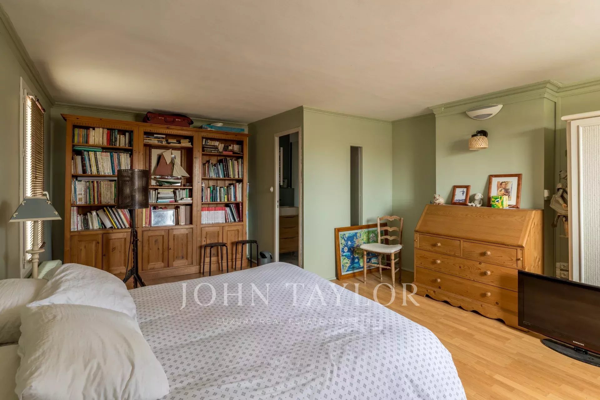 Preserved period features: stone facade, fireplaces, parquet flooring, cement tiles, moldings, wall cornices and stained glass windows. Absolute calm and ideal layout for family life.