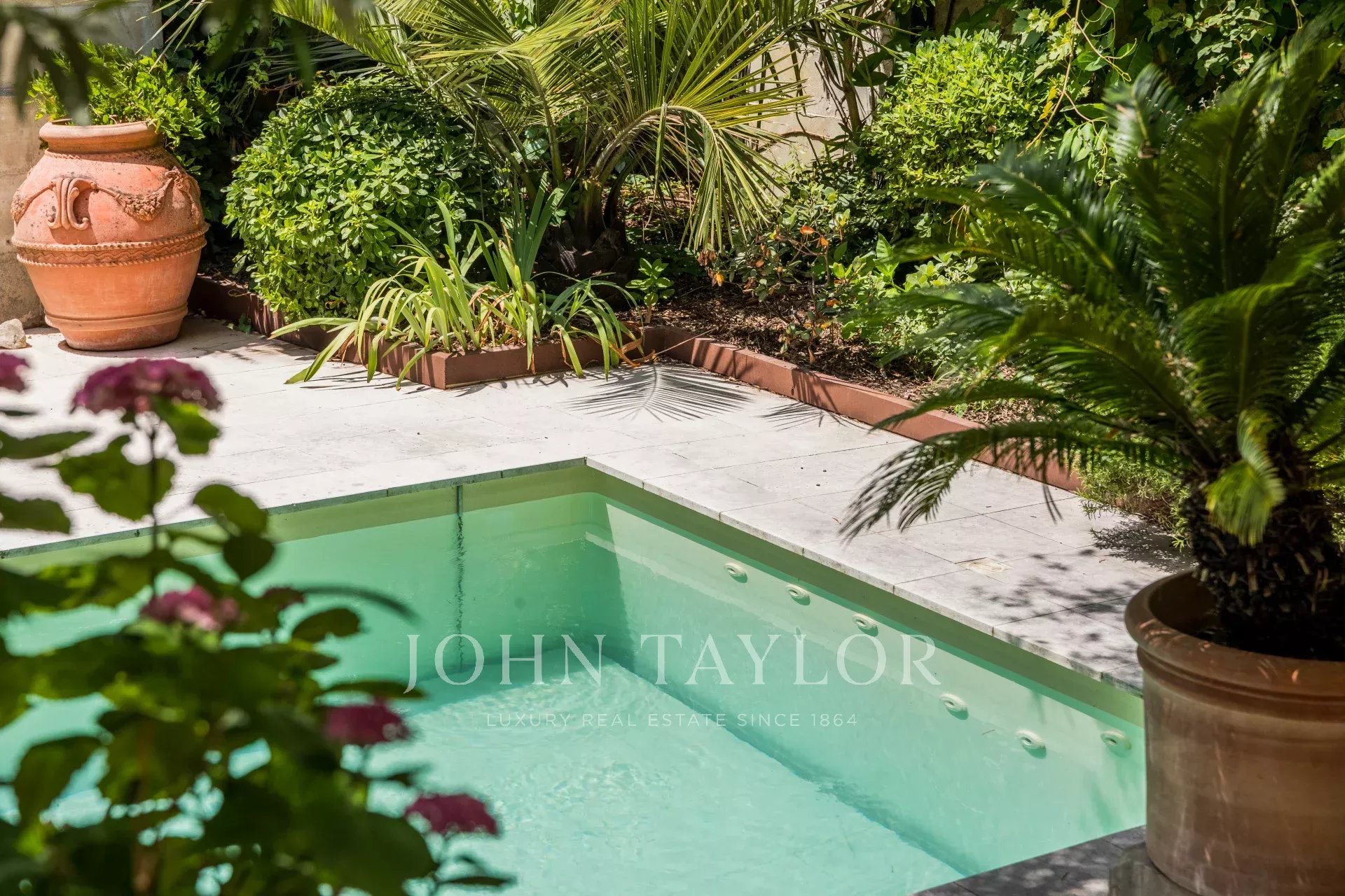 Close to Place Pey Berland, hidden away in a discreet pedestrian street, sumptuous three-storey townhouse with swimming pool with movable floor, 150 m² garden planted with trees, 95 m² basement and double garage.