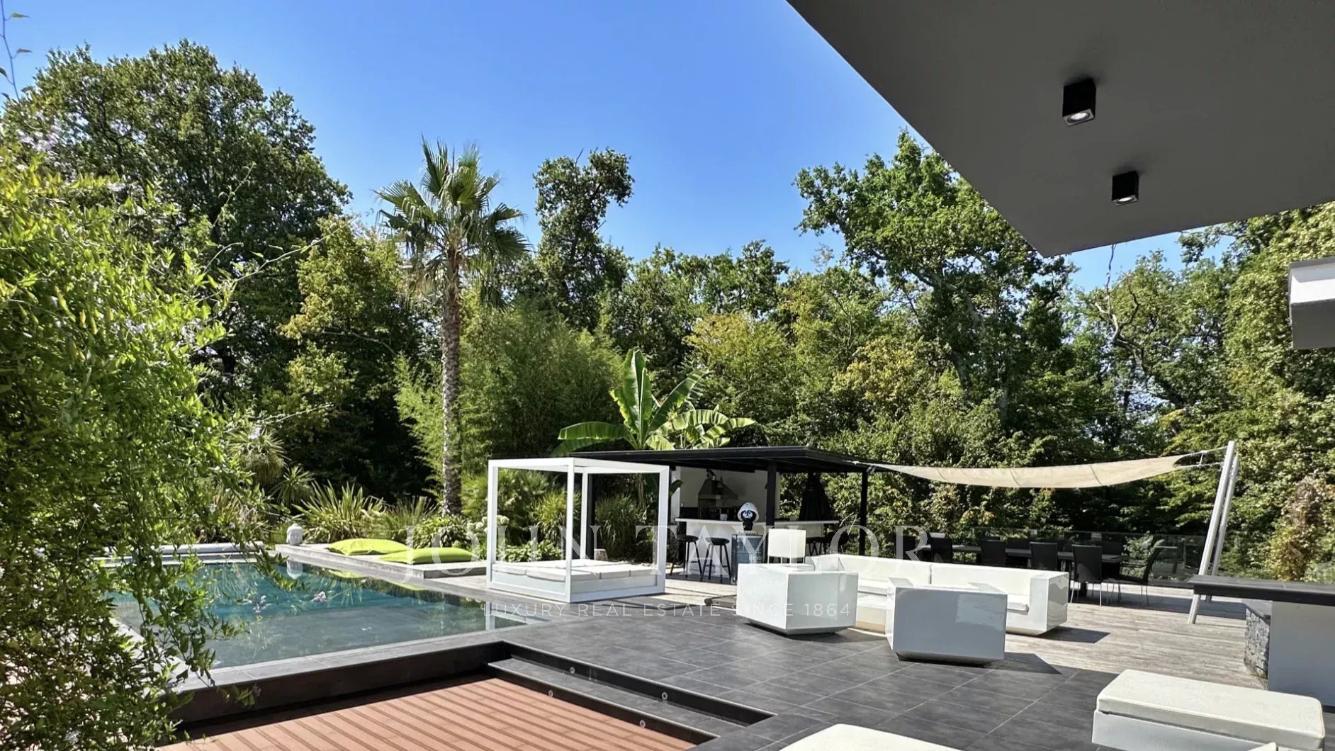 The exteriors are just as grand as the villa: a vast terrace with summer kitchen, a pétanque court and a superb 11 x 4 m heated mirror pool, overlooking the forest and offering moments of relaxation in total privacy.
