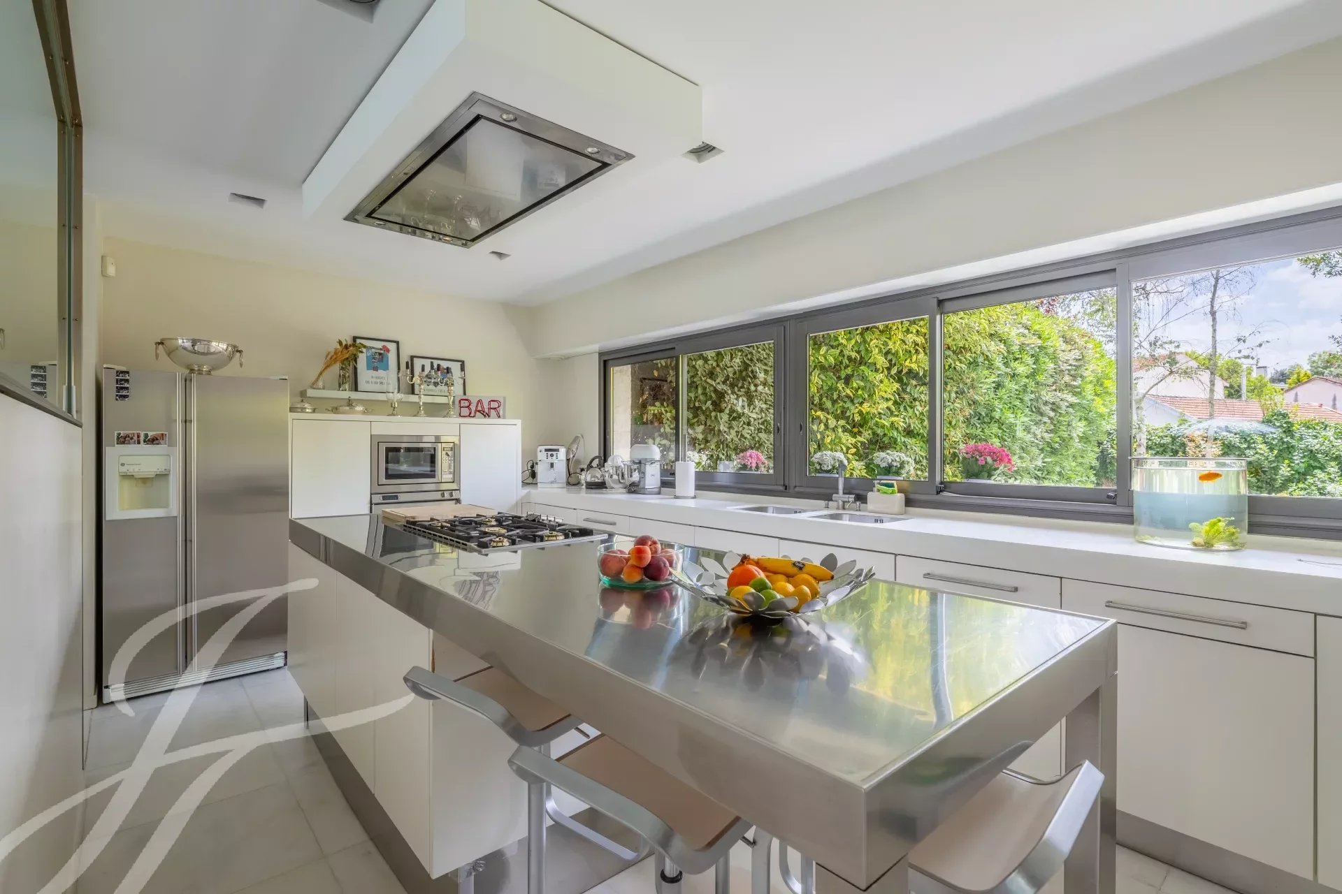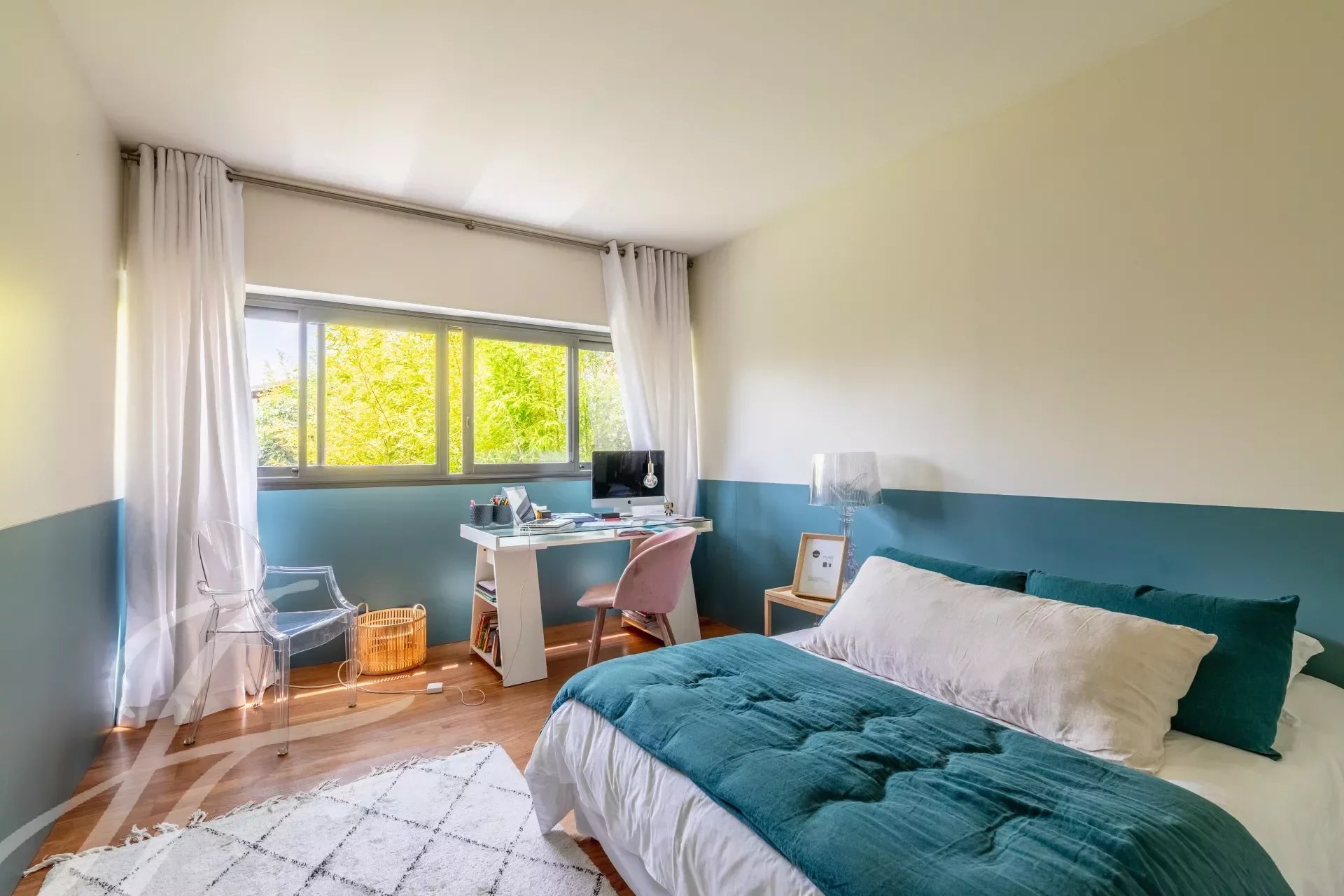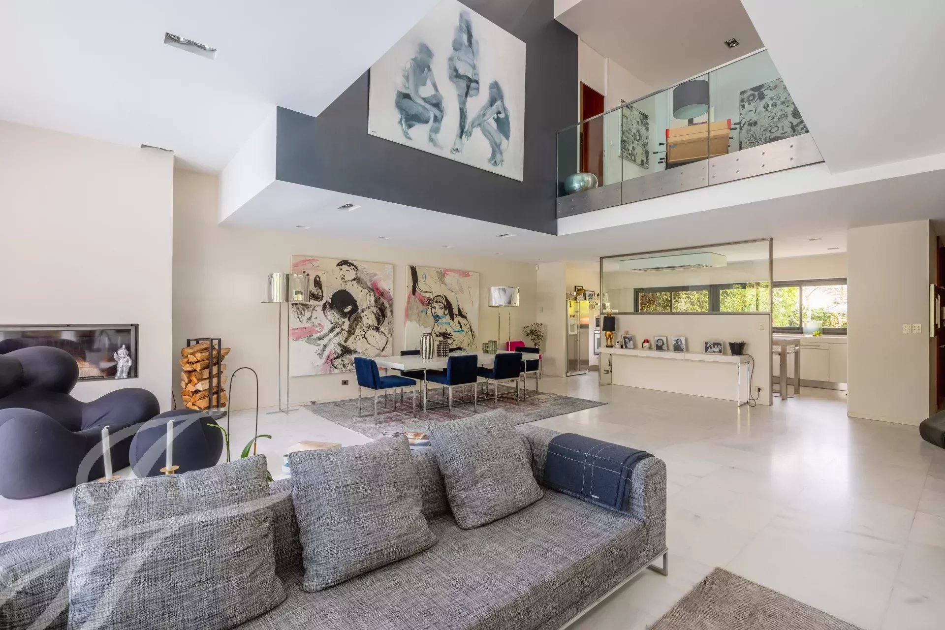 The interior, the result of a subtle marriage of elegance and sobriety, blends noble materials such as marble and wood, and seduces us with its striking volumes, such as the vast 90 m2 living room. A large fitted kitchen completes the first level. The cathedral living room offers an incredible view of the upper floor, where the sleeping quarters feature 4 bedrooms and a generous master suite. The latter boasts a beautiful dressing area, where quality joinery has been custom-designed. An office, a bathroom, 2 shower rooms and a play or reading area add to everyday comfort. Last but not least, the parcel of land provides comfortable, sheltered parking for vehicles. A rare property, as much for its features as for its address.
