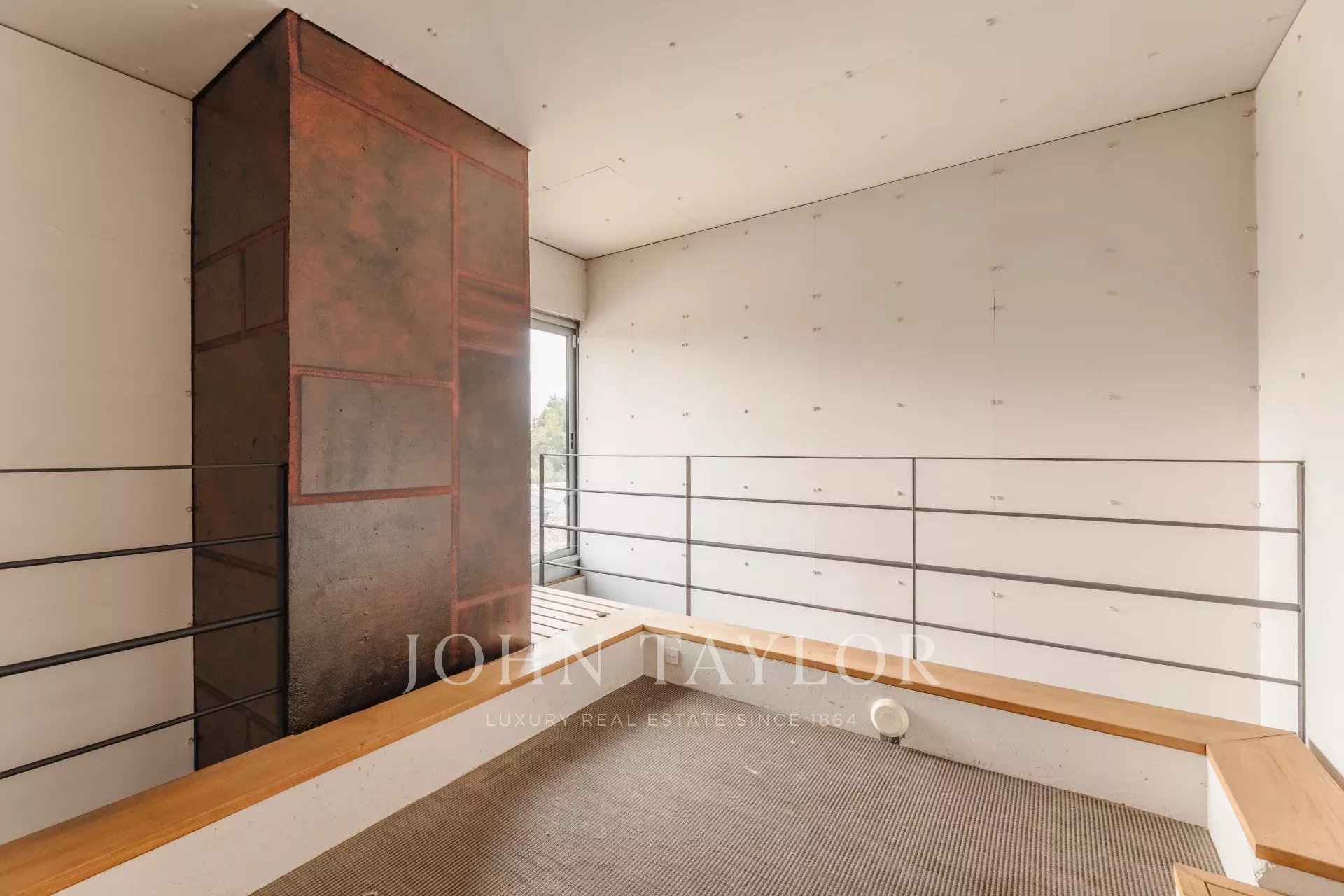 Upstairs, a mezzanine houses an inspiring office and library area, offering a tranquil space to stimulate creativity and productivity.