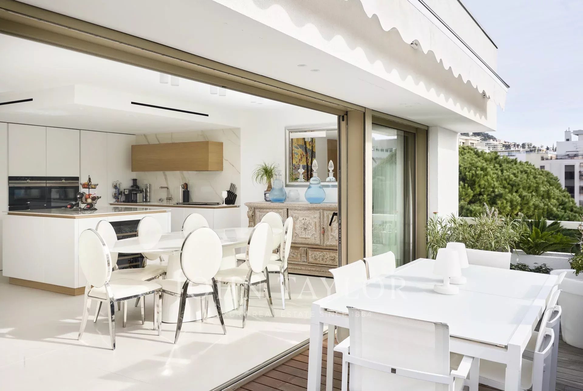 an attractive reception room with lounge, dining area and fitted kitchen opening onto the terrace