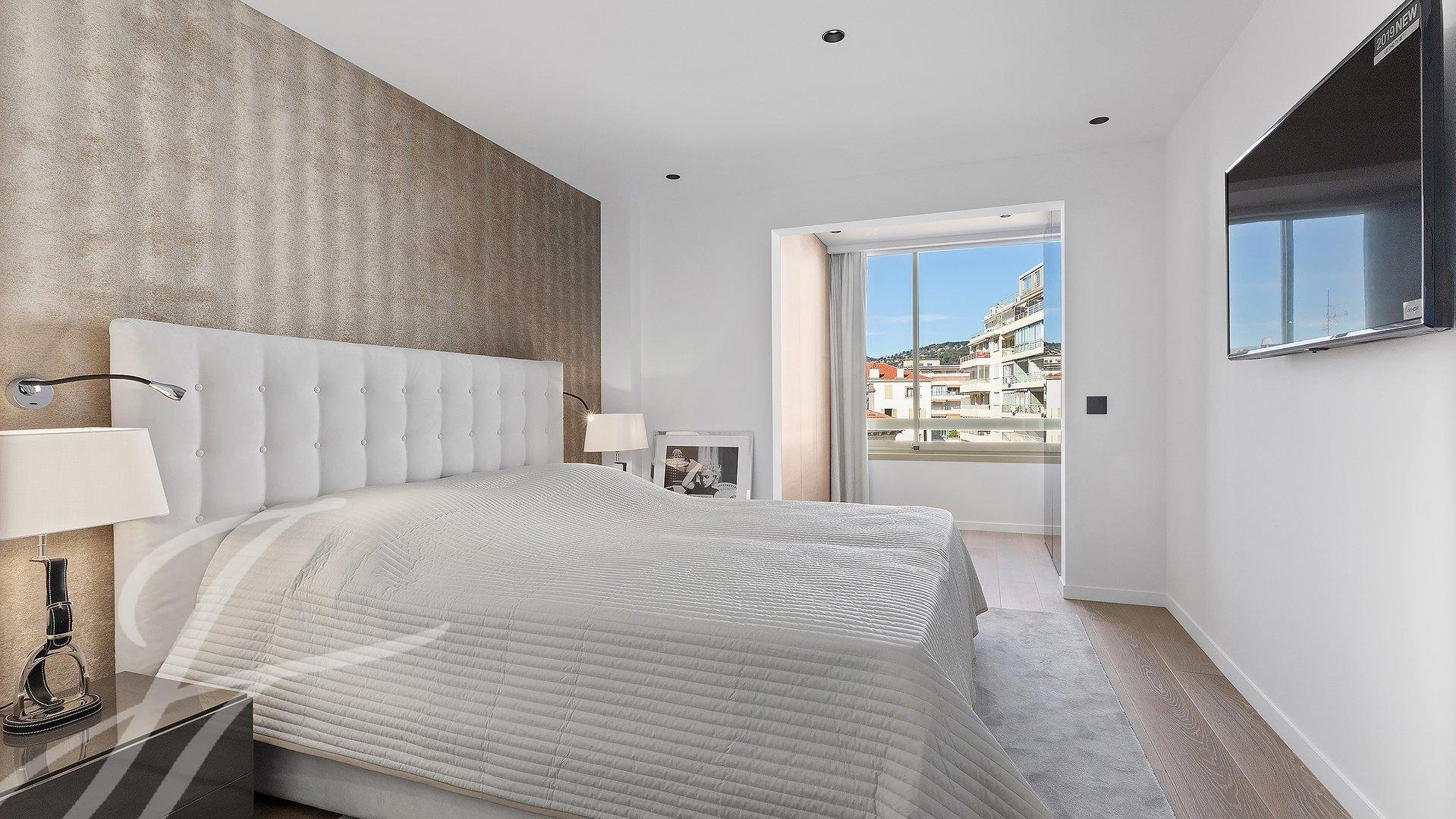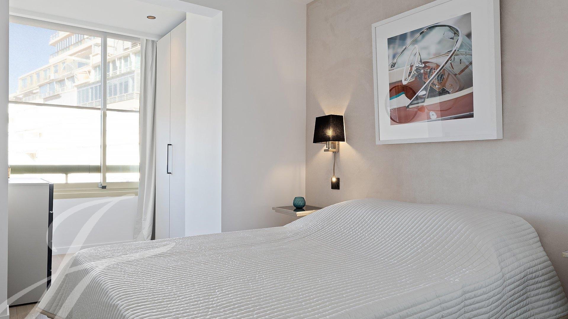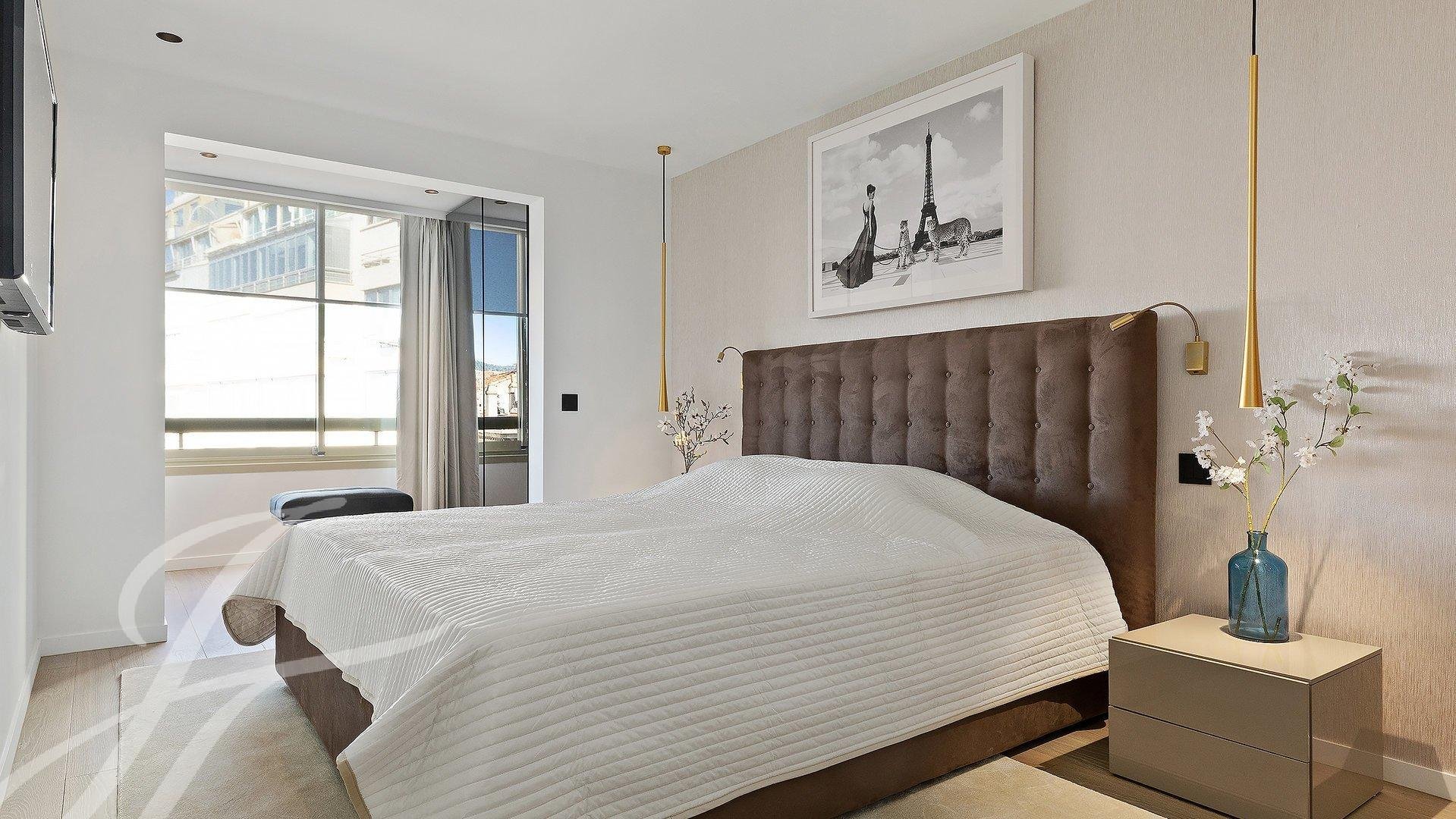 Attractive air-conditioned apartment located in the heart of the Croisette on the 5th floor of a luxury residence, enjoying a magnificent panoramic view of the Bay of Cannes, its beaches, the Palace of Festivals and the Esterel.