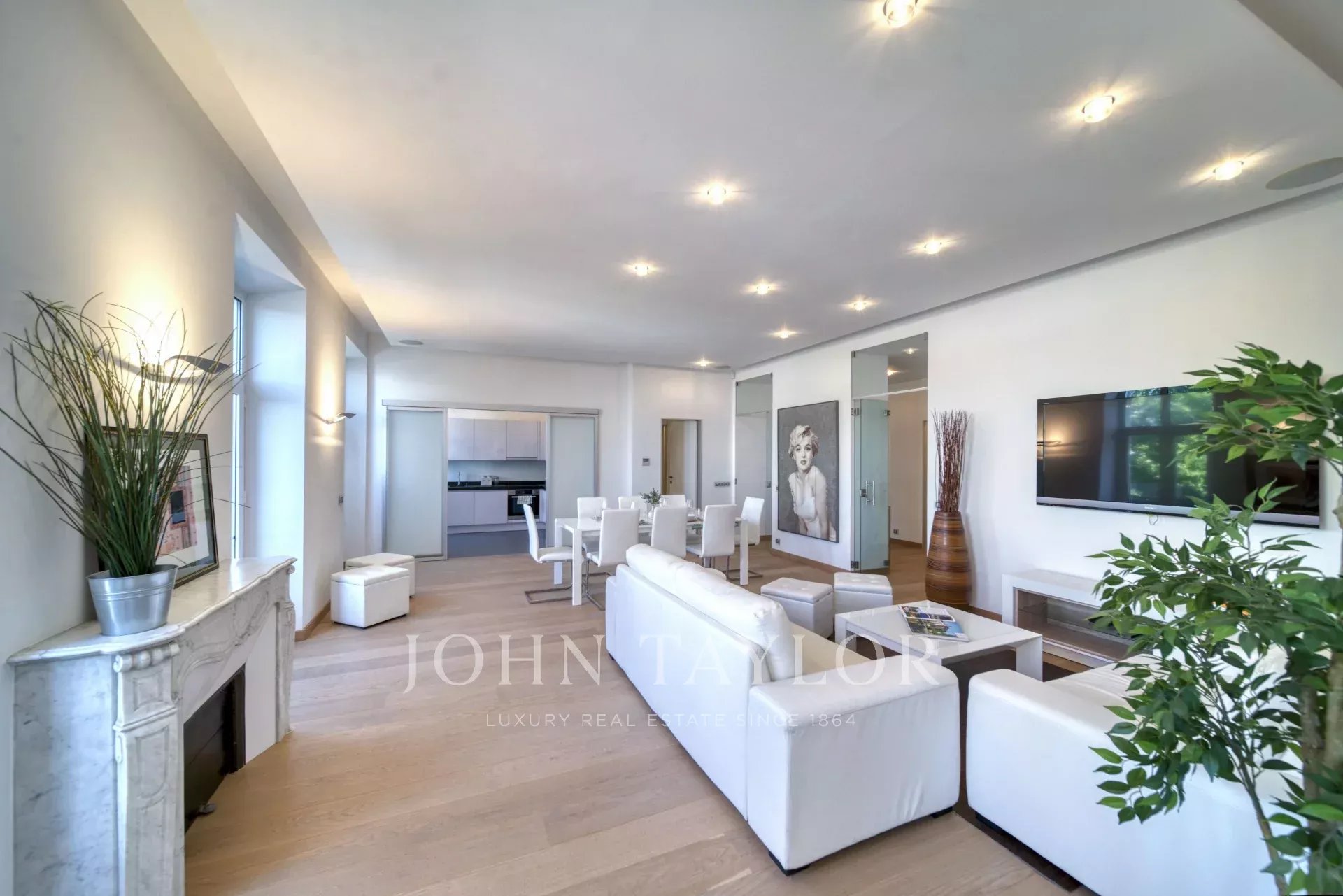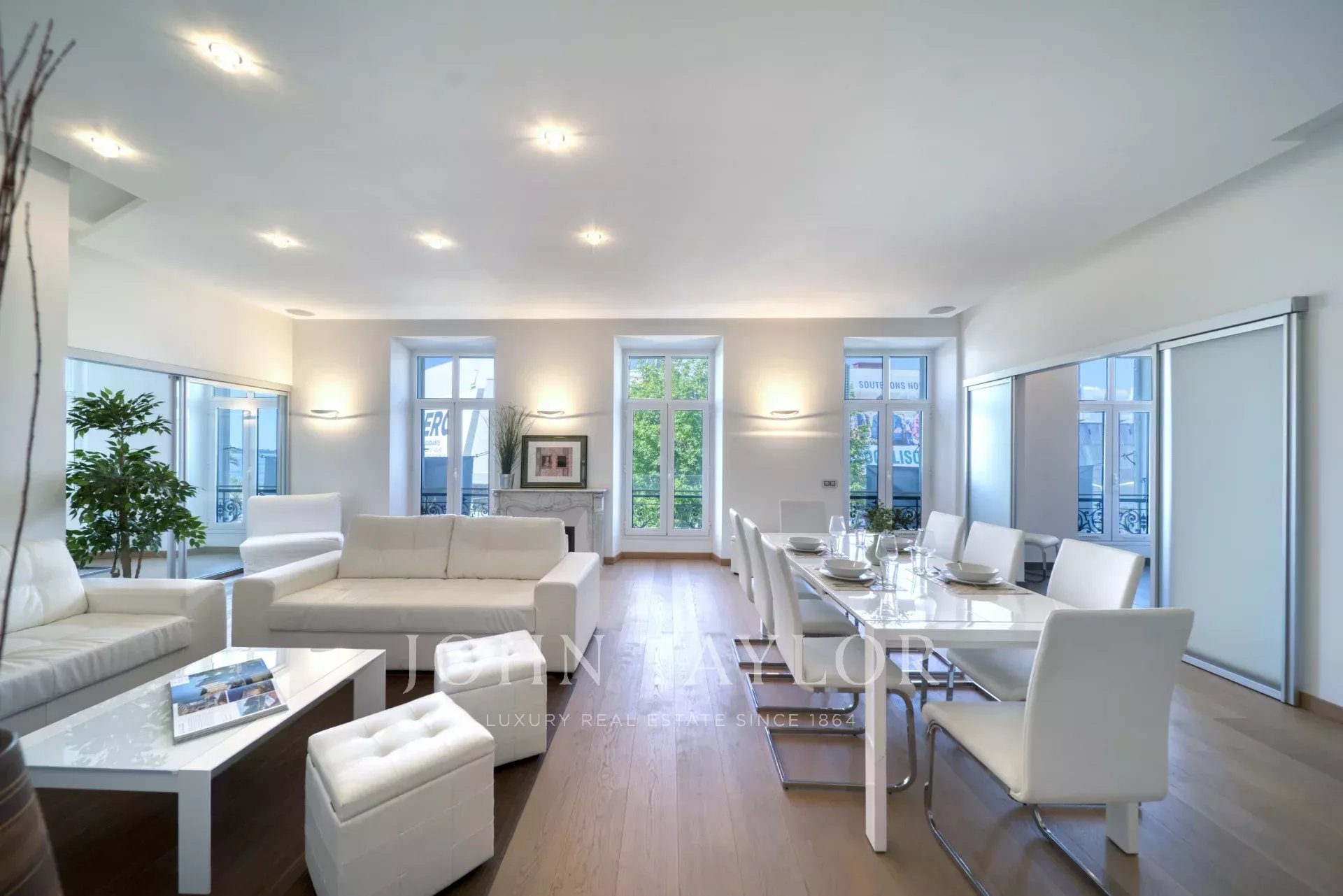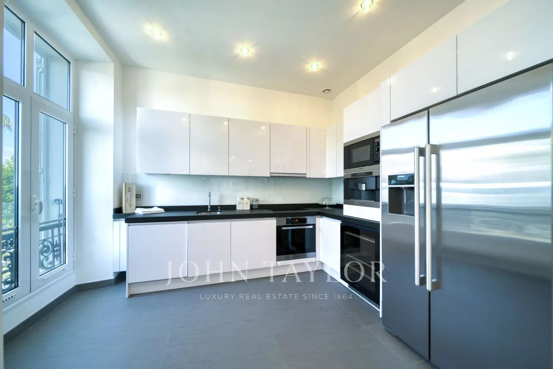 On the 2nd floor of a bourgeois-style building, facing the Palais des Festivals and the Croisette beaches, close to the rue d'Antibes, the "marché Forville" and the old town of Cannes "Le Suquet", contemporary apartment entirely renovated and air-conditioned offering 141 sq.m living space as follows :