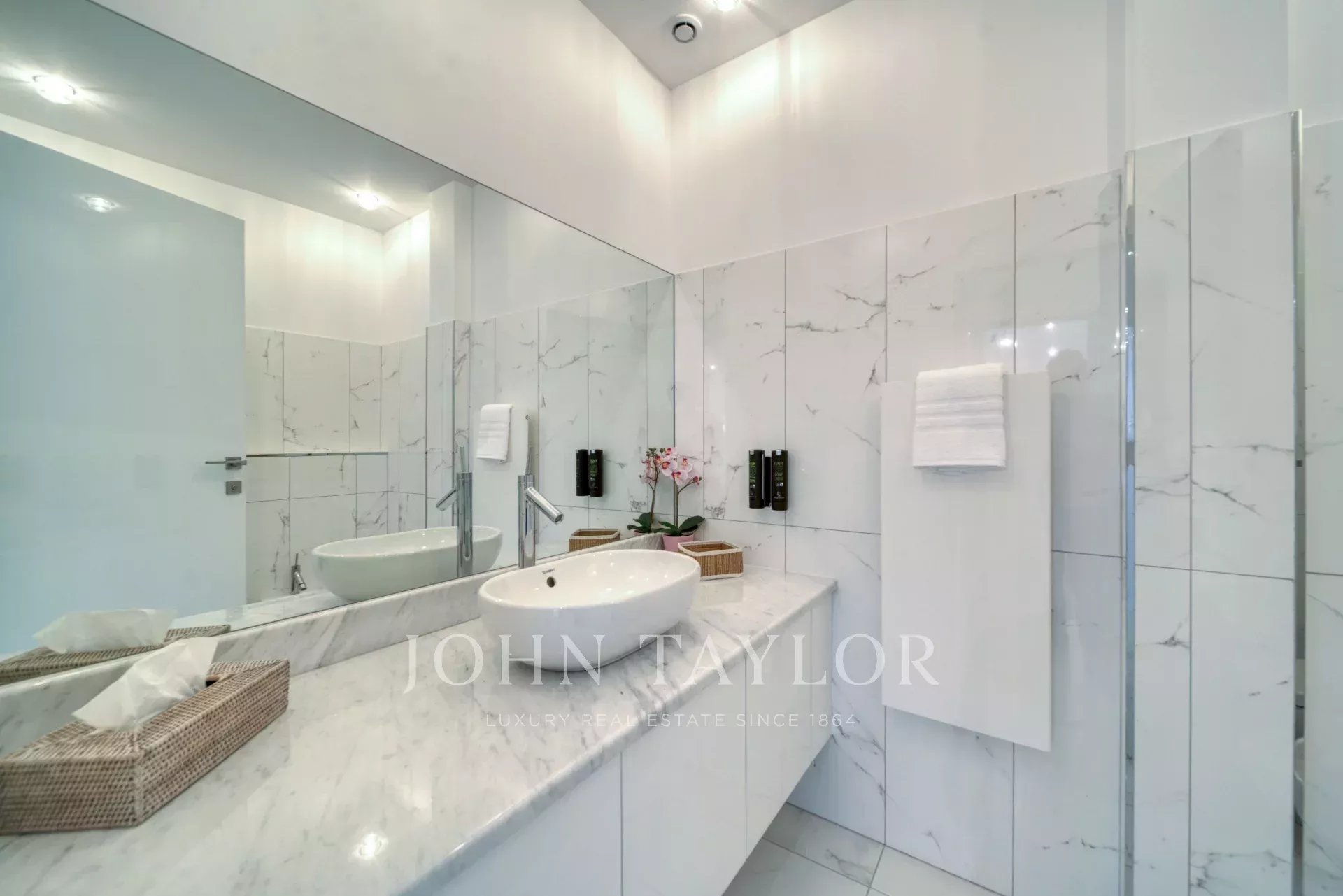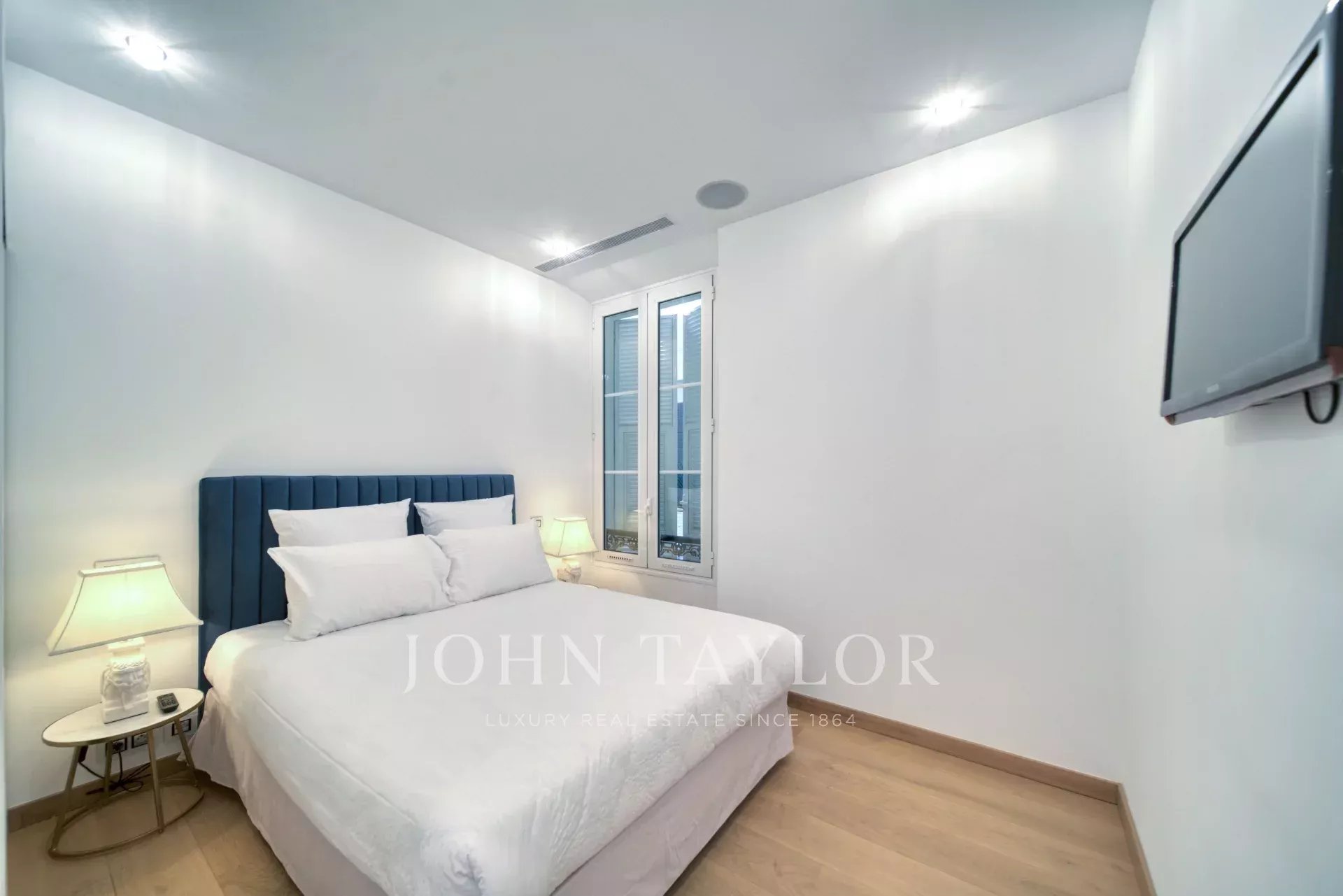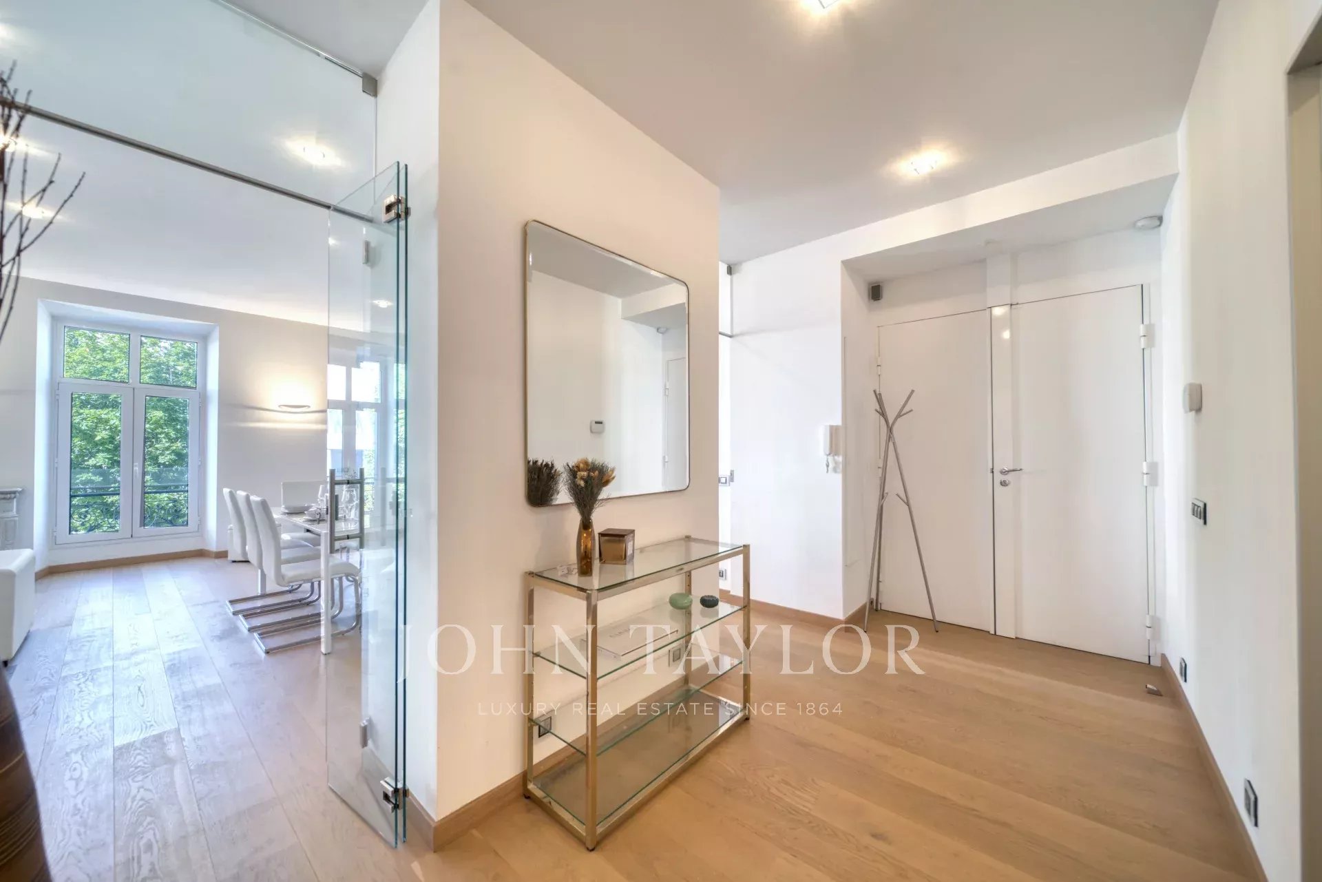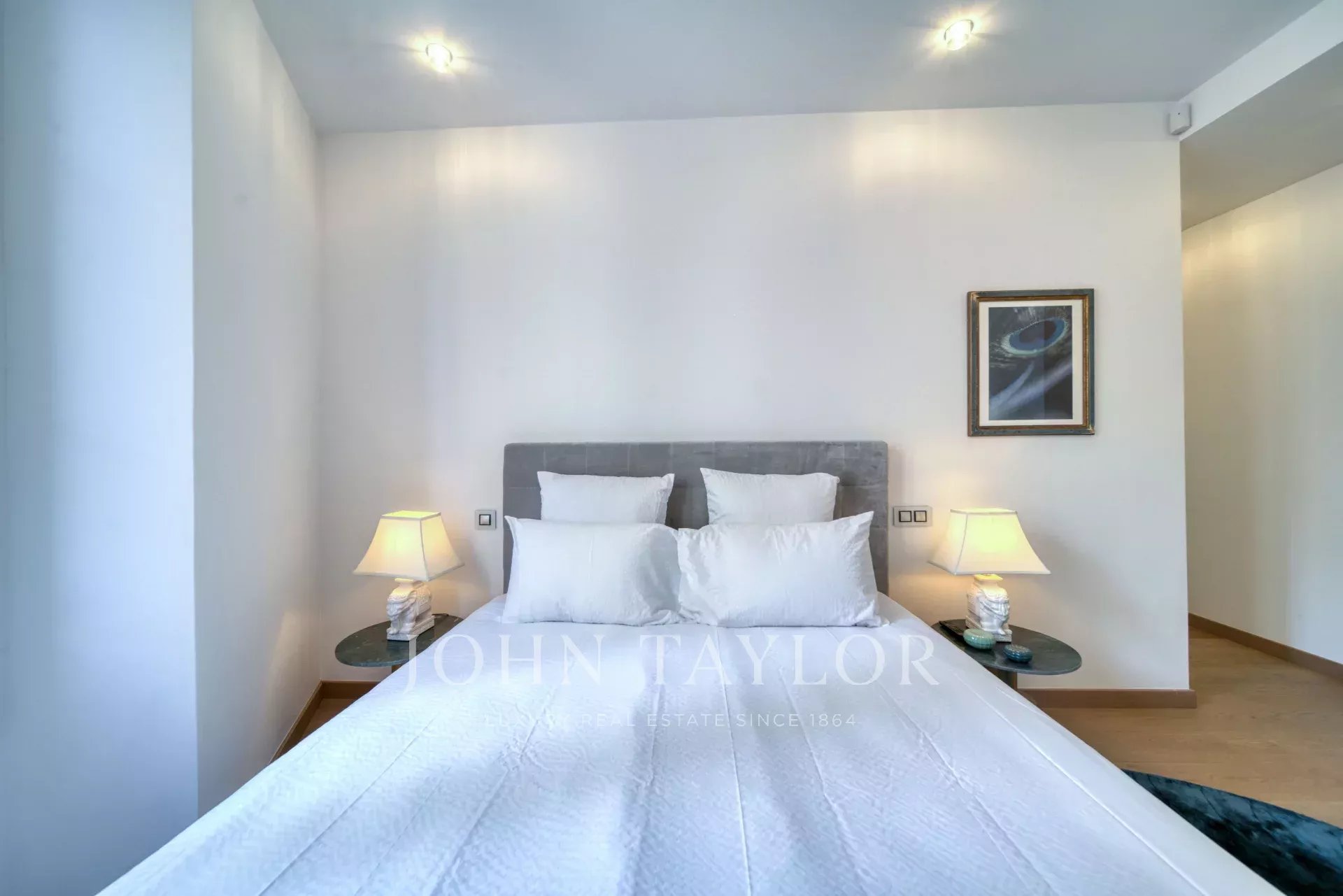 On the 2nd floor of a bourgeois-style building, facing the Palais des Festivals and the Croisette beaches, close to the rue d'Antibes, the "marché Forville" and the old town of Cannes "Le Suquet", contemporary apartment entirely renovated and air-conditioned offering 141 sq.m living space as follows :
