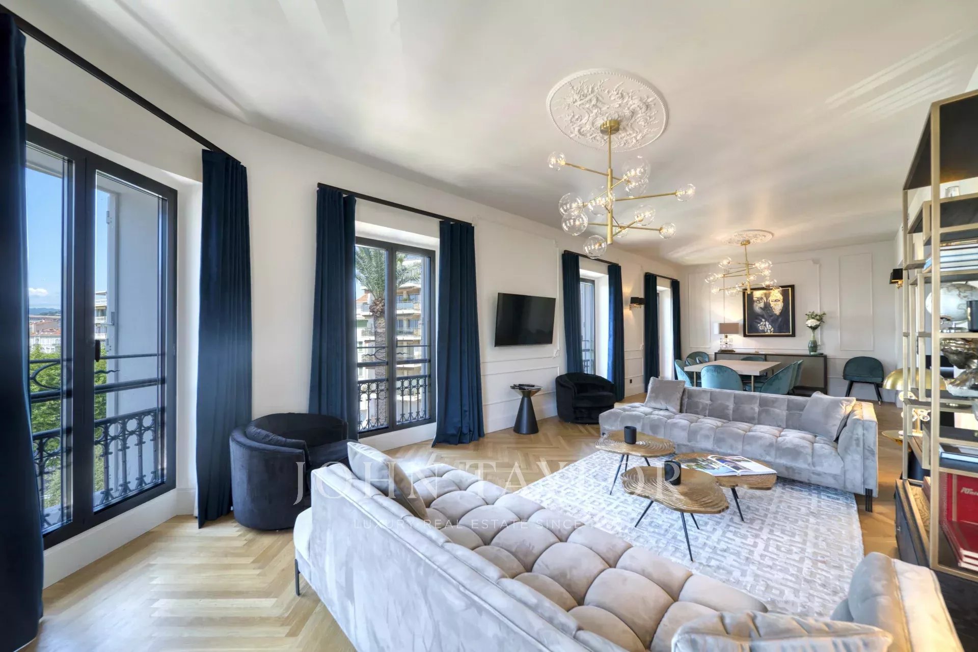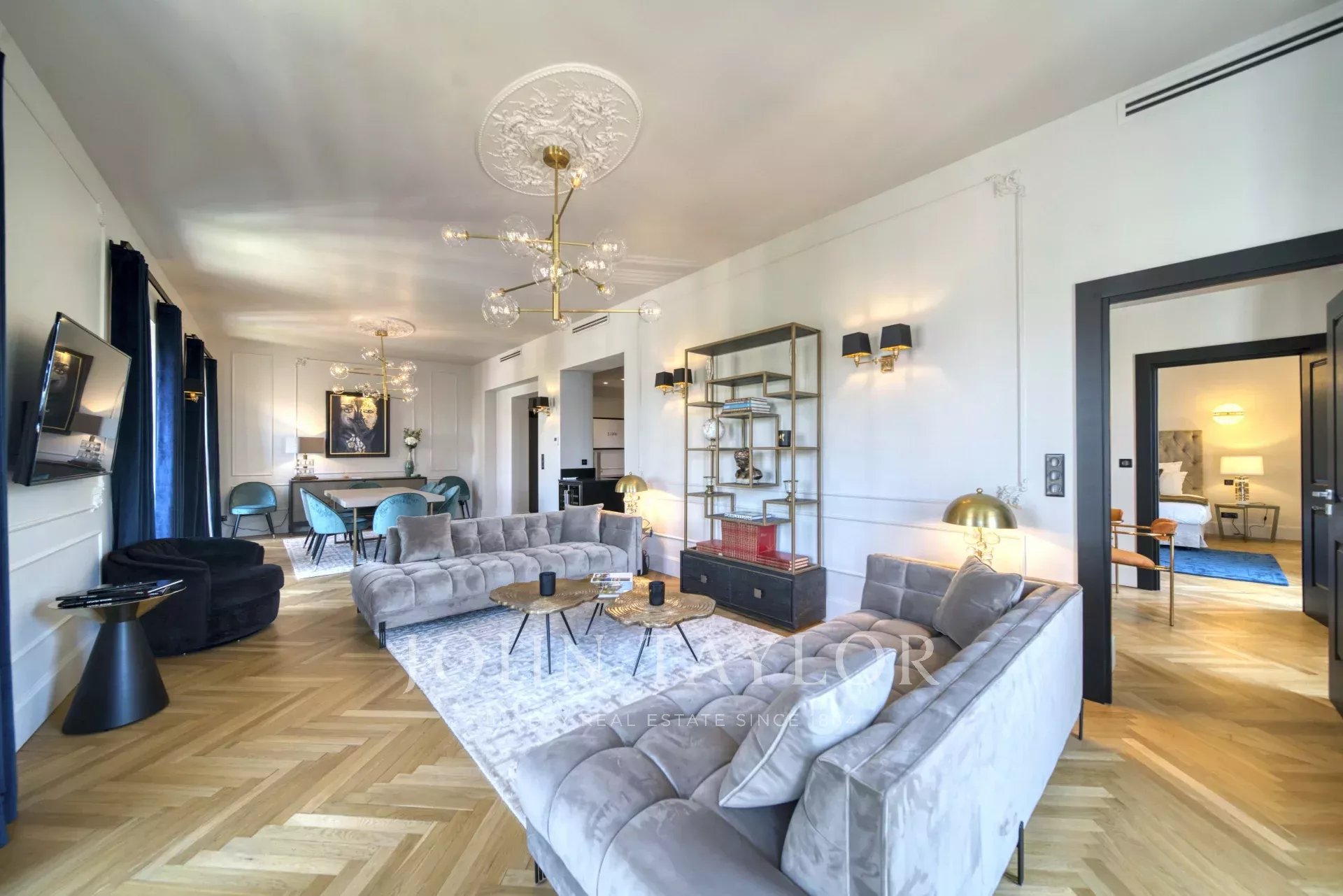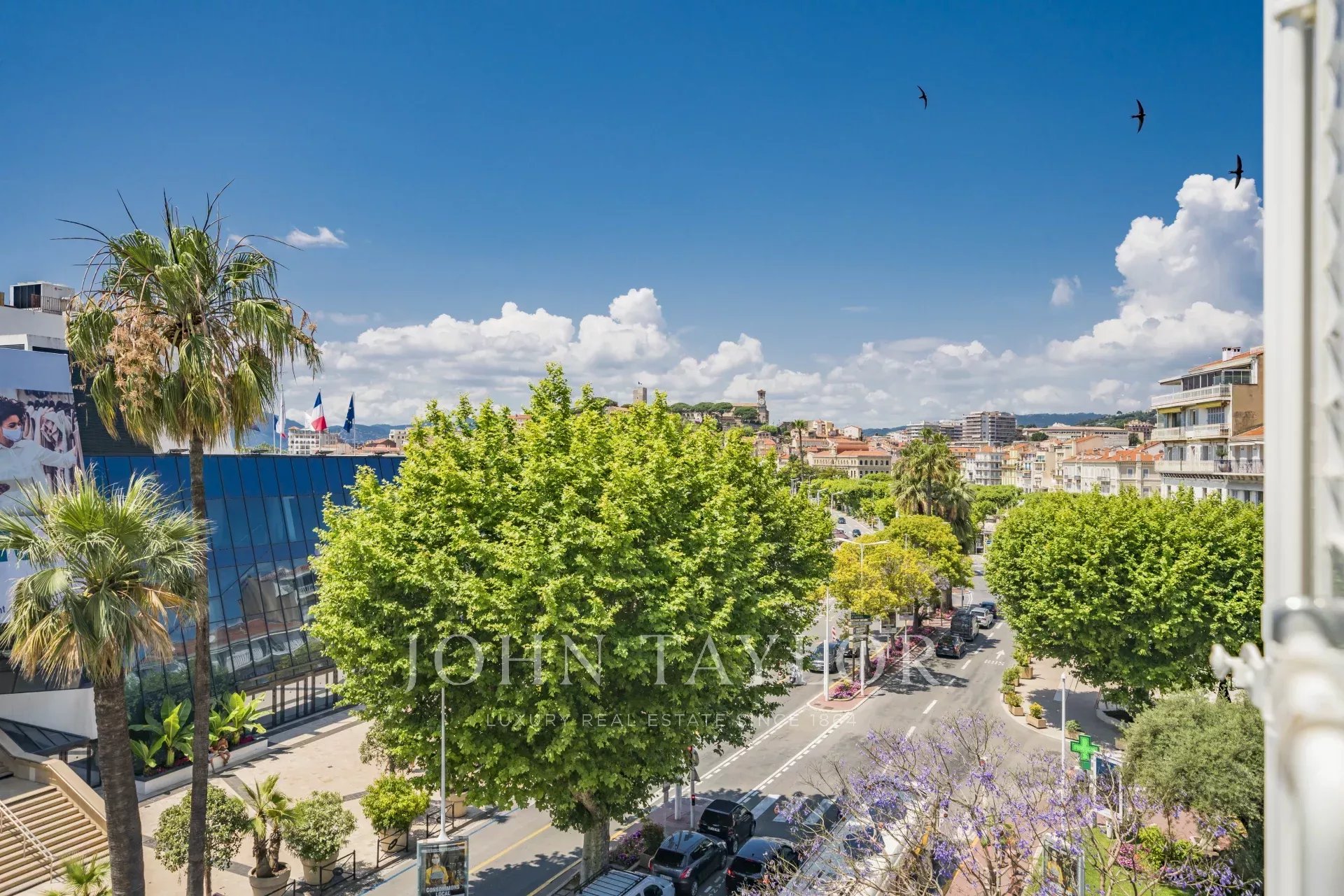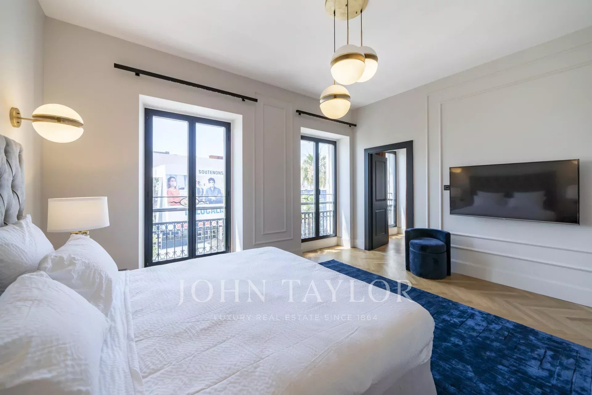 On the 3rd floor of a bourgeois-style building, facing the Palais des Festivals and the Croisette beaches, close to the rue d'Antibes, the "Marché Forville" and the old city of Cannes "Le Suquet", contemporary apartment entirely renovated and air-conditioned offering 195 sq.m living space as follows :