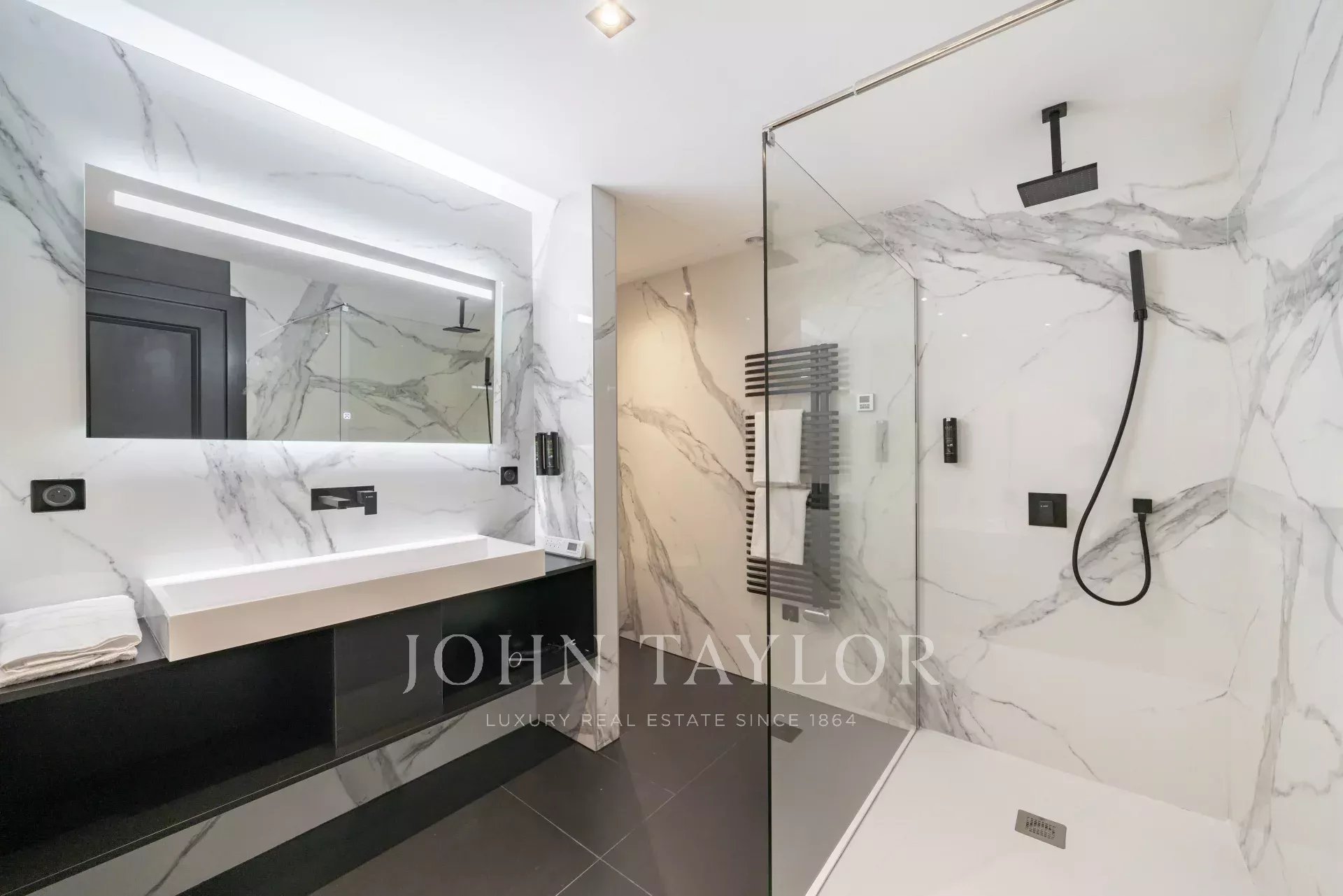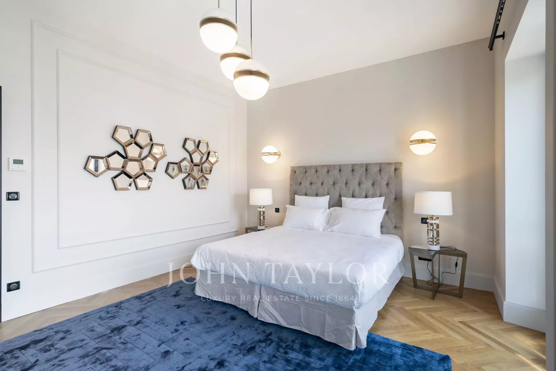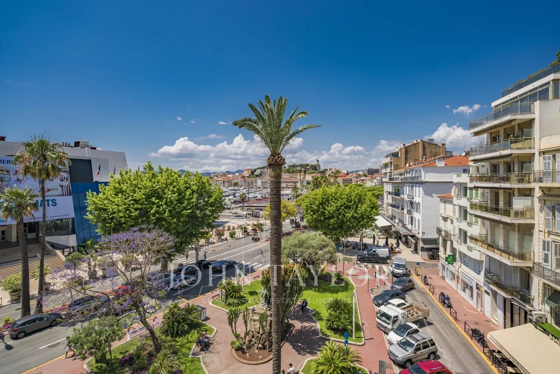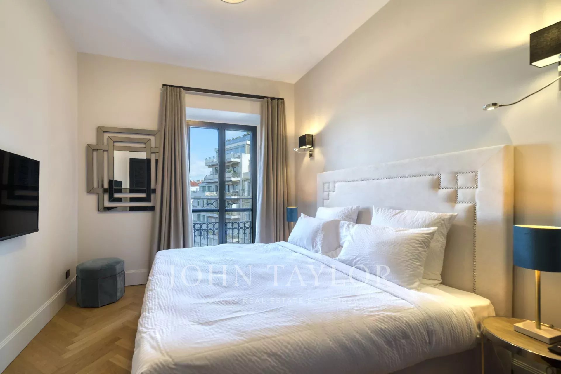 On the 3rd floor of a bourgeois-style building, facing the Palais des Festivals and the Croisette beaches, close to the rue d'Antibes, the "Marché Forville" and the old city of Cannes "Le Suquet", contemporary apartment entirely renovated and air-conditioned offering 195 sq.m living space as follows :