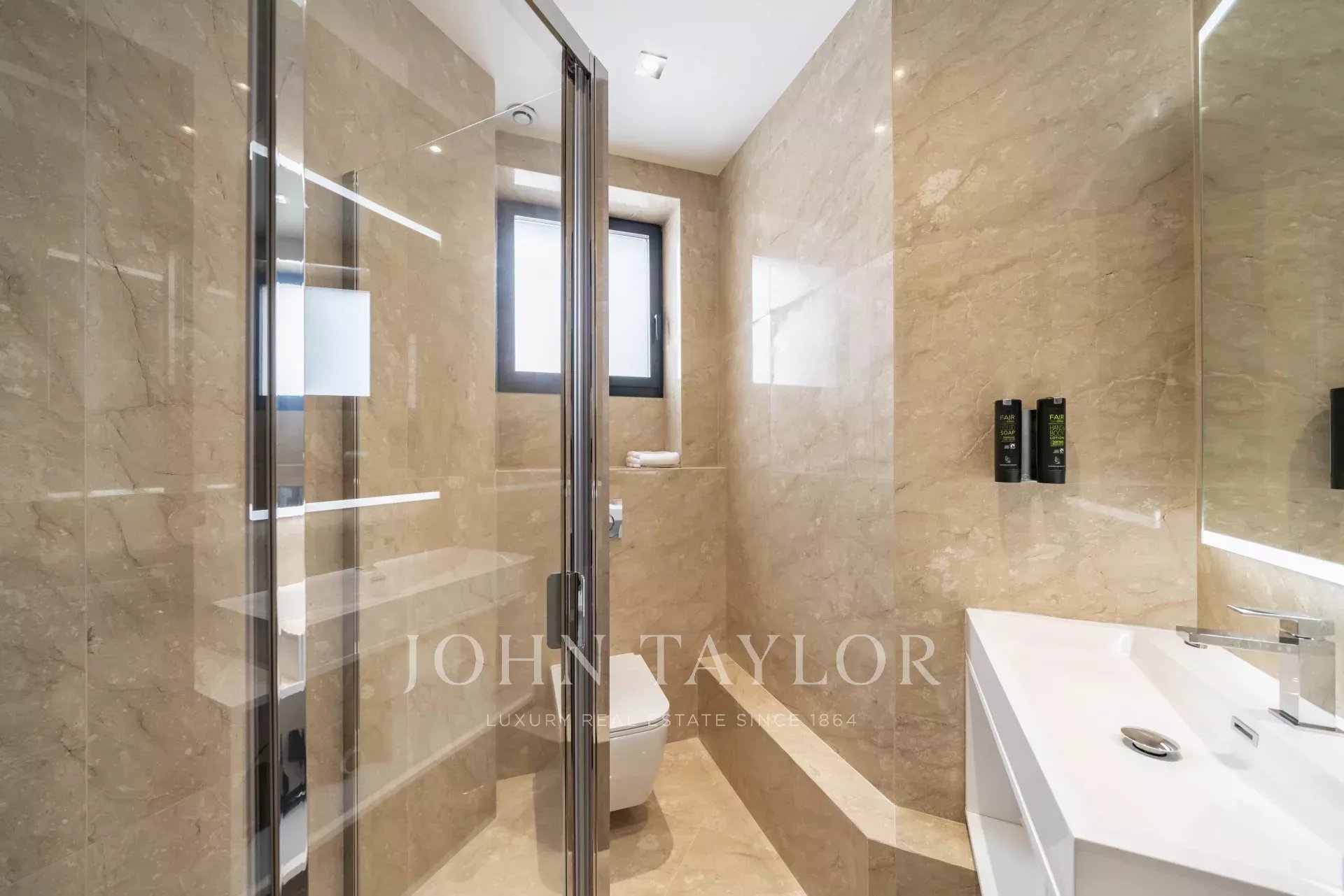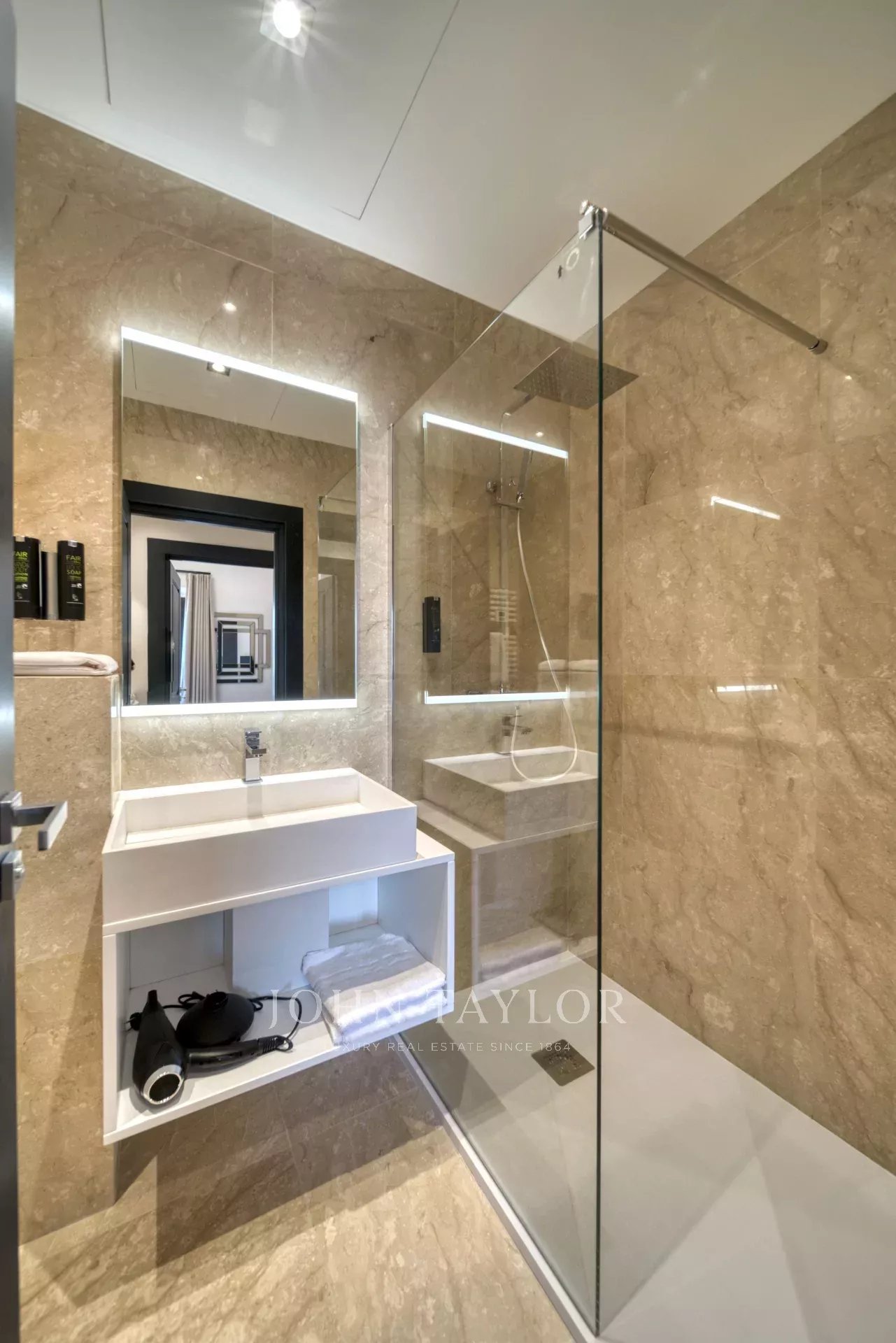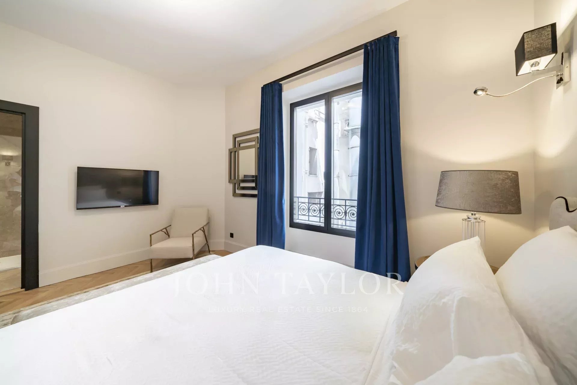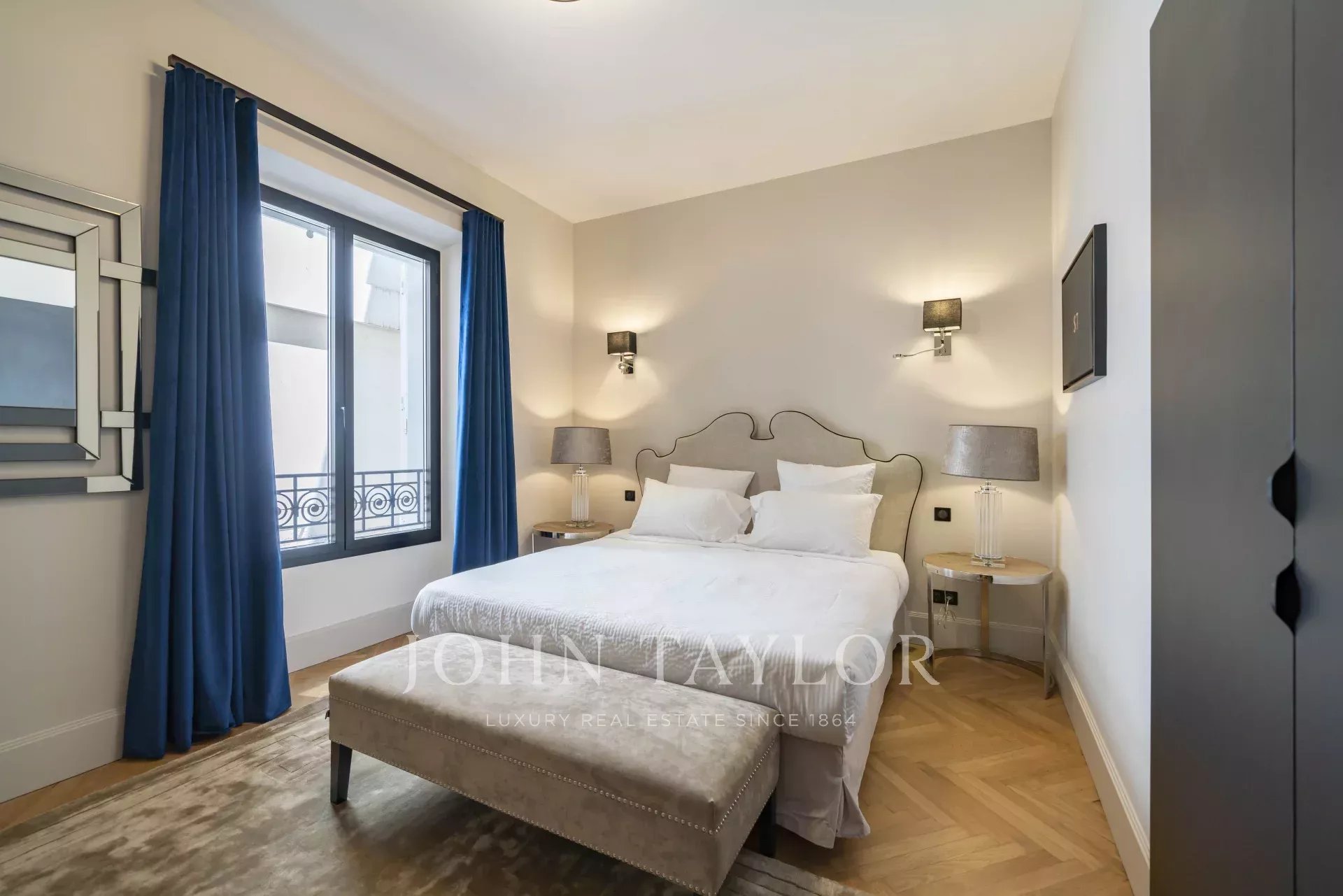 On the 3rd floor of a bourgeois-style building, facing the Palais des Festivals and the Croisette beaches, close to the rue d'Antibes, the "Marché Forville" and the old city of Cannes "Le Suquet", contemporary apartment entirely renovated and air-conditioned offering 195 sq.m living space as follows :