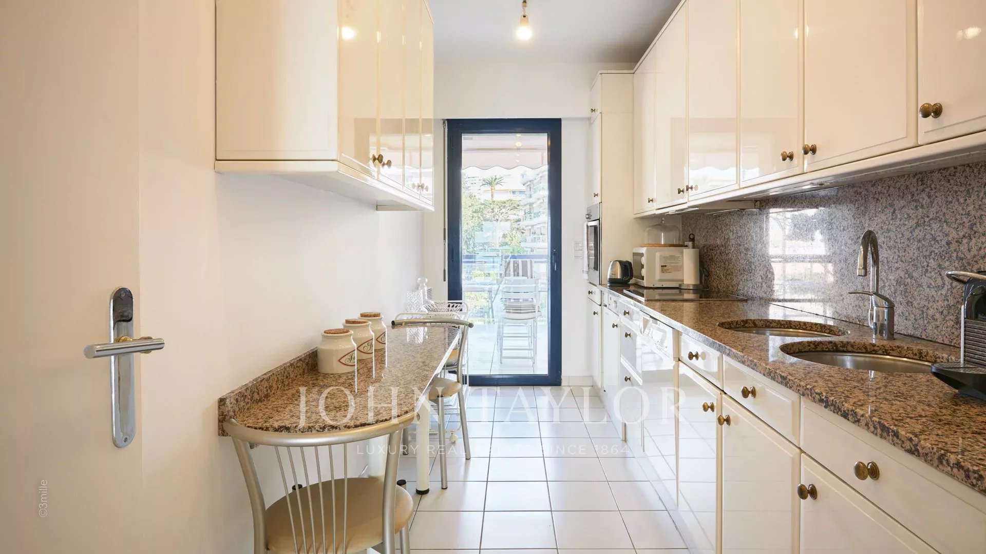 Equipped kitchen (no dryer) opening onto the back terrace (parking side)