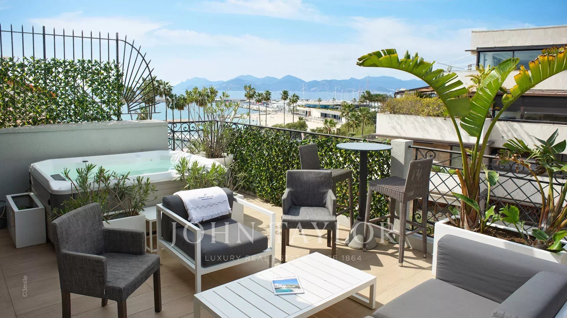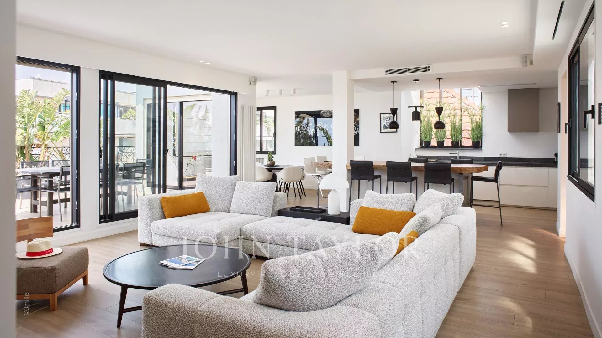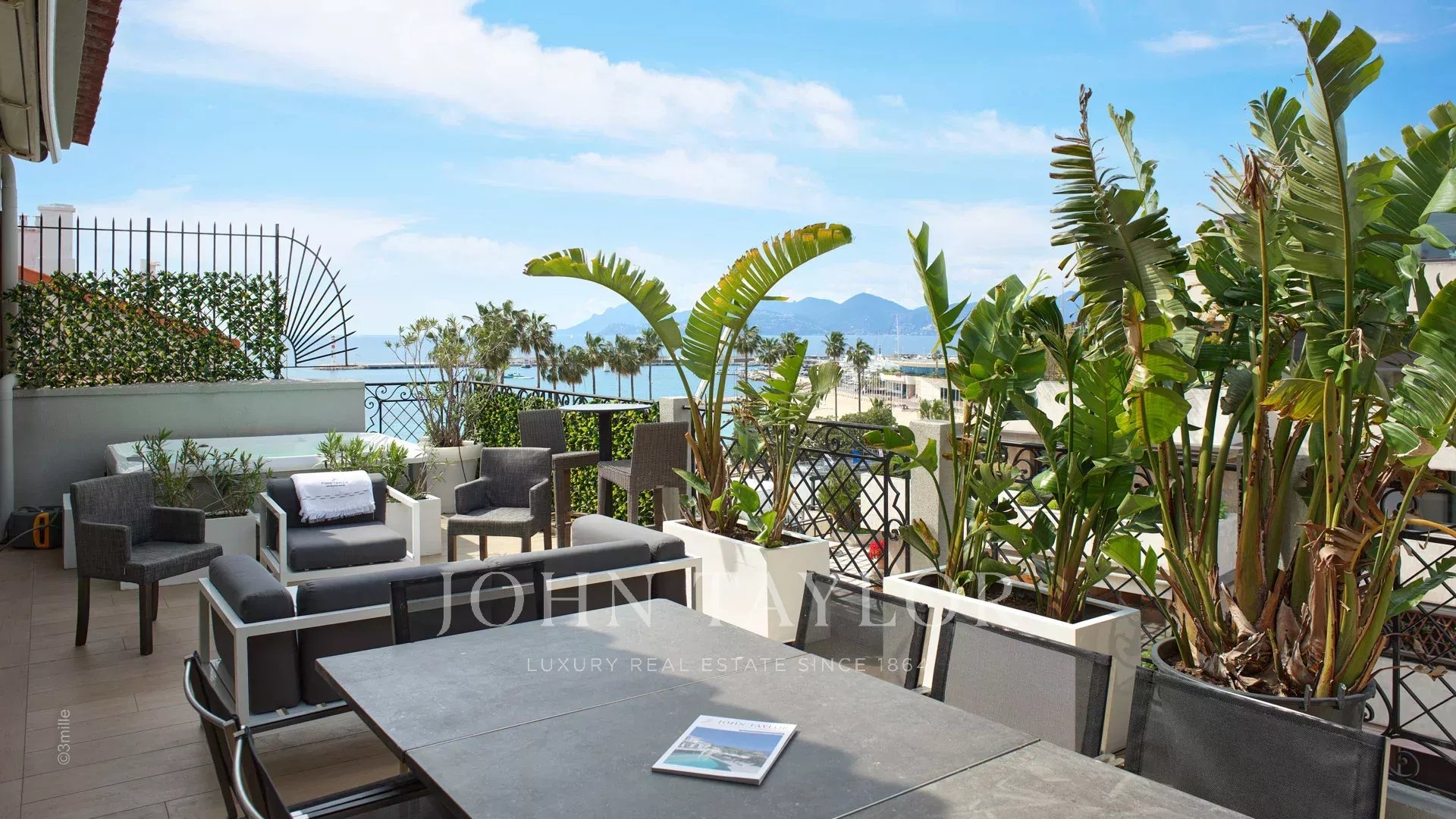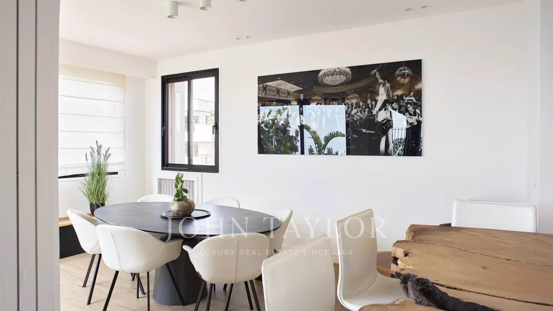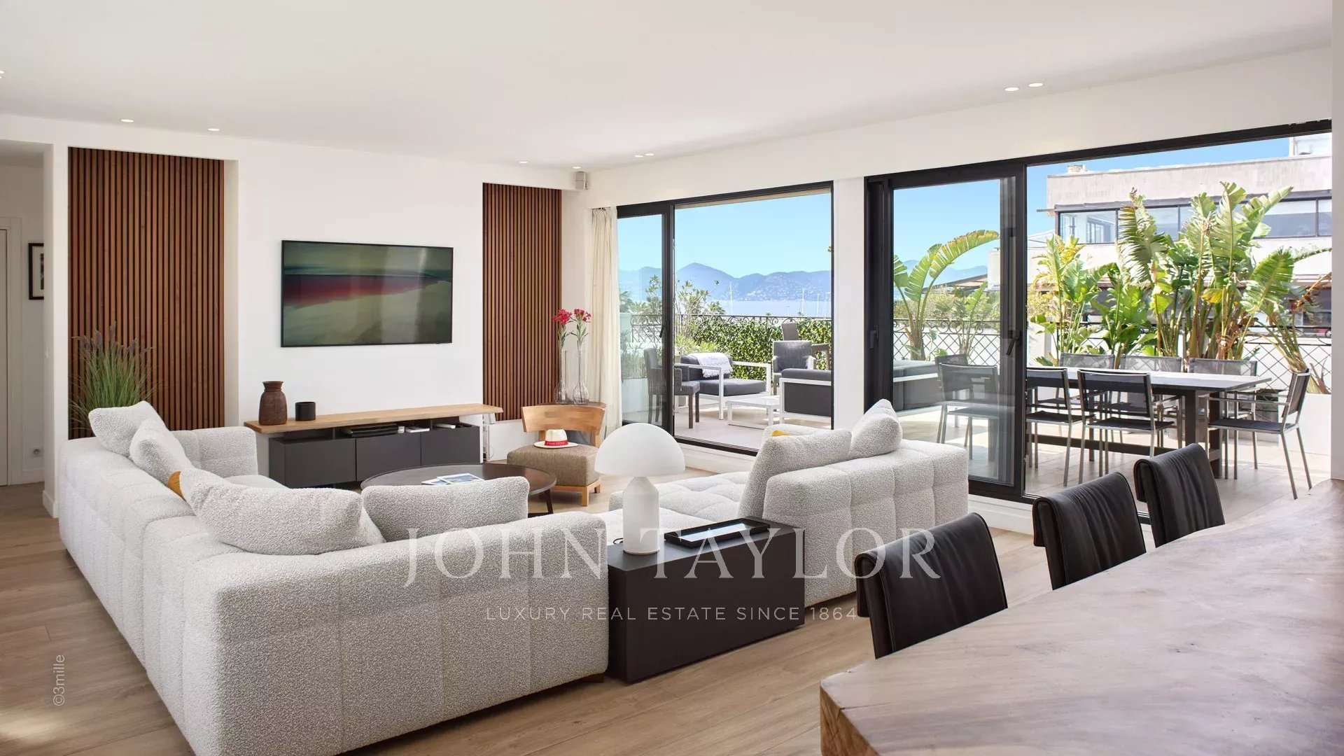 In a quiet area and ideally located near the Palais des Festivals, superb air-conditioned contemporary apartment of about 130 sq.m fully renovated with high quality services, enhanced with two large terraces and enjoying nice sea view.