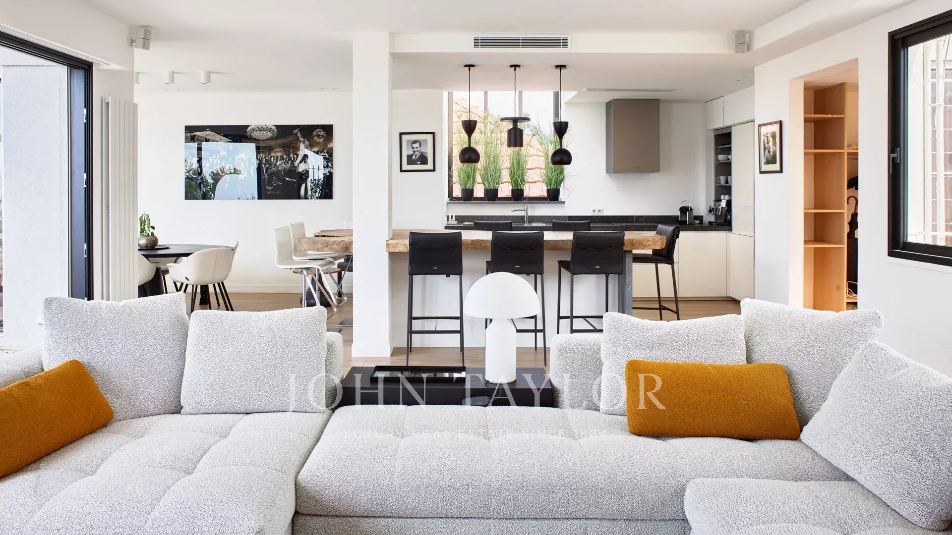 Living/dining room opening onto the terrace of about 50m² with jacuzzi and sea view.