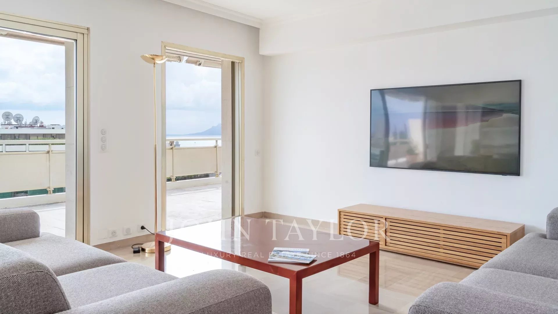 South-facing, fully air-conditioned 140 sq.m apartment on the top floor (8th) of a downtown residence, just a few minutes' walk from the beaches and the Palais des Festivals.