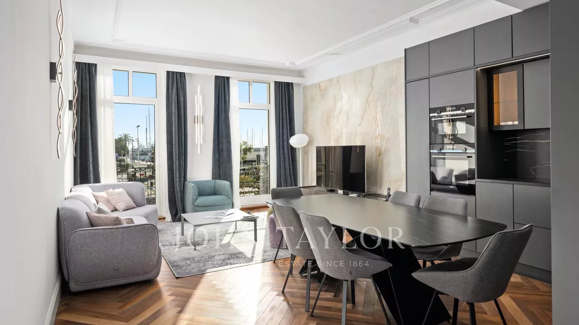 Ideally located opposite the Palais des Festivals with views over the Place Charles de Gaulle, the old port of Cannes and Le Suquet, attractive contemporary apartment of 120 sq.m, fully renovated and air-conditioned.