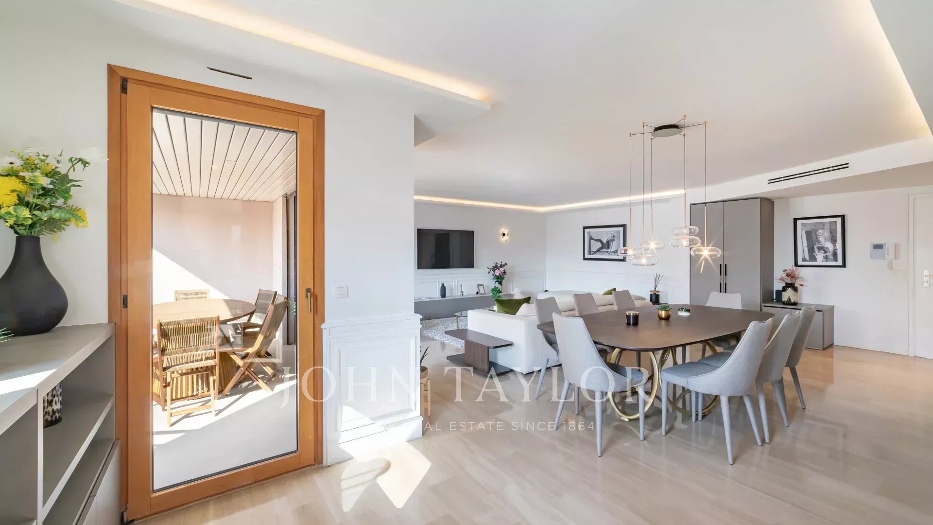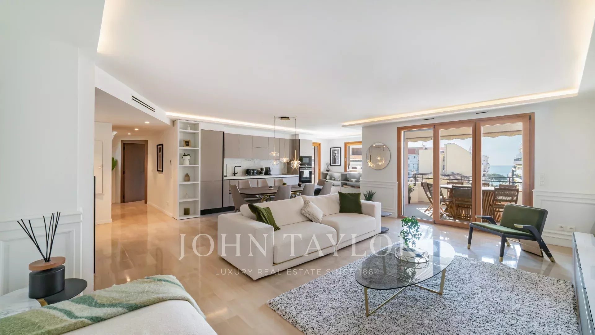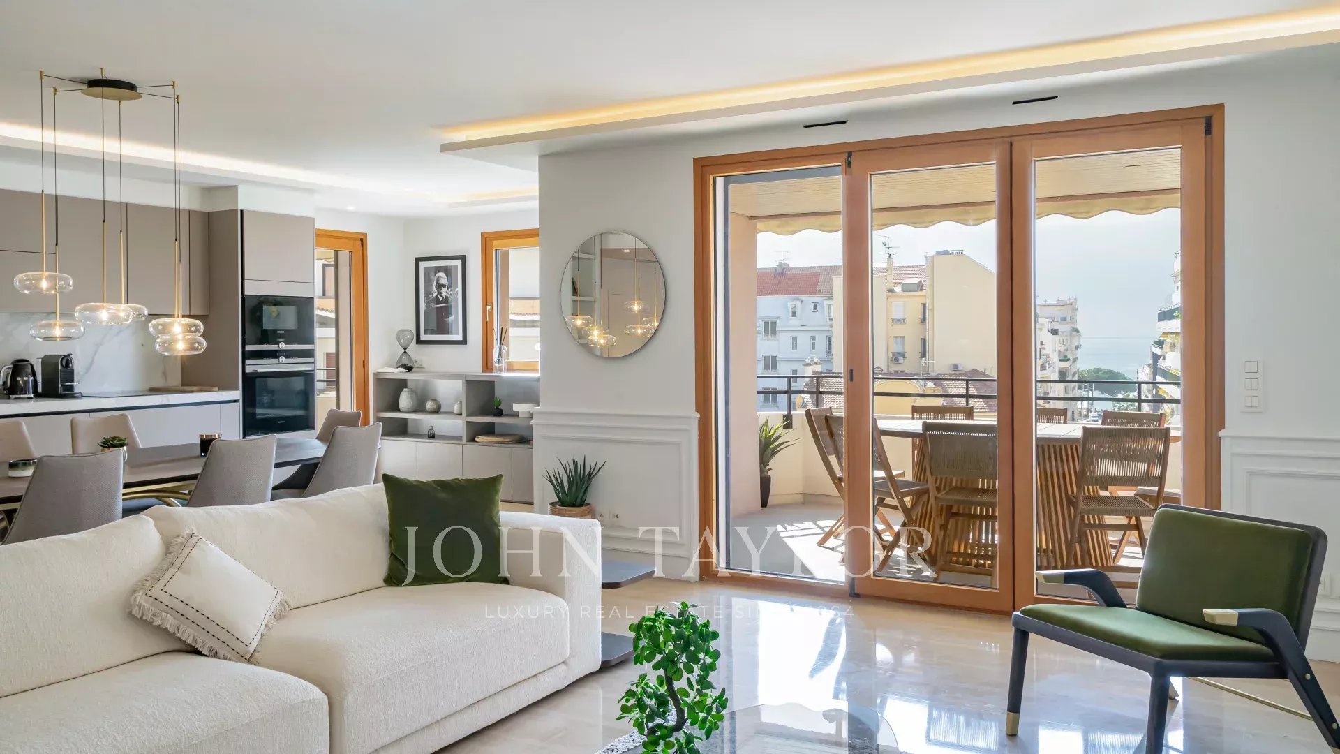 Entrance leading to a beautiful reception room with lounge, dining area and open-plan kitchen opening onto terrace