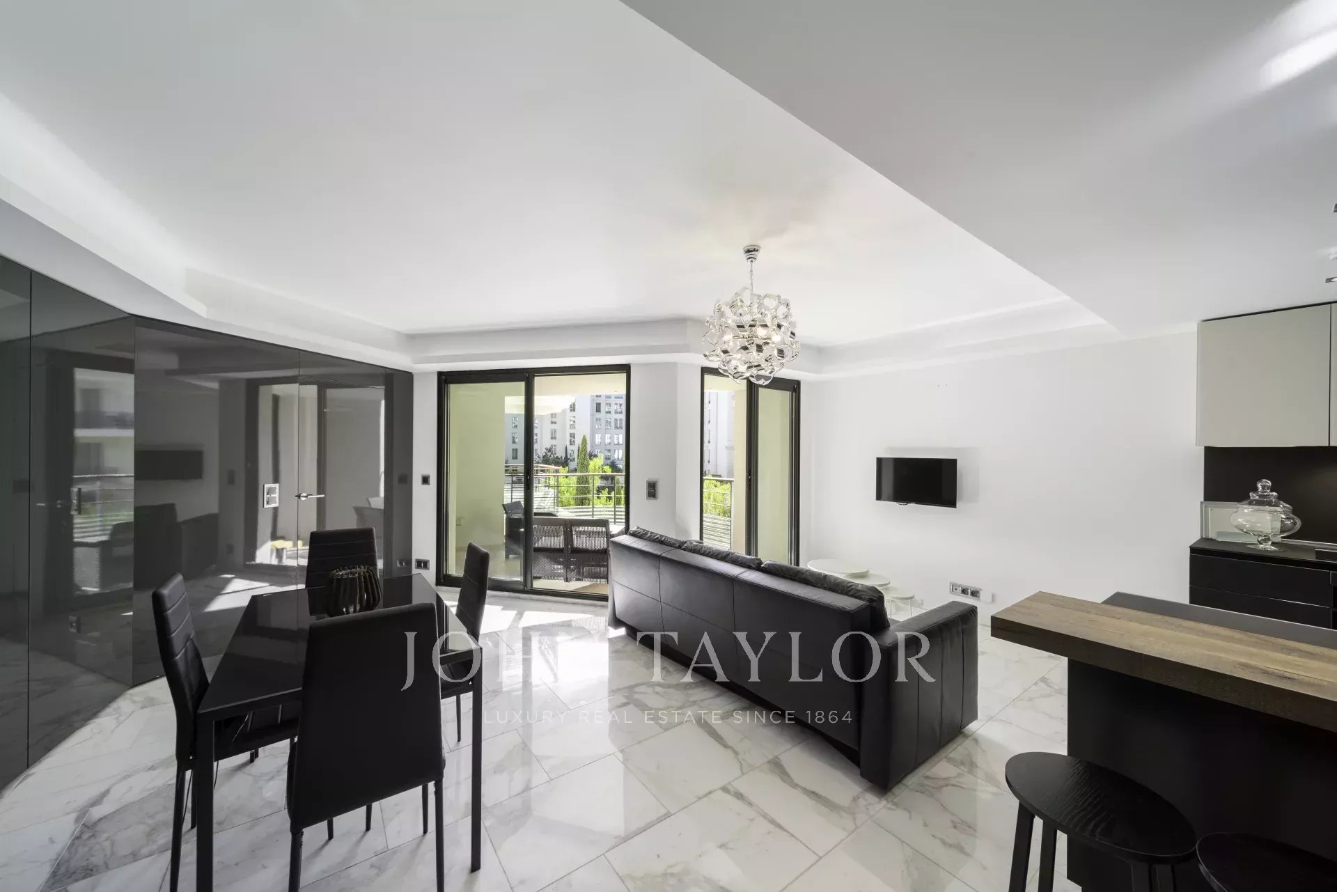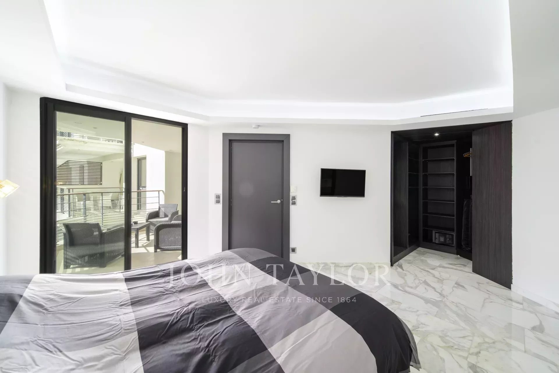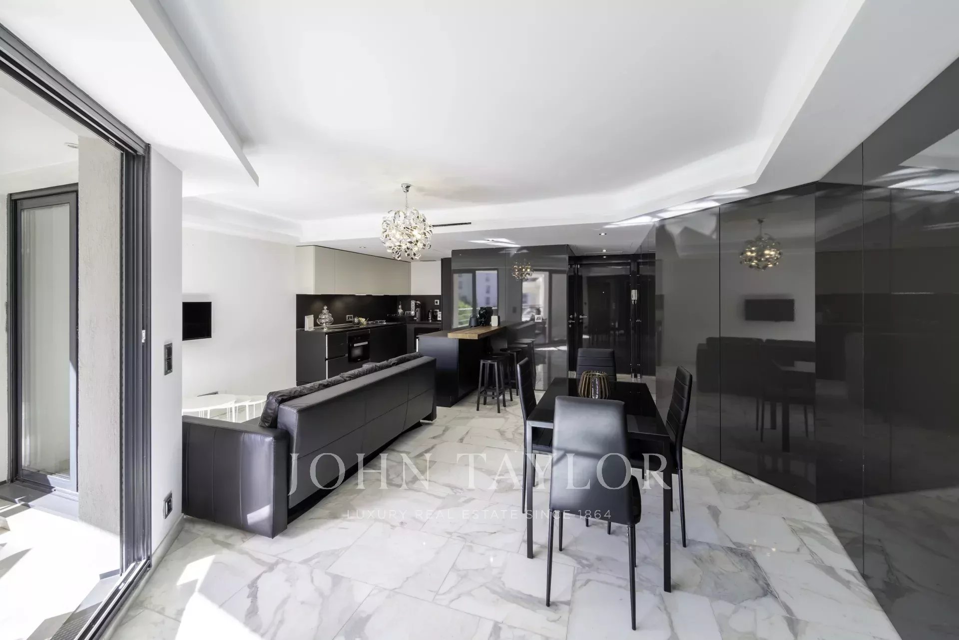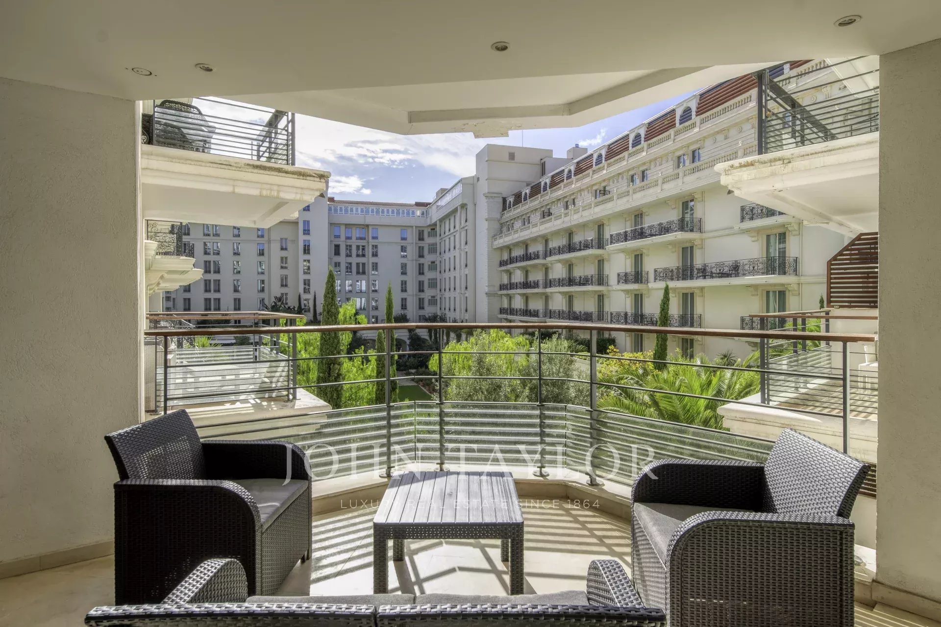 Fully air-conditioned, the apartment features a spacious and bright living room with a fully equipped open-plan kitchen, opening onto a pleasant terrace with views over the gardens of the Hôtel Carlton.
