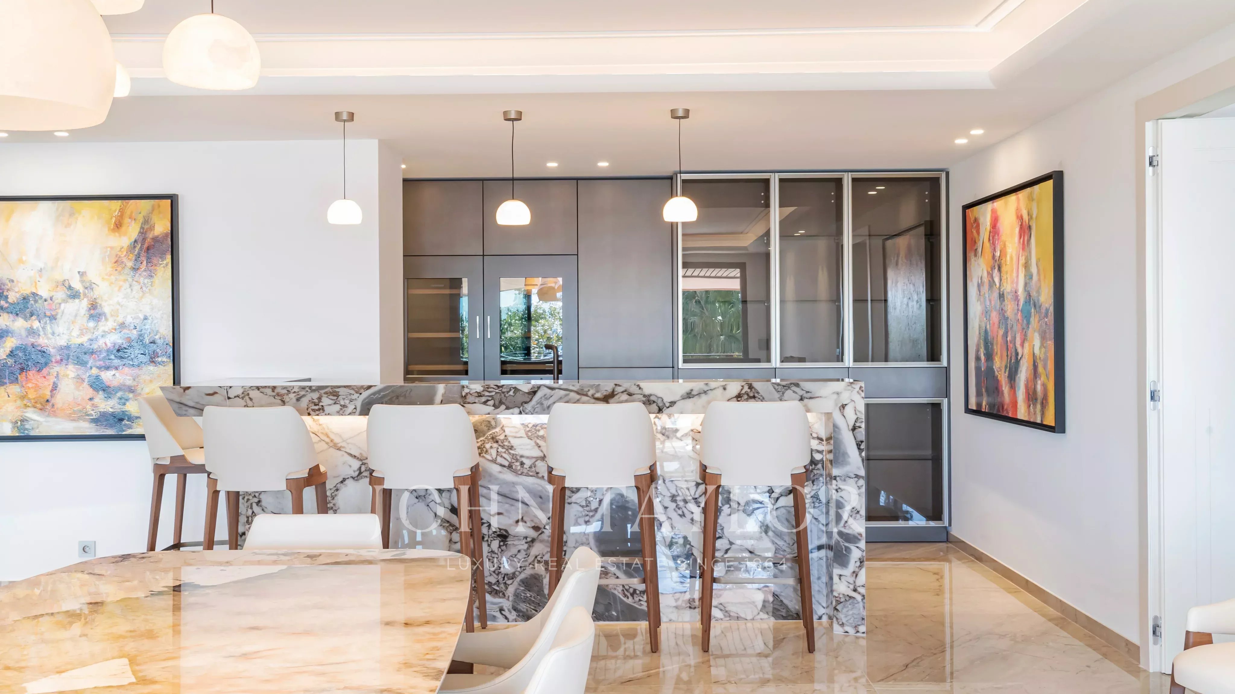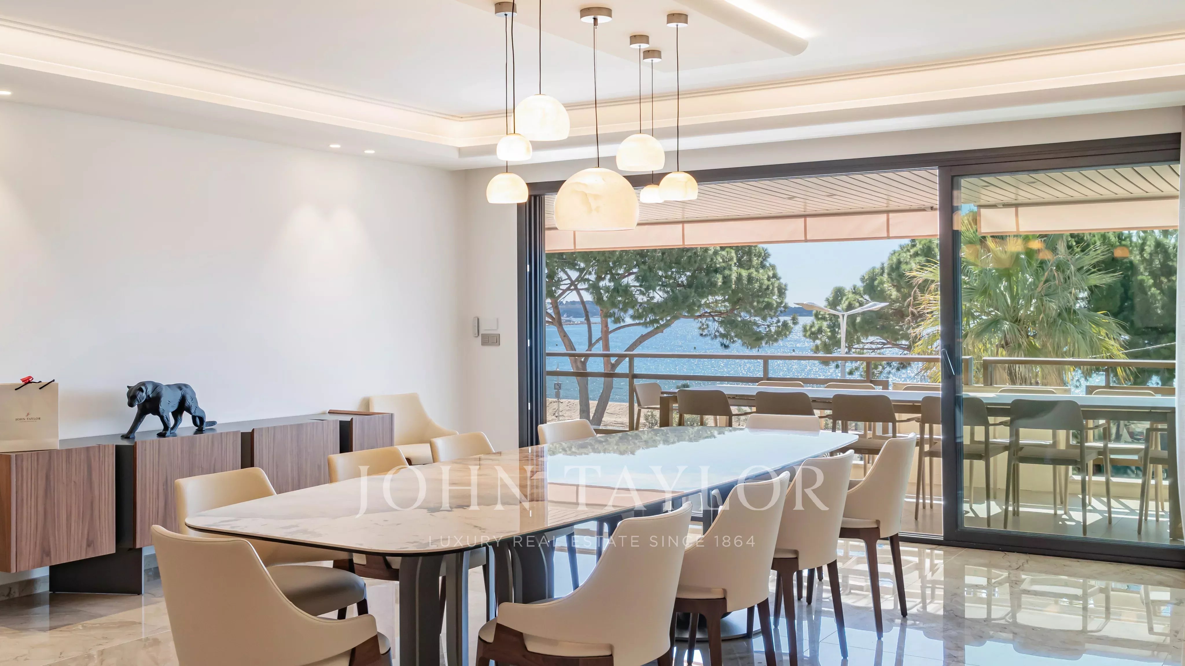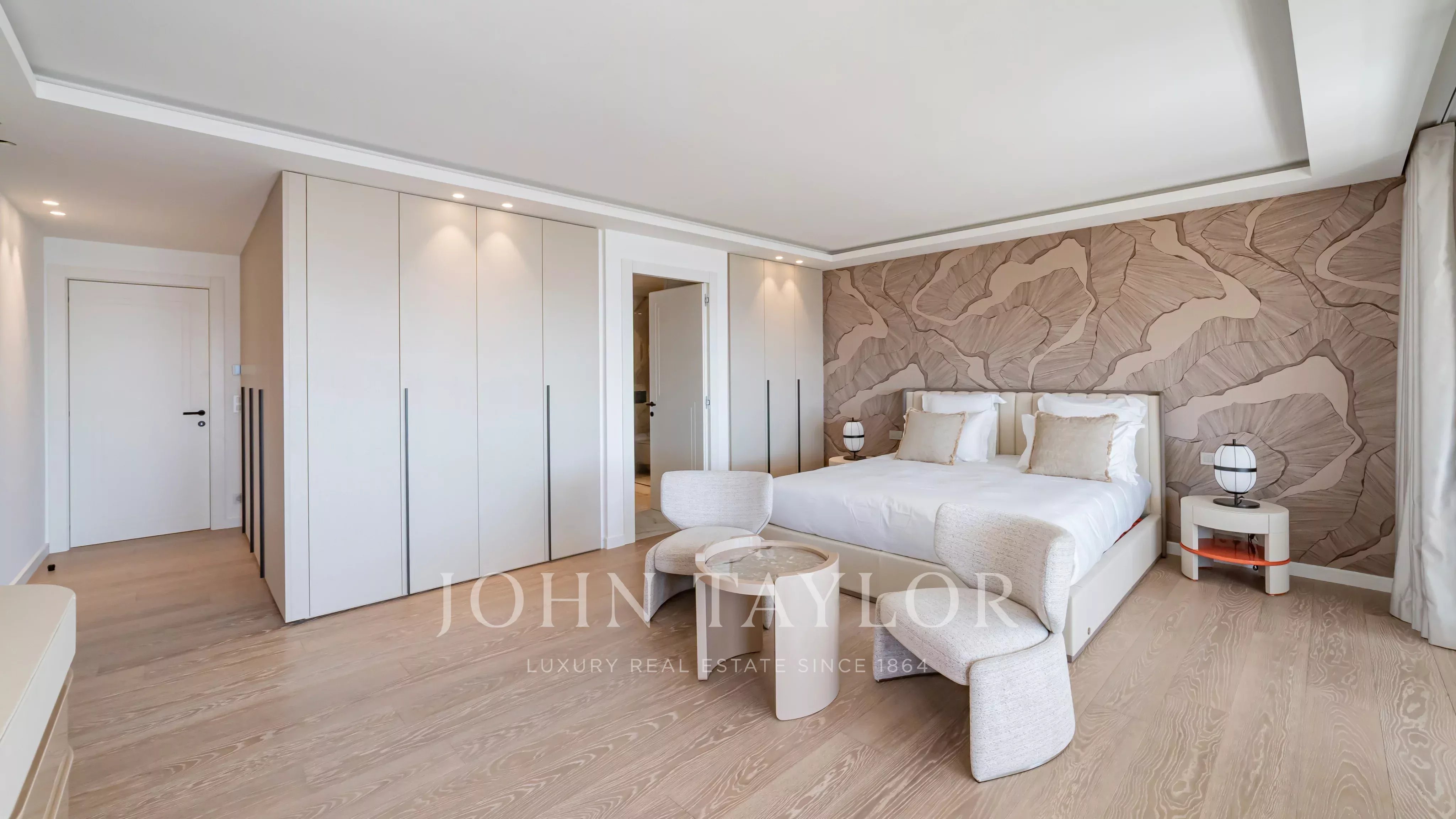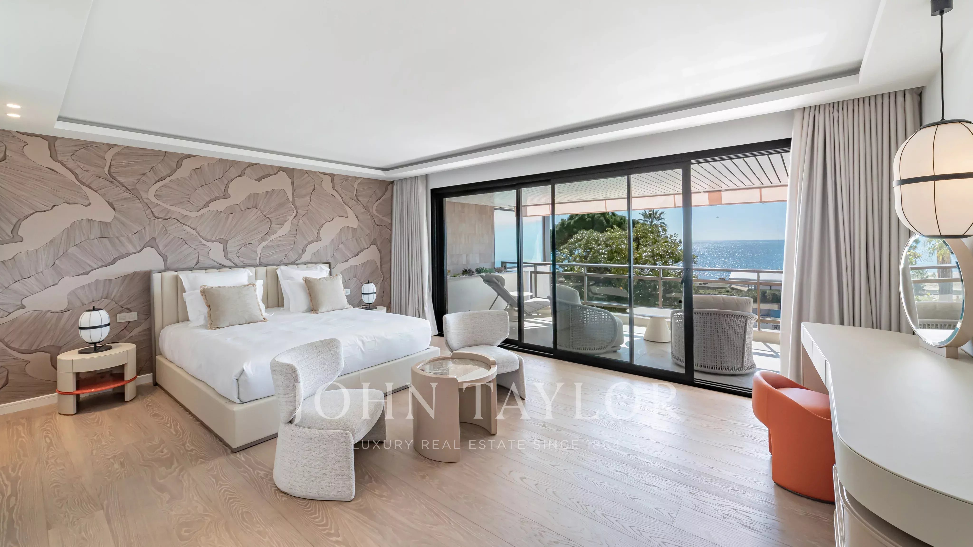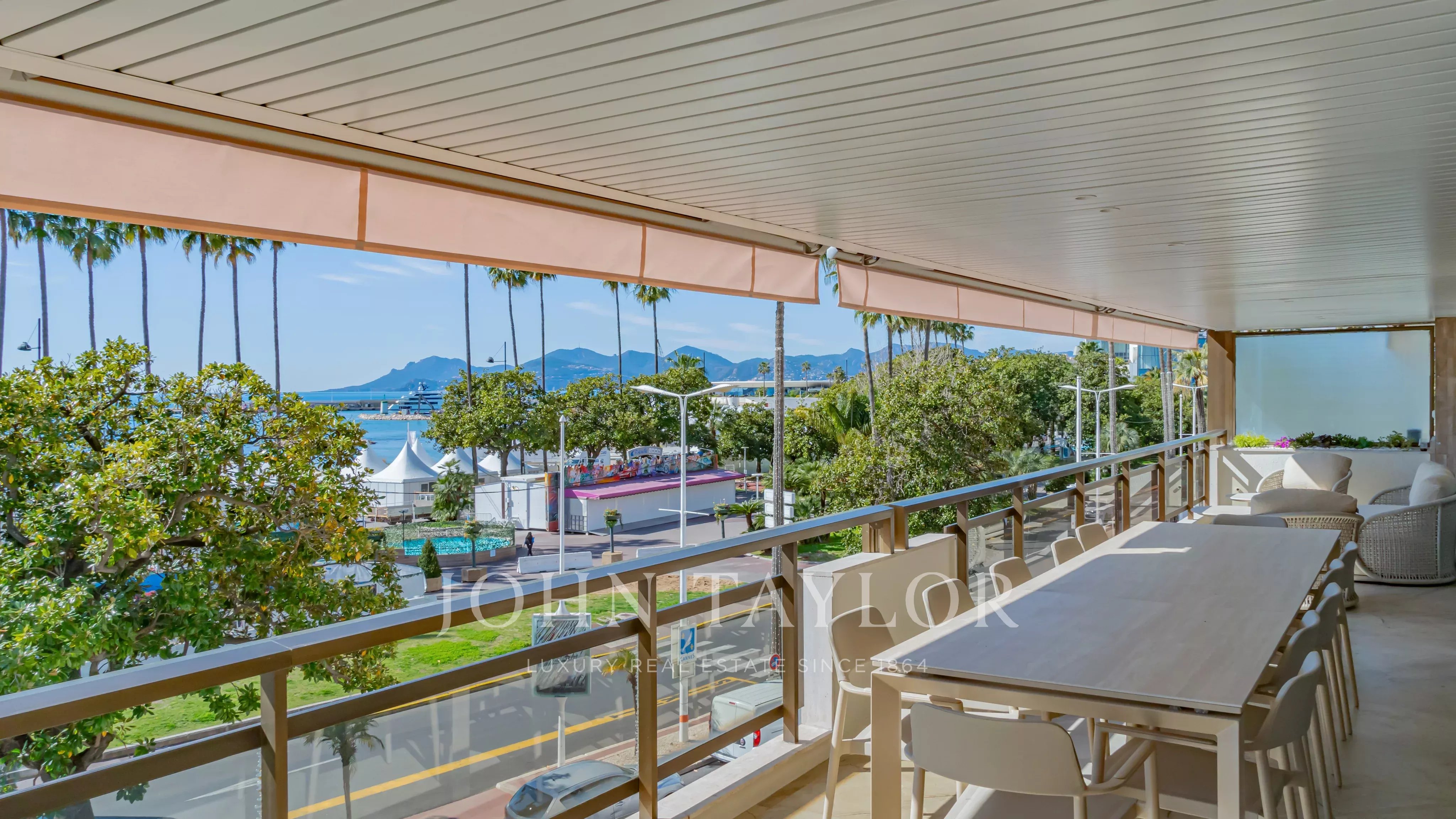The terrace, a true signature feature of the property, serves as a genuine living space, offering spectacular, unobstructed views over the sea, the Croisette, and the Bay of Cannes—an ideal setting for entertaining or enjoying Cannes’ most prestigious events.
