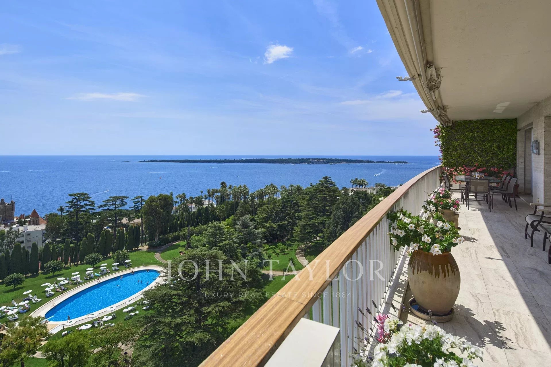 On the top of Cannes, in a high standing residence in a park of 11 ha, air-conditioned apartment enjoying magnificent view on the Lerins Islands and the Cap d'Antibes.