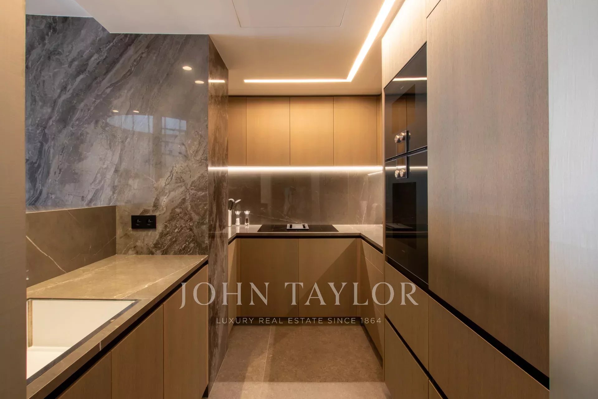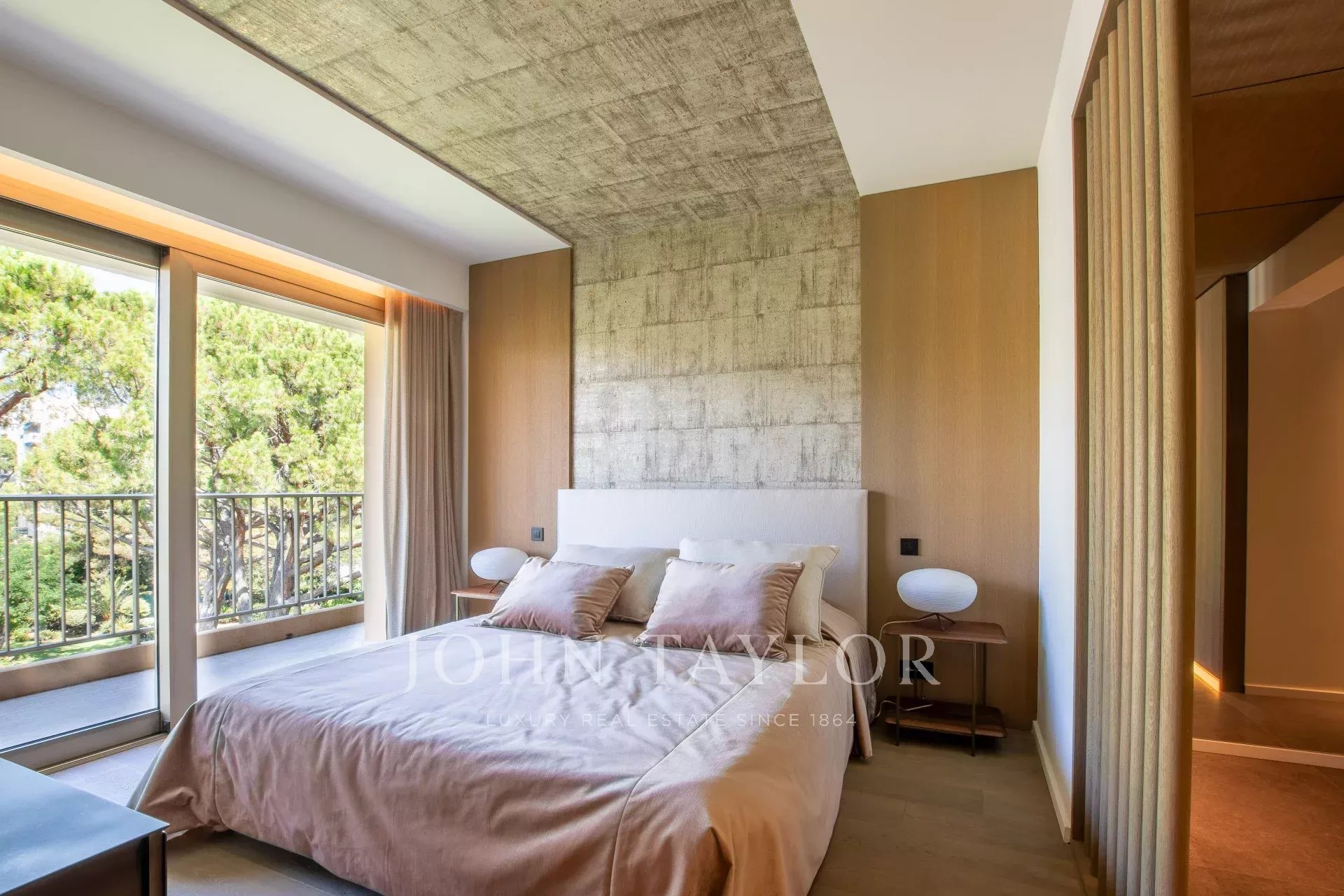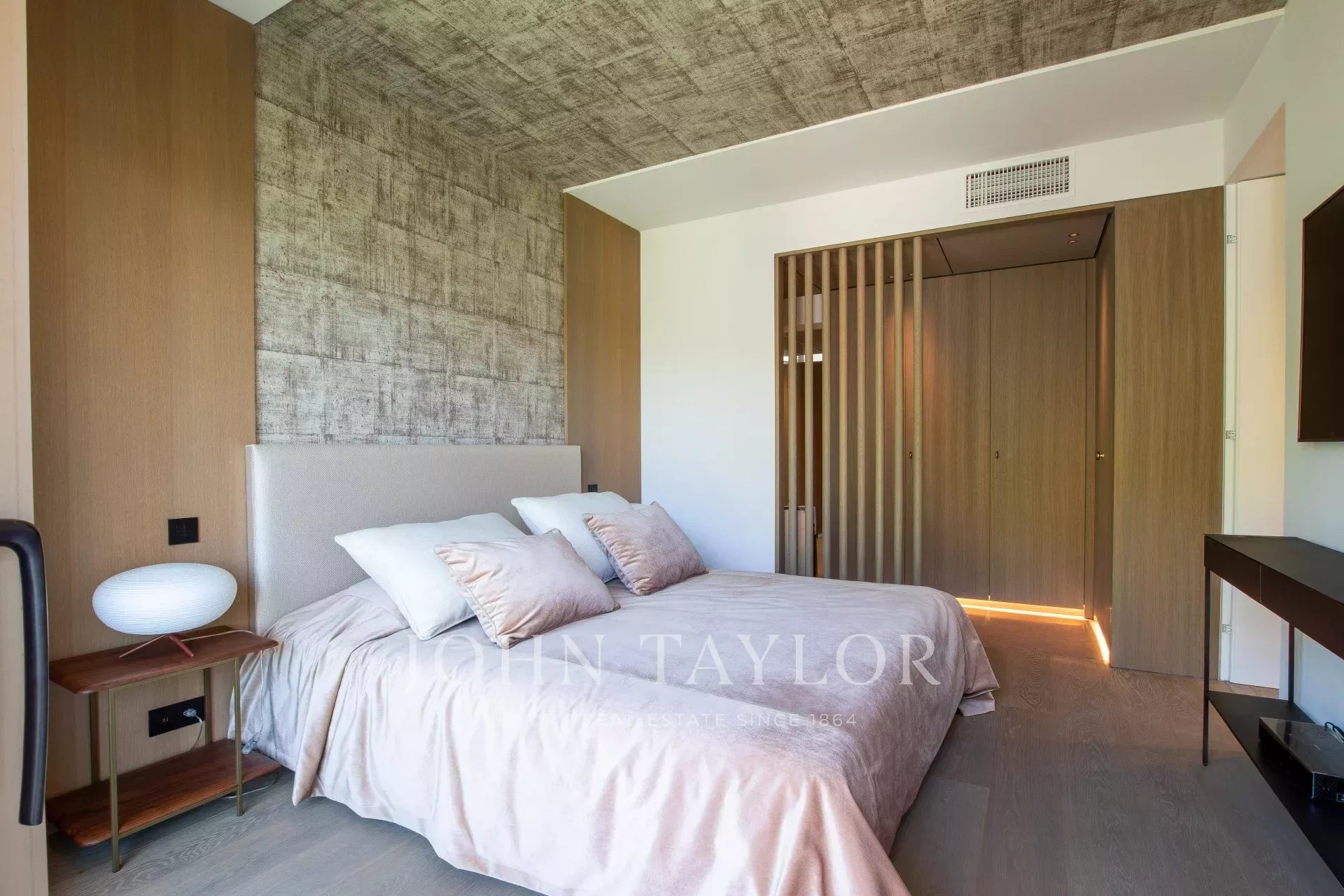 The apartment consists of an entrance, large living room and dining room opening onto a first terrace of about 33 sqm with panoramic views, fitted kitchen. Guest toilet. Two bedrooms en-suite with balcony of 33 sqm. Stairs rising on to the roof terrace with a surface of 130 sqm, private pool, a cabin boat, shower and toilet. High-end services.