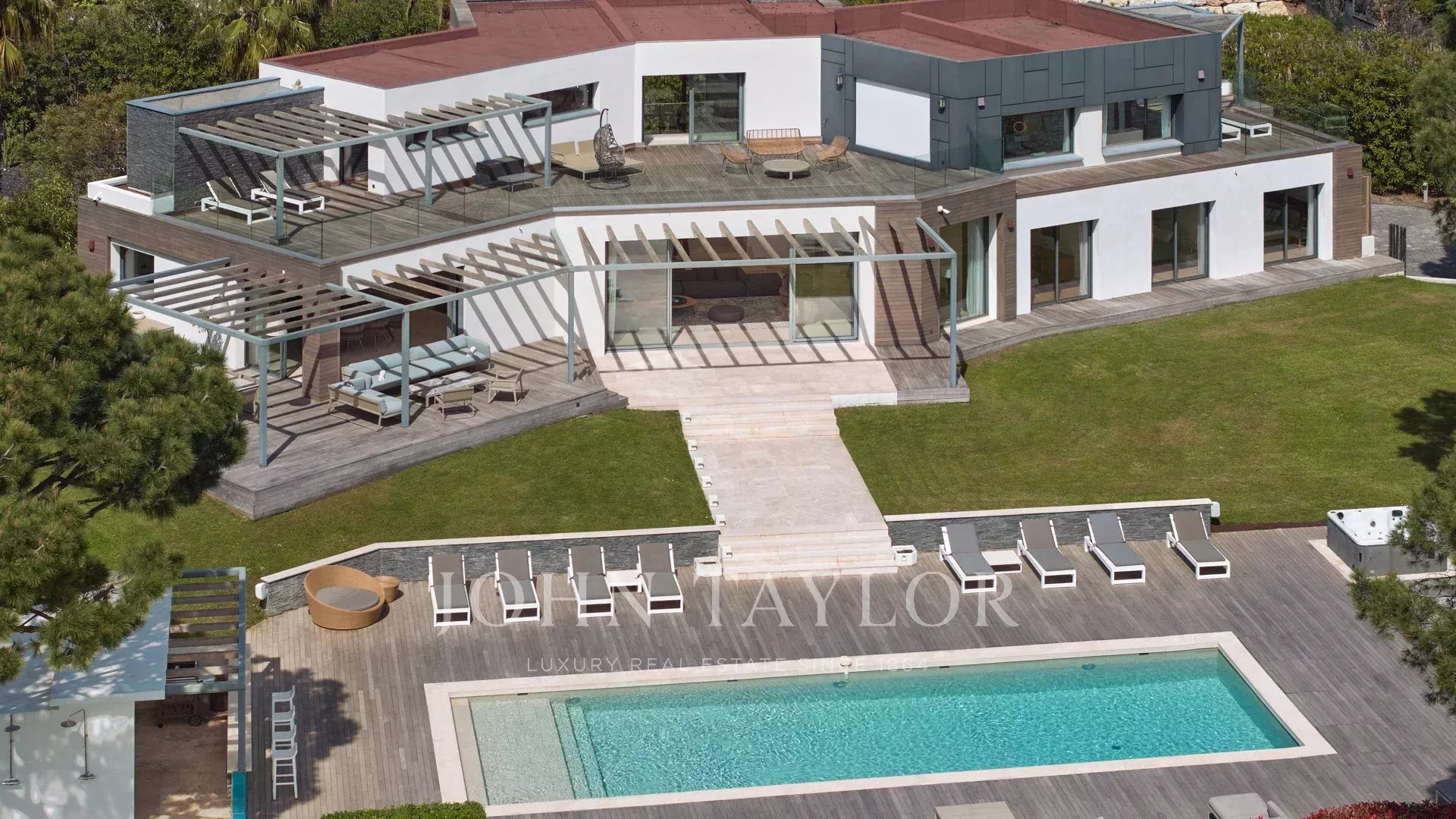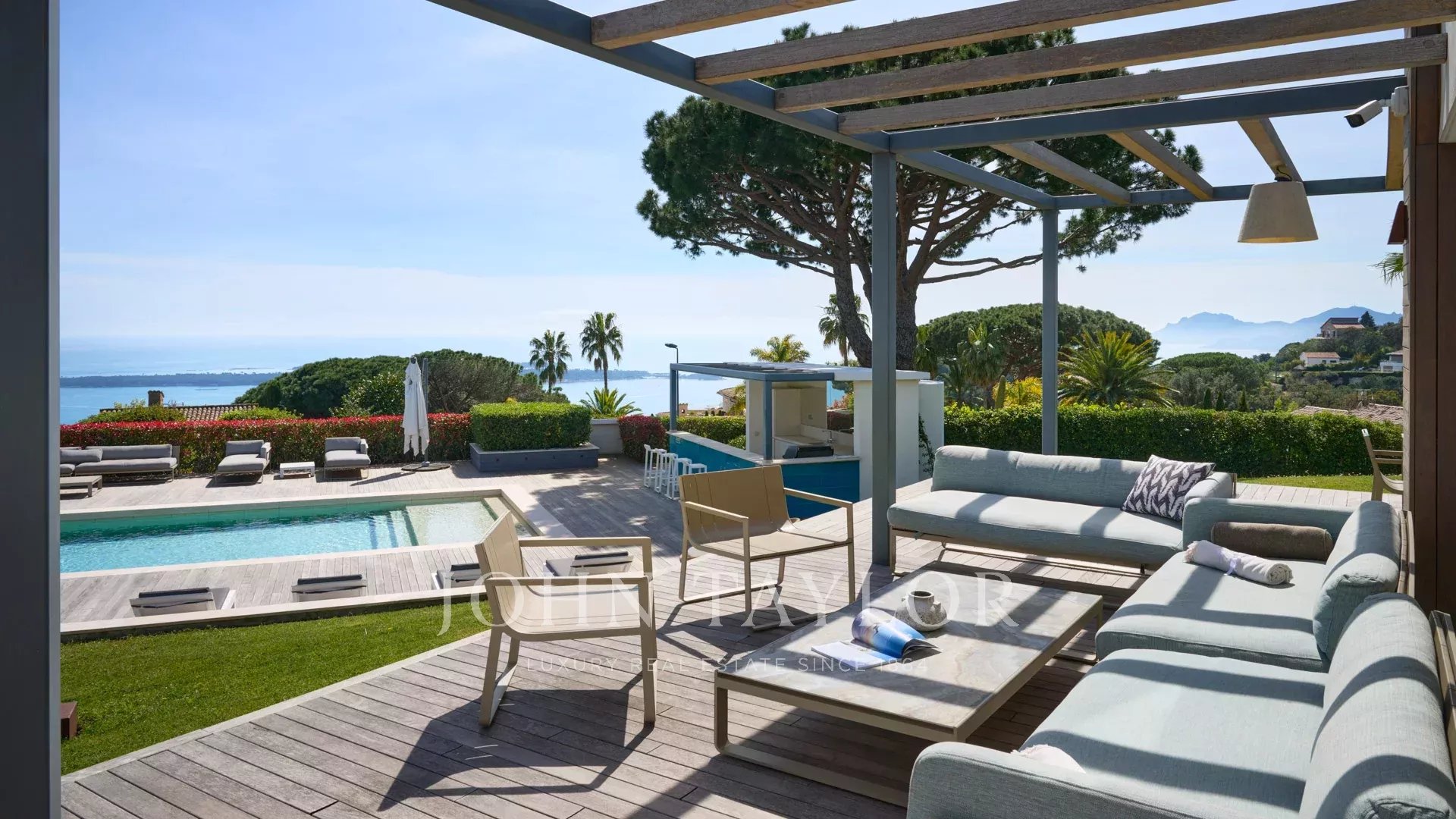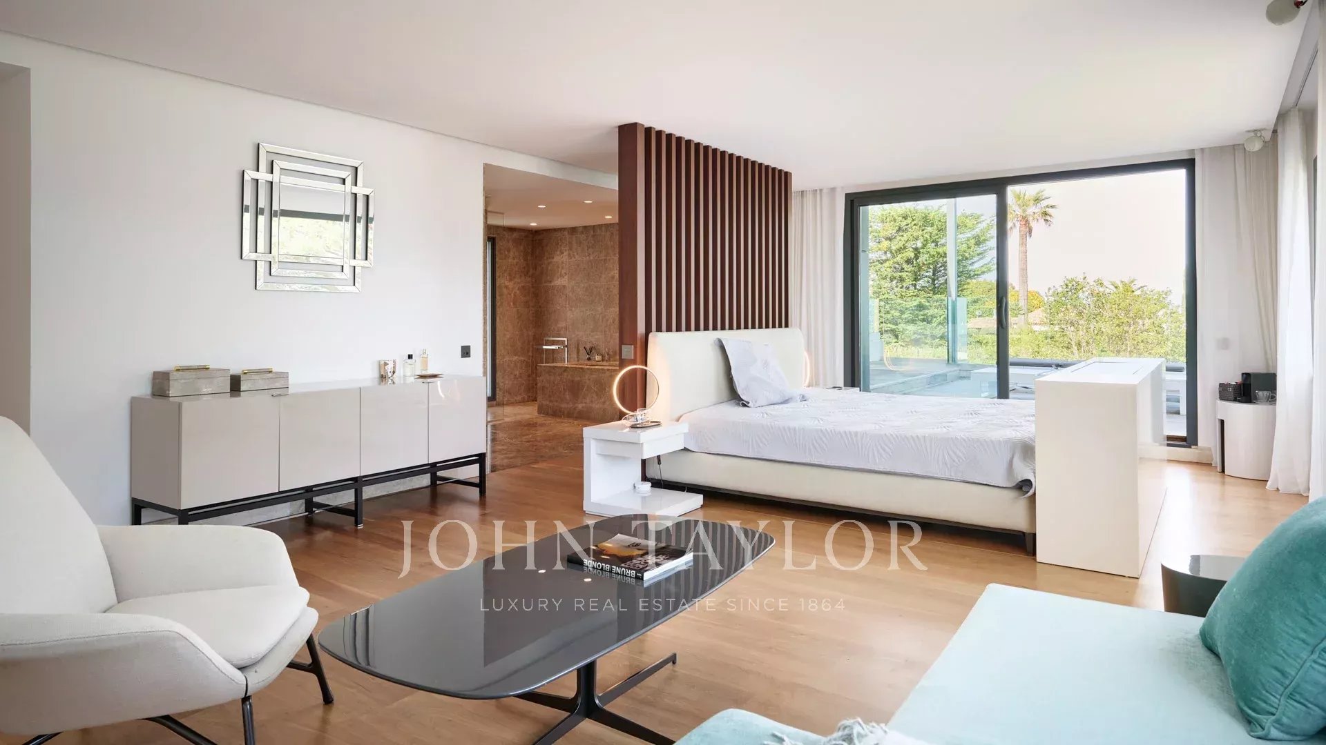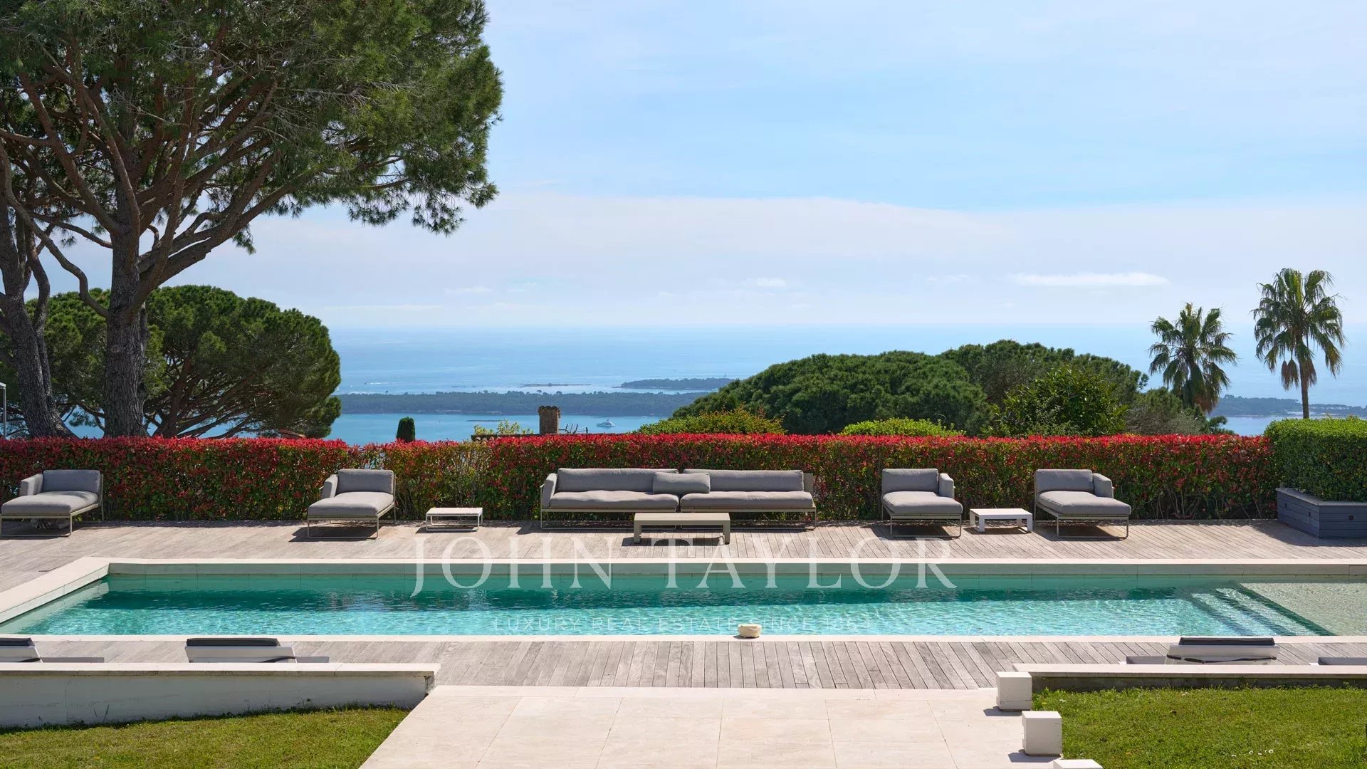 On the heights of Cannes, offering a unique view of the Lérins Islands, this magnificent contemporary villa combines wood and concrete in the heart of a park of about 6 200 sq.m. Completely renovated, the villa impresses with its generous volumes, the top of the range appointments throughout and three large terraces.