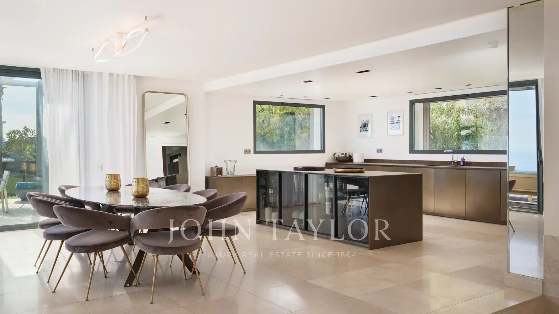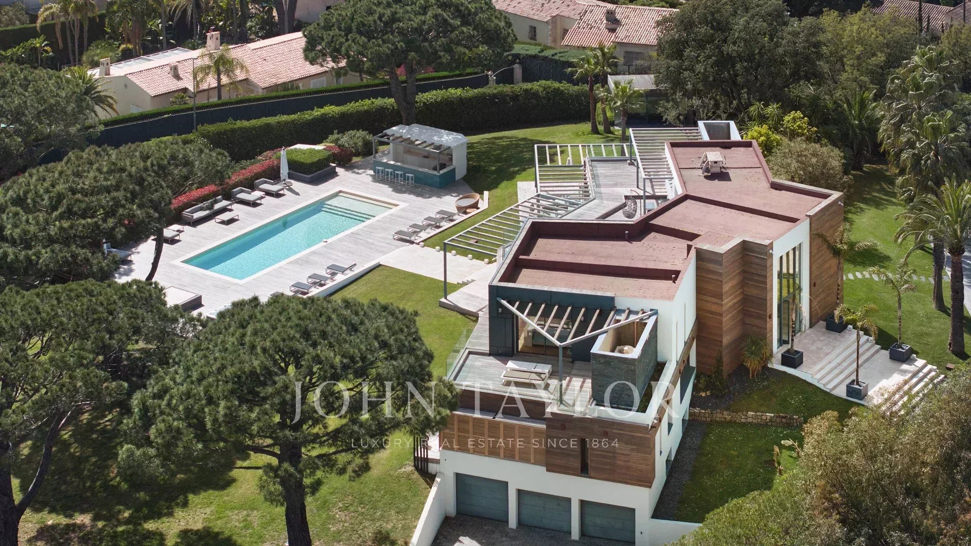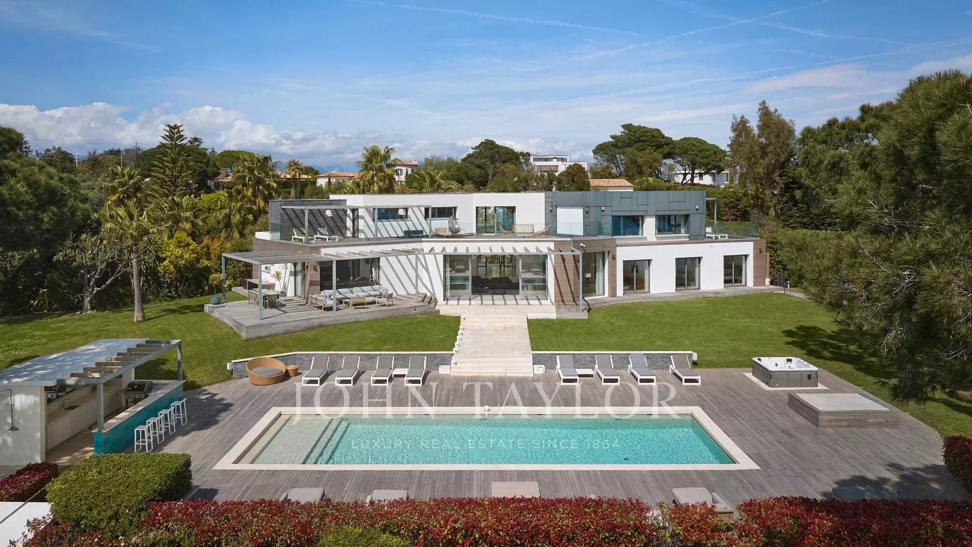 On the heights of Cannes, offering a unique view of the Lérins Islands, this magnificent contemporary villa combines wood and concrete in the heart of a park of about 6 200 sq.m. Completely renovated, the villa impresses with its generous volumes, the top of the range appointments throughout and three large terraces.