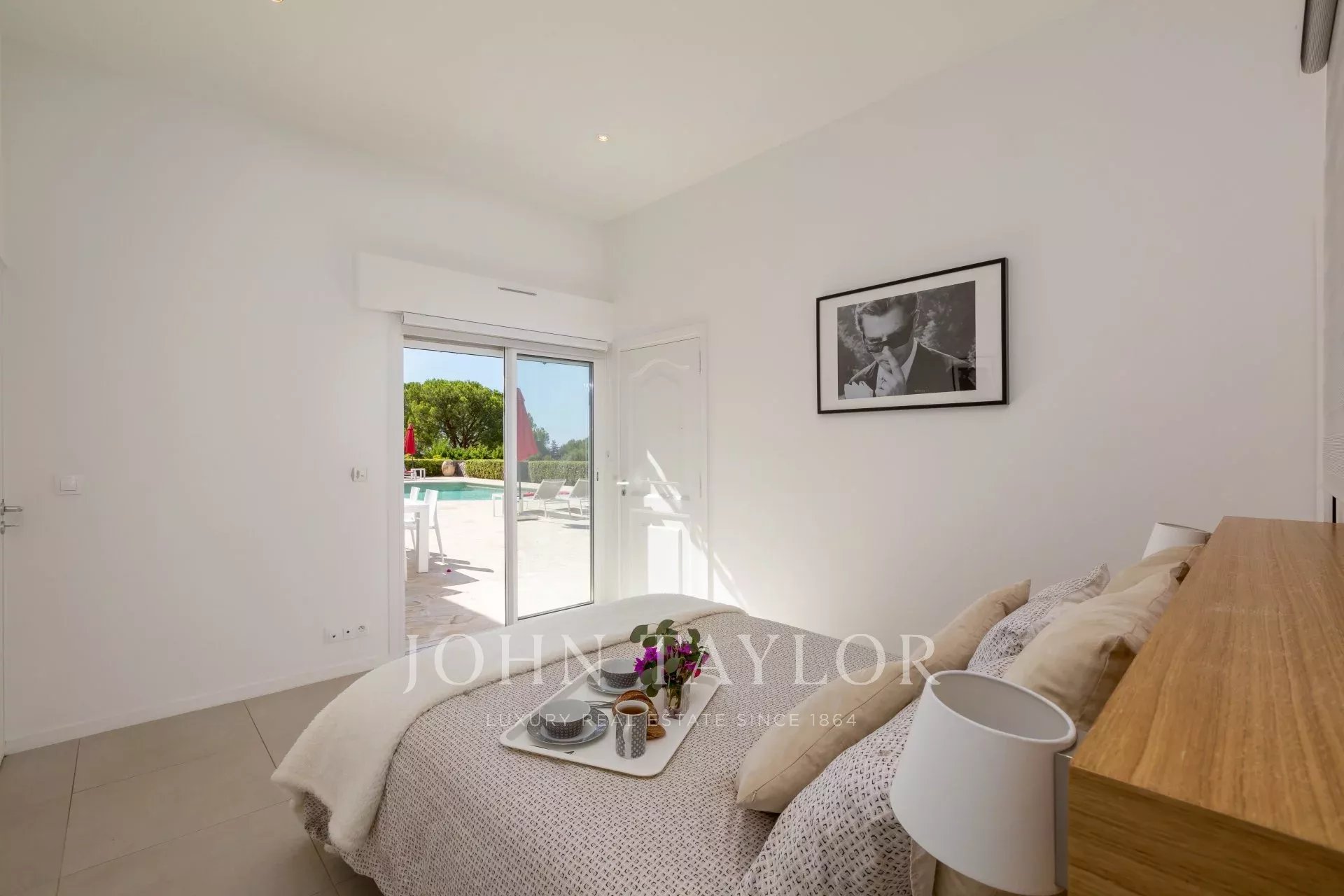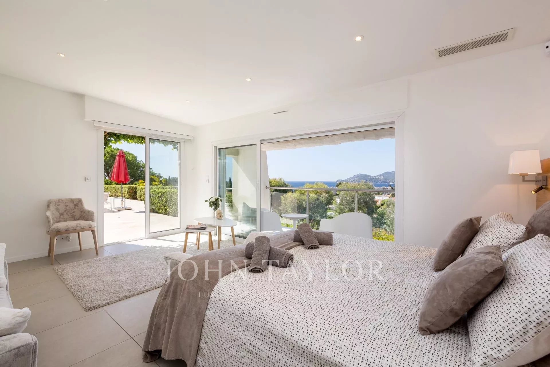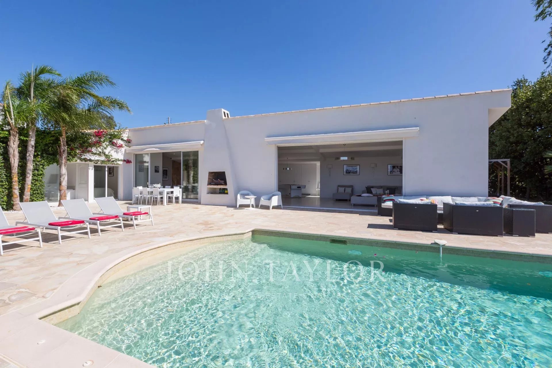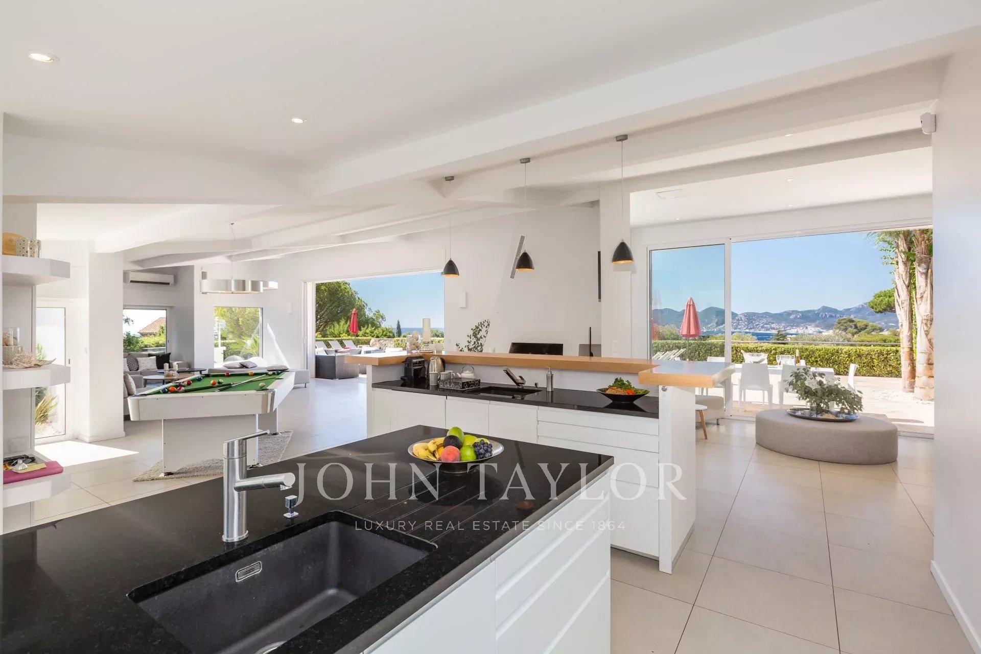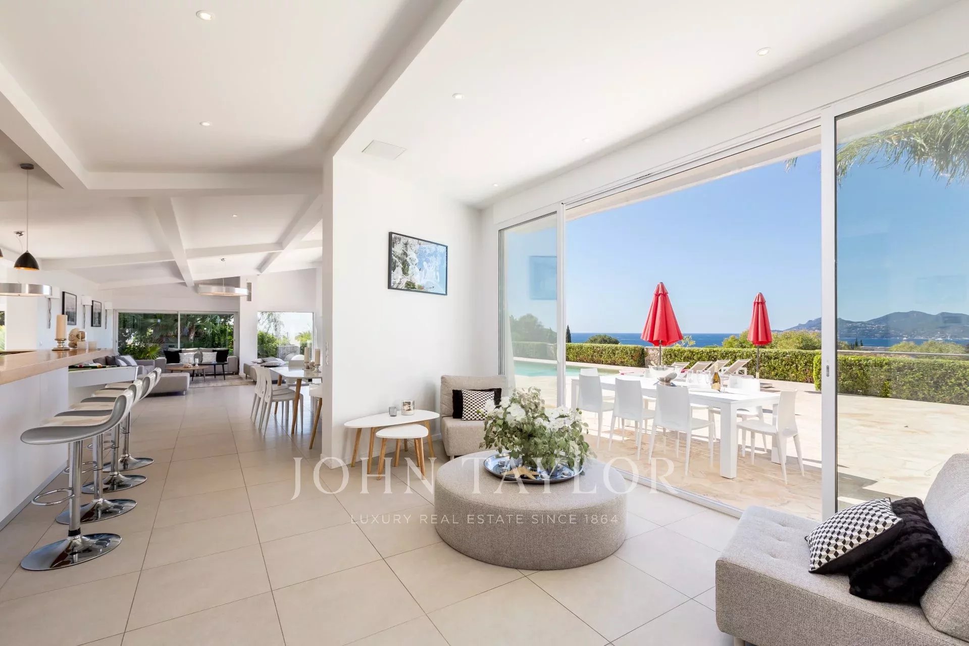 Entrance hall giving onto an open plan kitchen fully equipped, a beautiful living and dining room with fireplace, all opening onto the terrace and the swimming-pool, sea view.