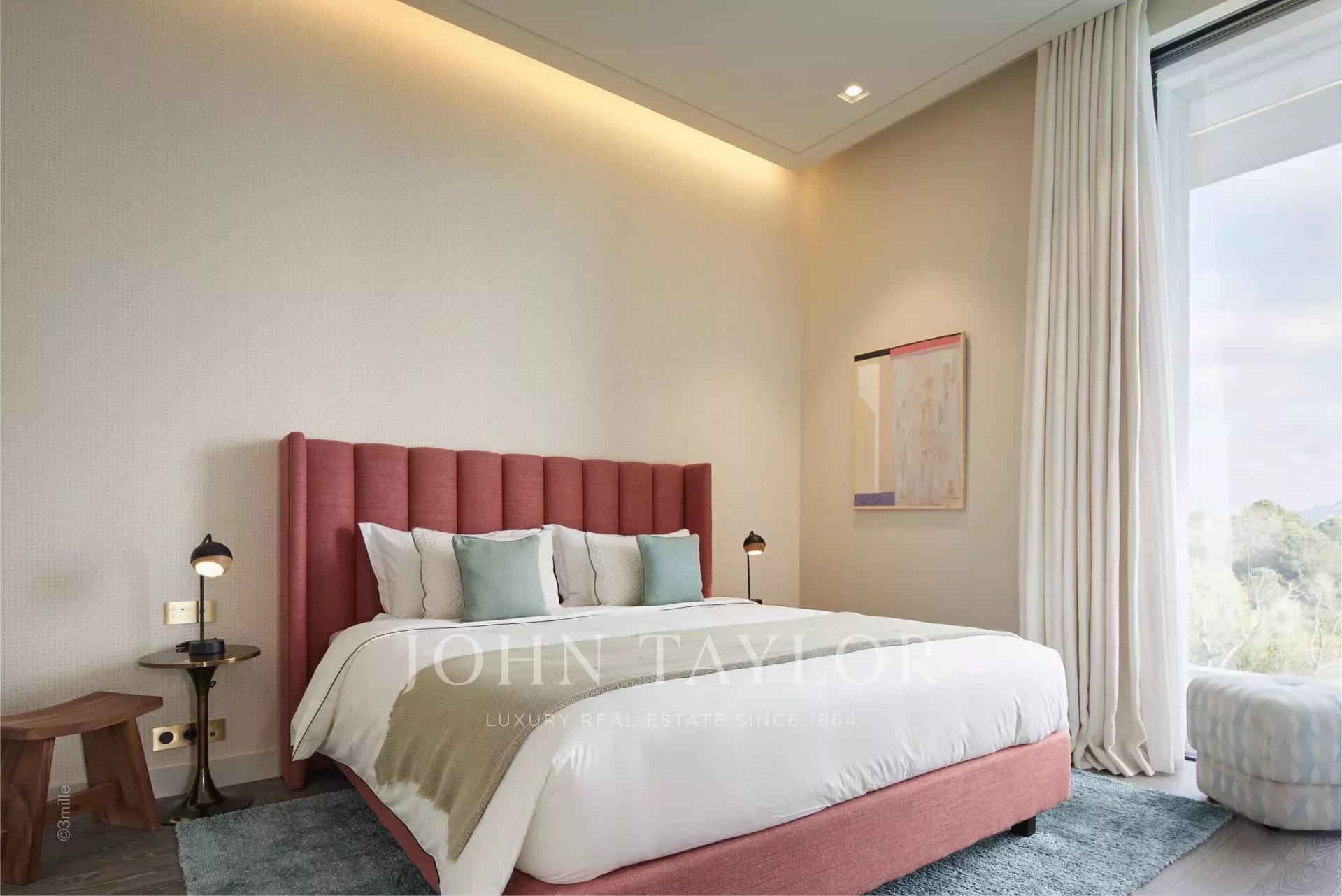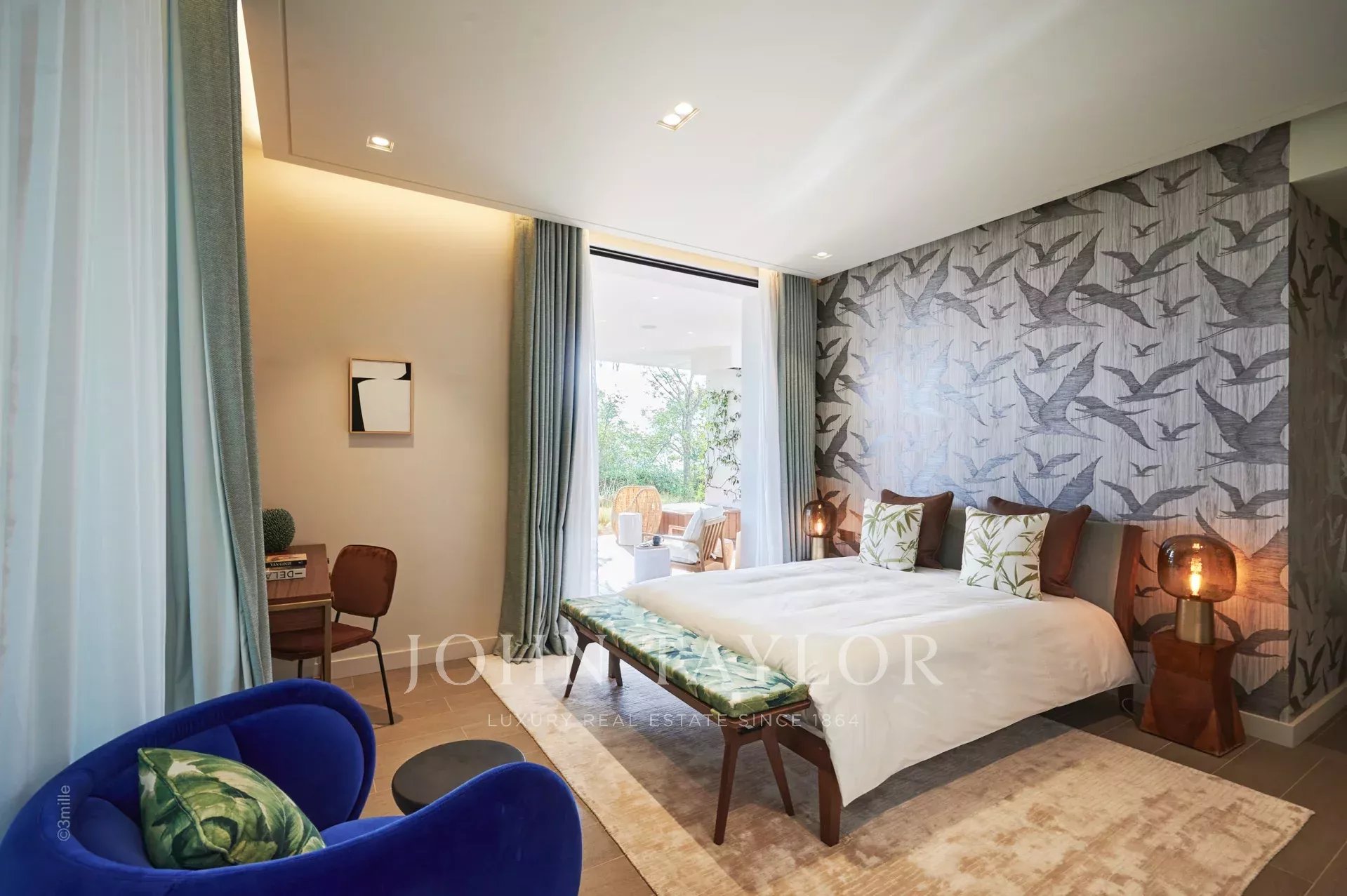 Luxury amenities abound, both indoors and outdoors, with a heated pool of 18 meters in length, outdoor fireplaces, landscaped gardens, sun loungers, an outdoor lounge, and a kitchen equipped with a barbecue. The rooftop offers breathtaking panoramic views of Cannes Bay, Le Suquet, and the Lérins Islands, while indoor amenities include a hammam, a sauna, a heated jacuzzi, a fitness room, a cinema/projection room, an aquarium, a panoramic elevator, two fireplaces, a fully equipped laundry room, two kitchens including a professional one, a dedicated internet line, iPads available, a centralized speaker system, video surveillance, and an alarm system for absolute peace of mind.
