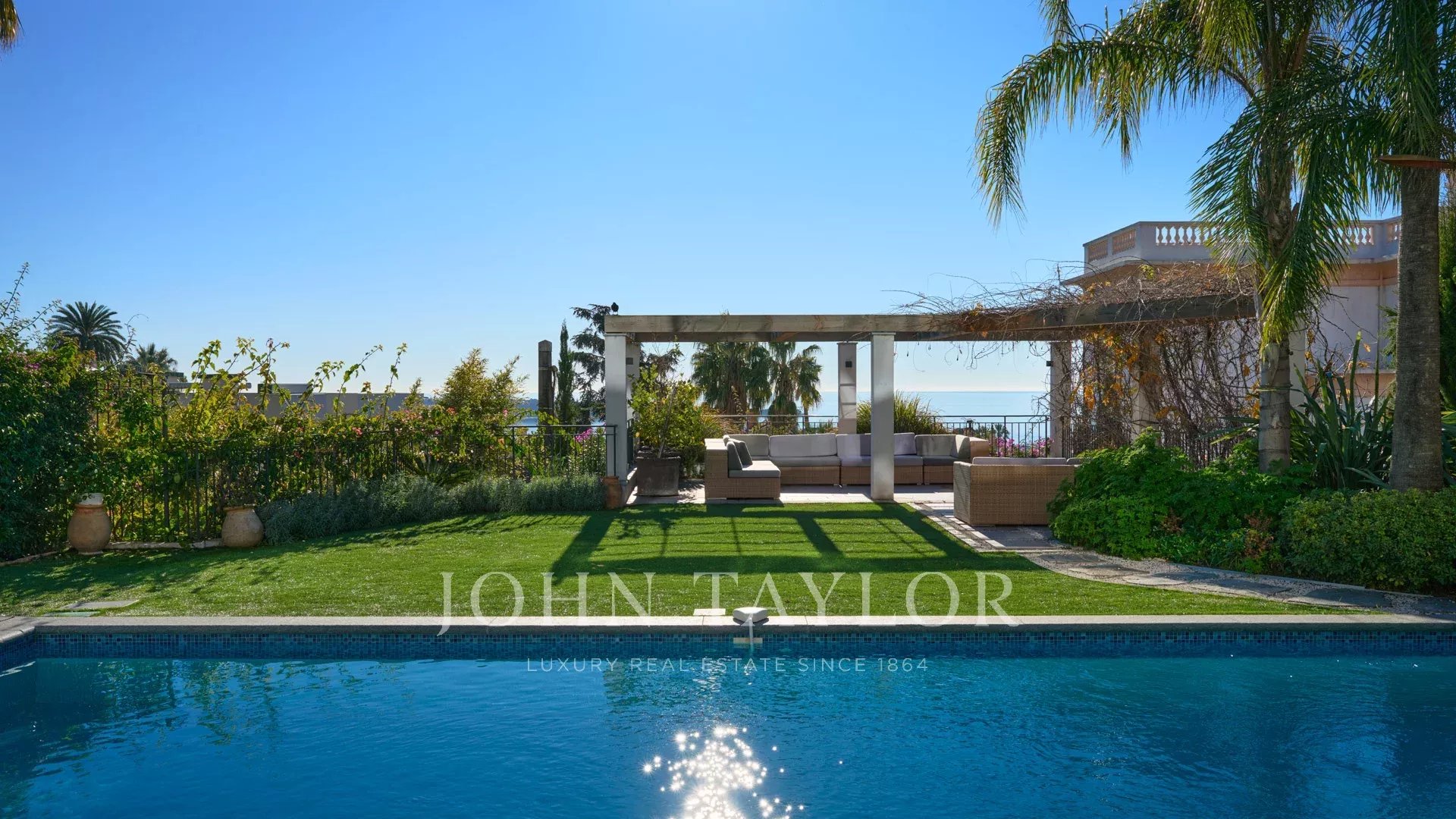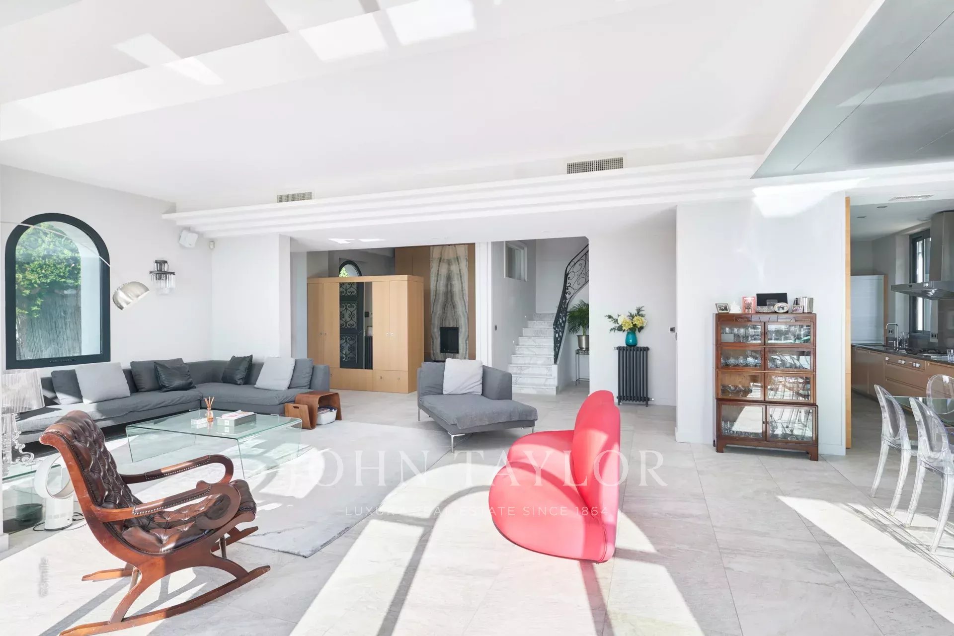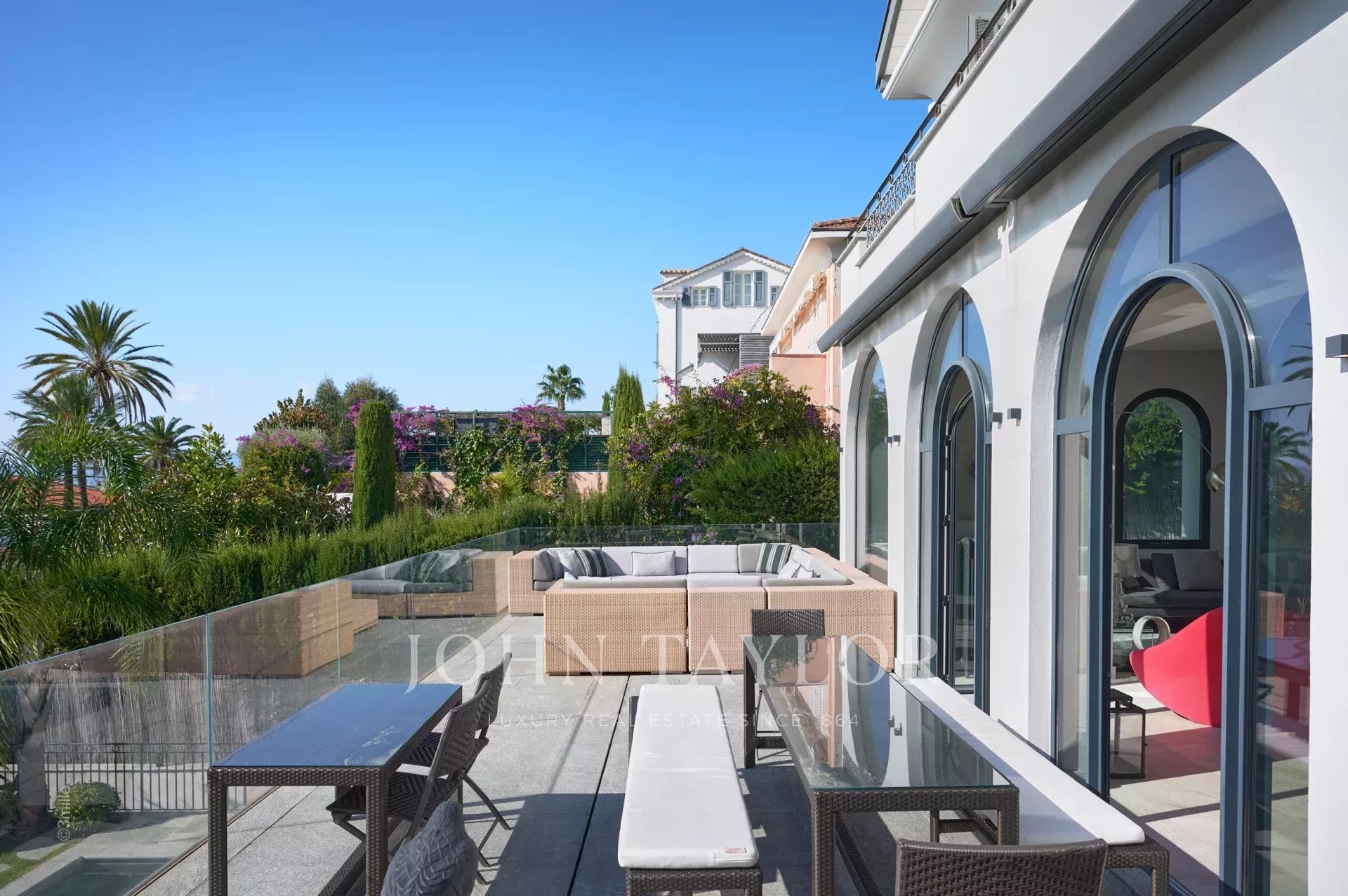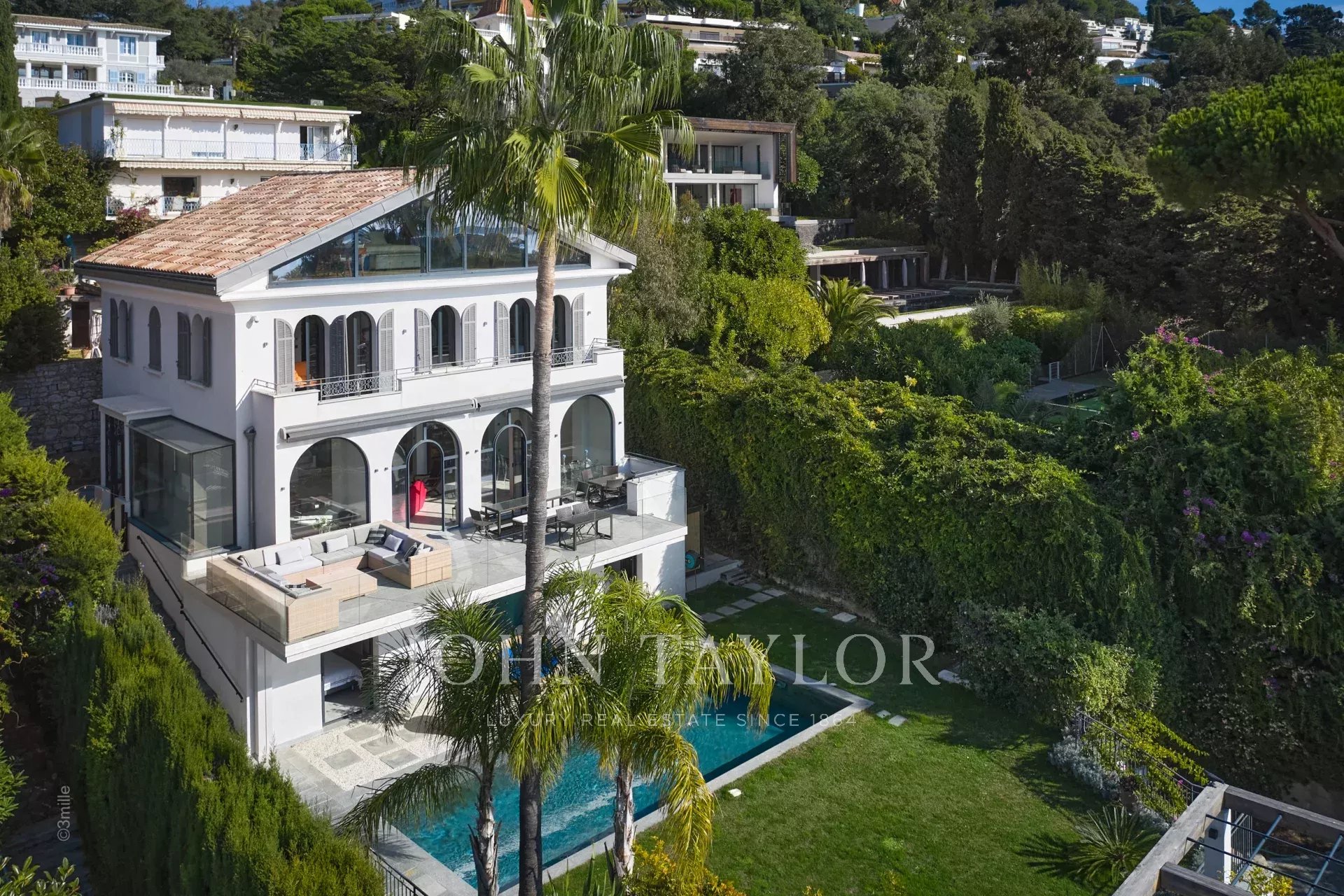 In the heart of the Californie area, 15 minutes walking distance from the centre of Cannes and 5 minutes by car from the Croisette, an attractive private mansion dating from 1925. Completely renovated and air-conditioned, it benefits from a southern exposure and offers a superb view of the bay of Cannes and the Lérins Islands.