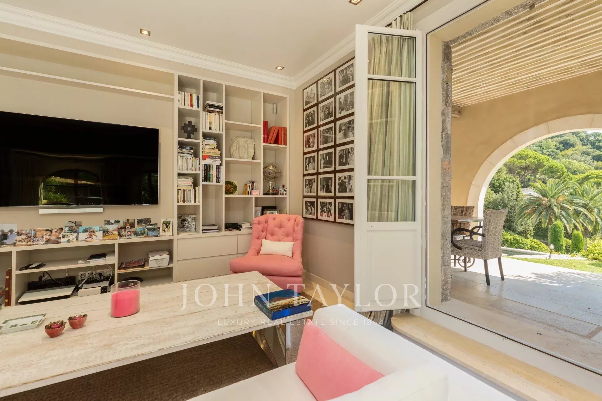 Large living room with TV/office opening onto the terrace and swimming-pool with dining room and fully equipped summer kitchen (hob, dishwasher, fridge, BBQ).