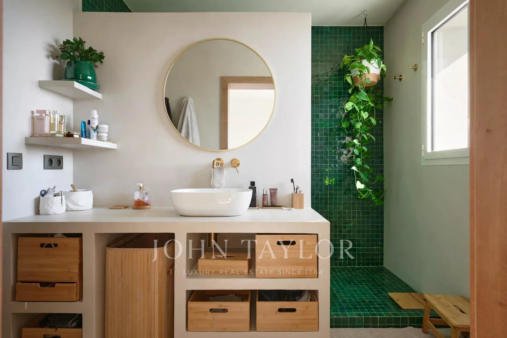 The main level hosts several bedrooms, including one with direct access to the garden-level terrace, as well as another bedroom that can be fully independent, complete with its own access and a charming private patio terrace. A vestibule with guest toilets completes this floor.