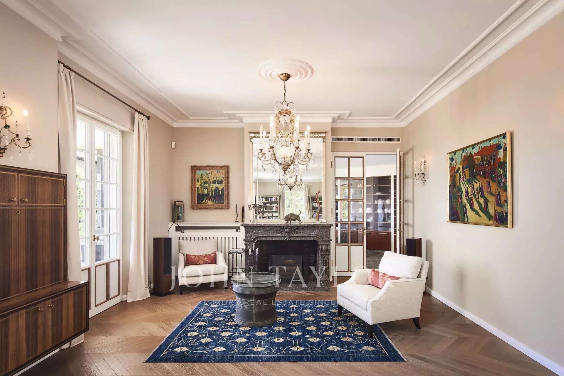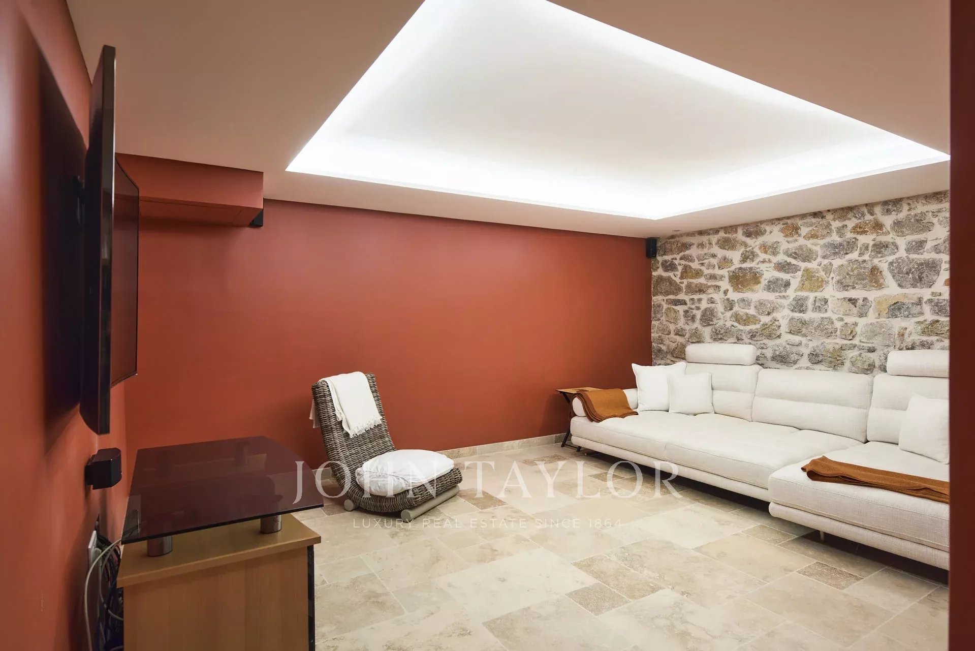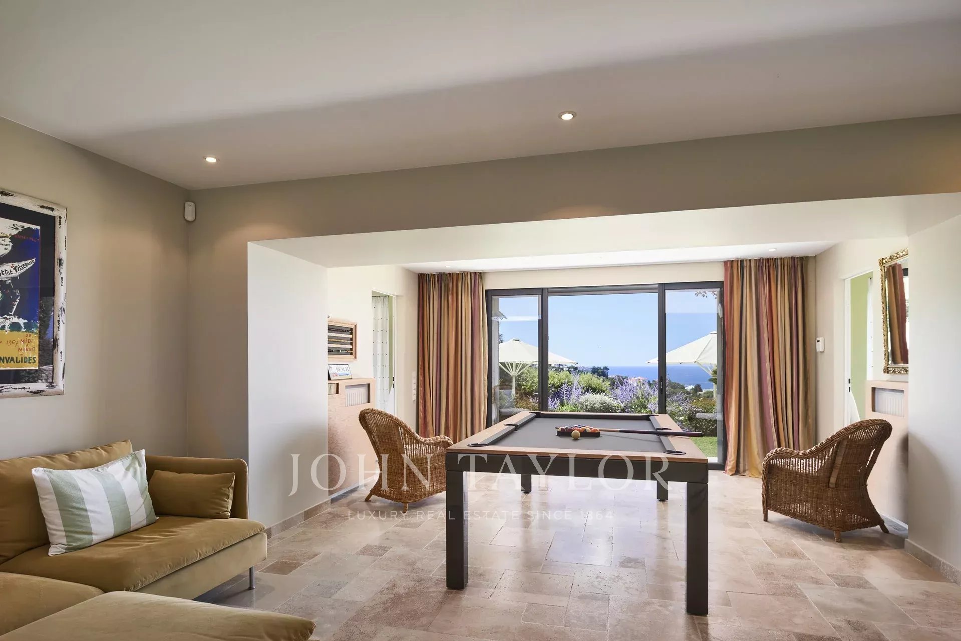 Double air conditioned living room of about 110 sq.m (flat screen TV, audio system Sonos) with fireplace, opening onto the main terrace, summer lounge, sea view