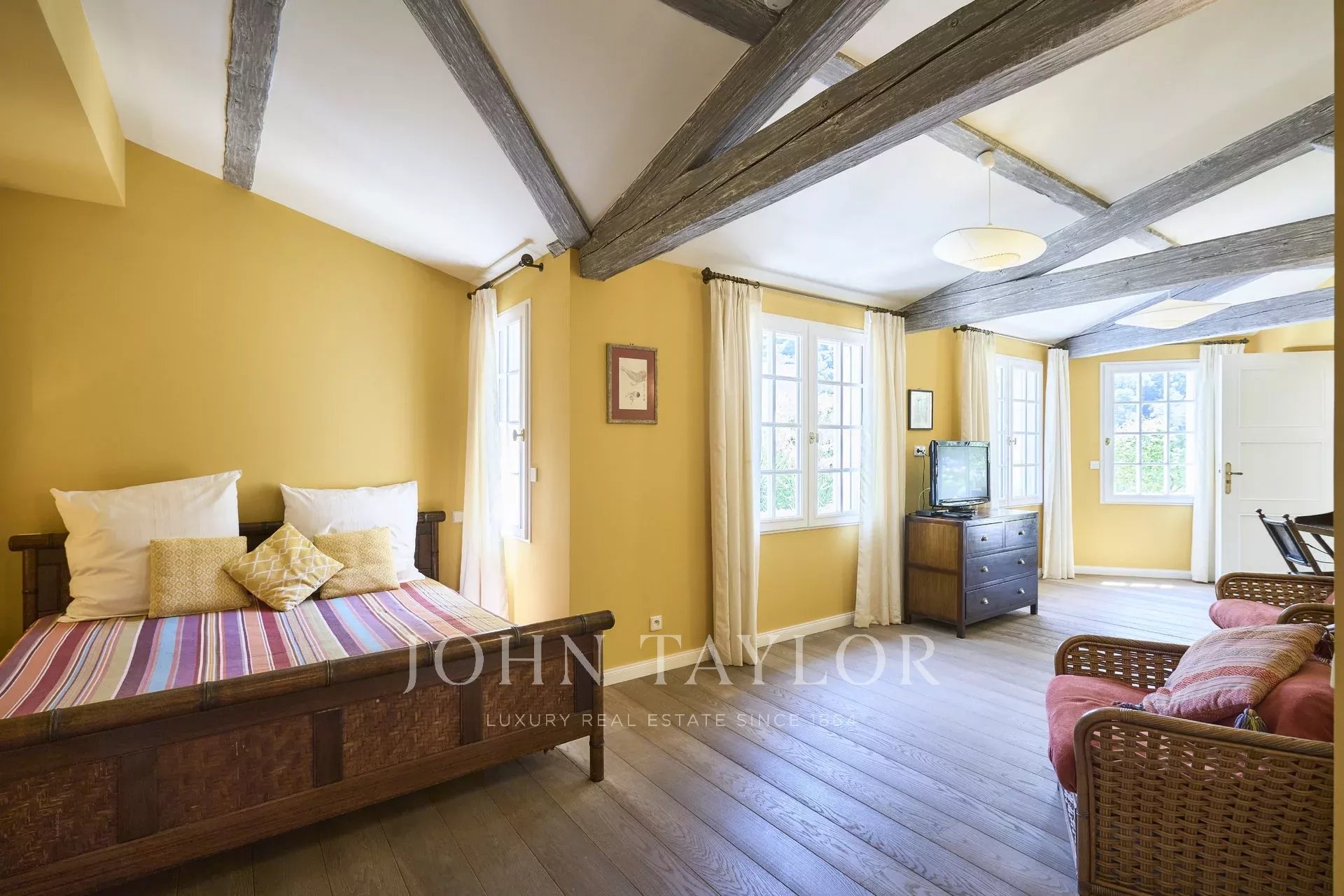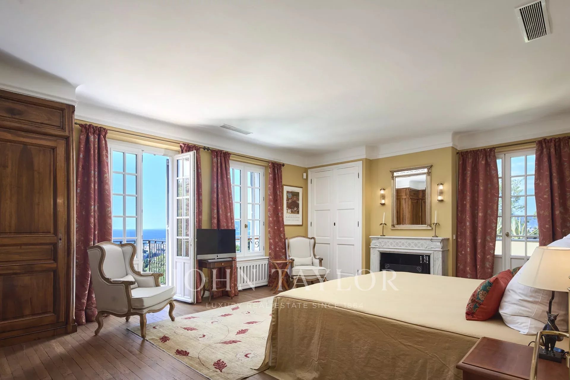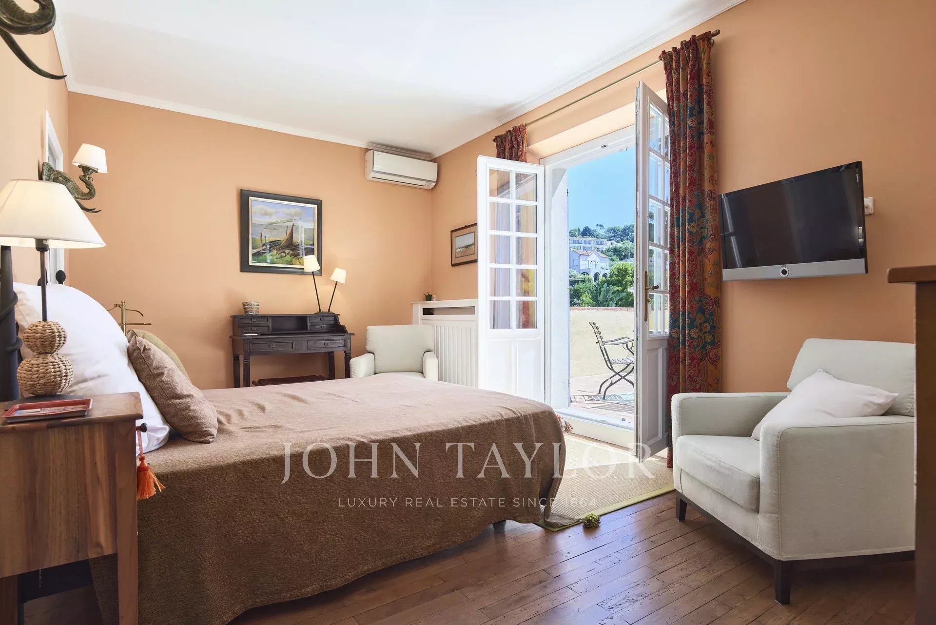 Air-conditioned Master bedroom (double bed, TV) with fireplace, bathroom / WC