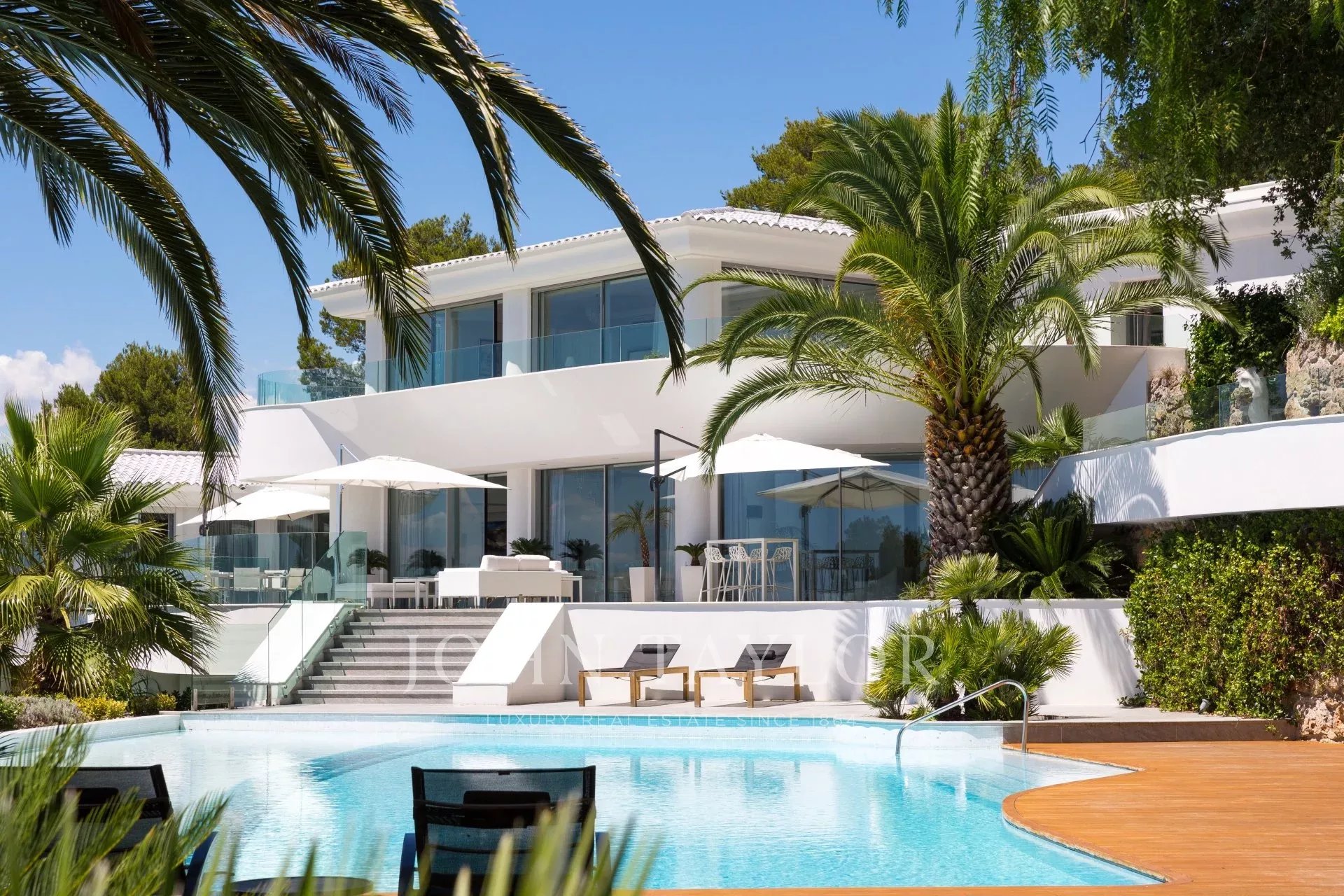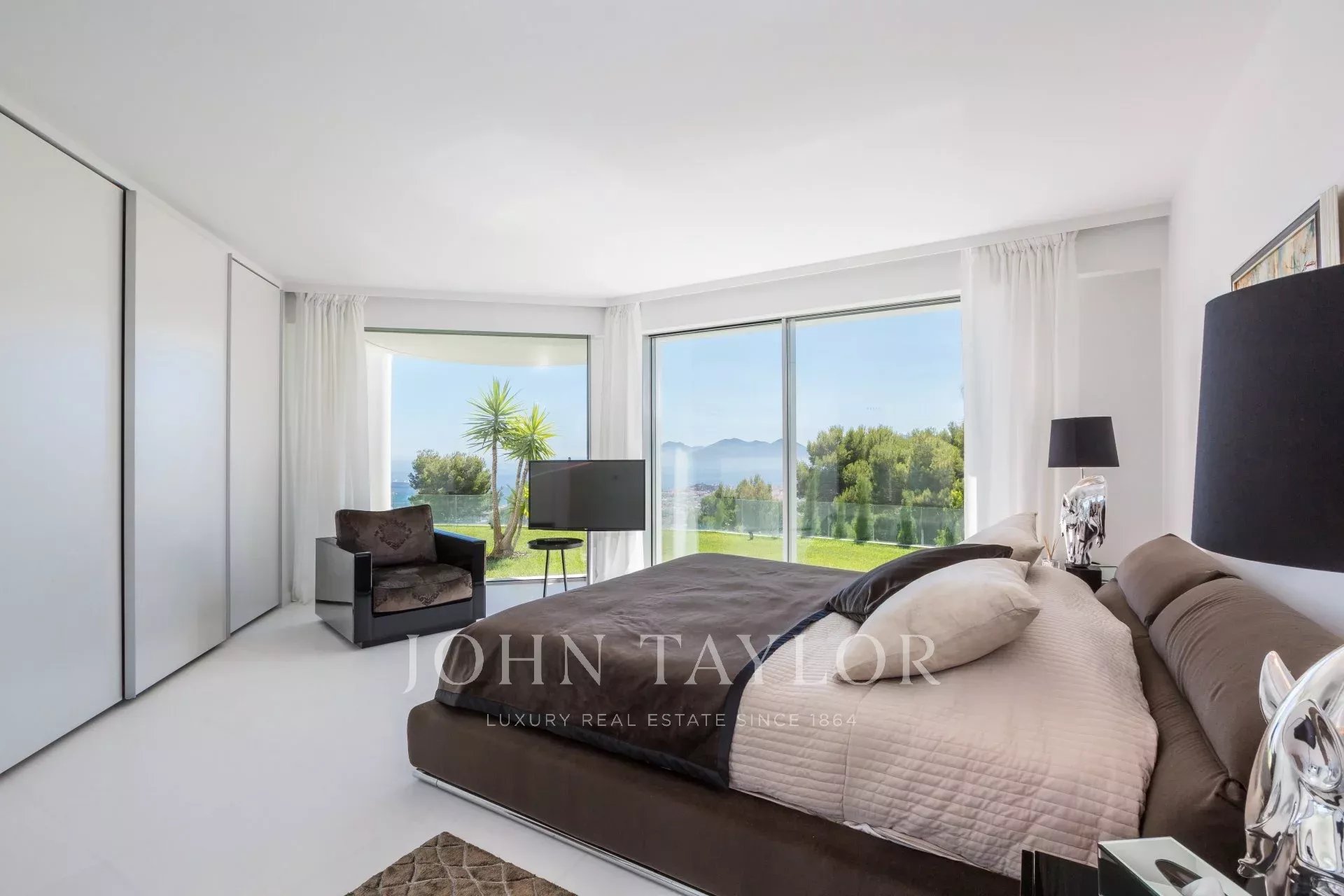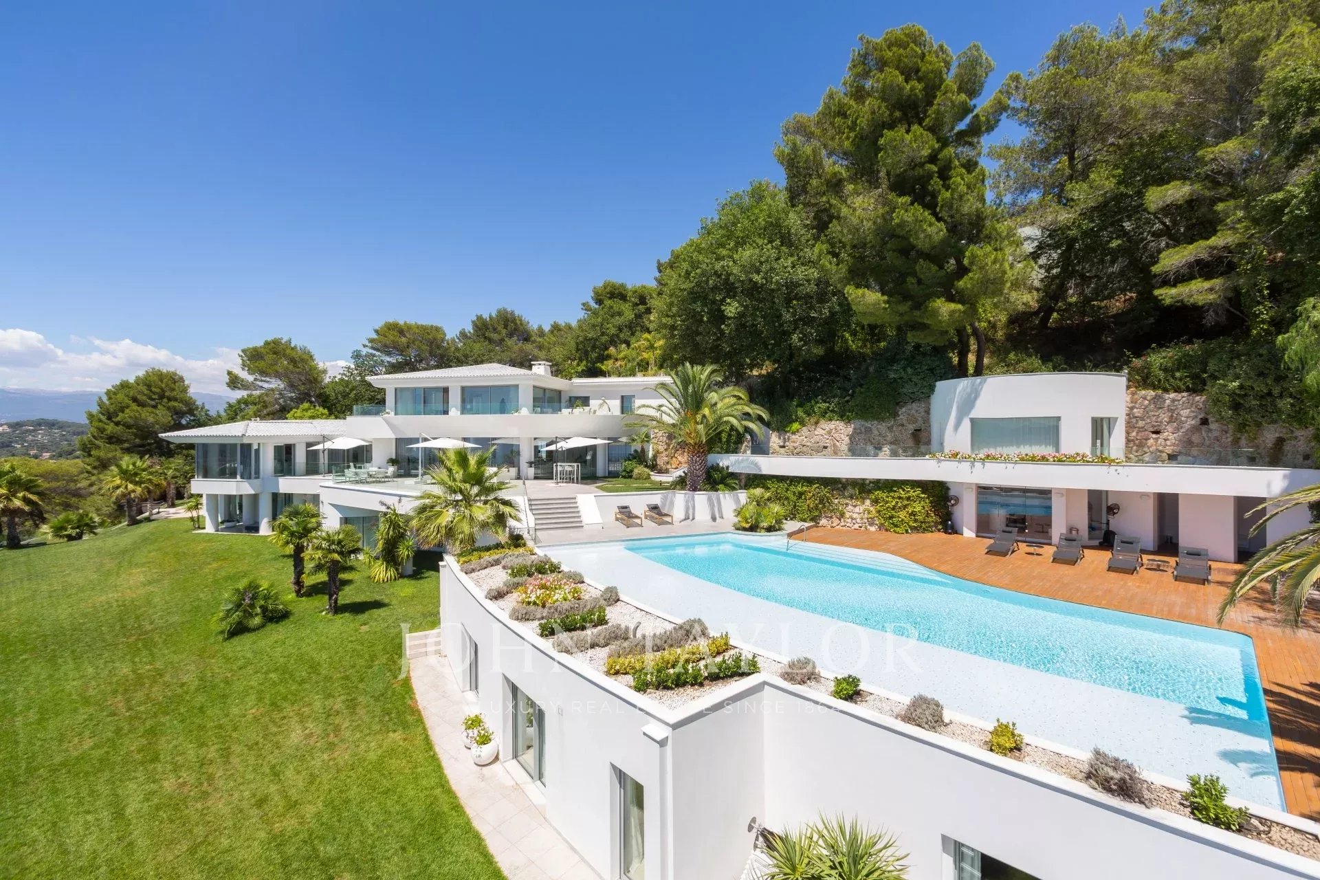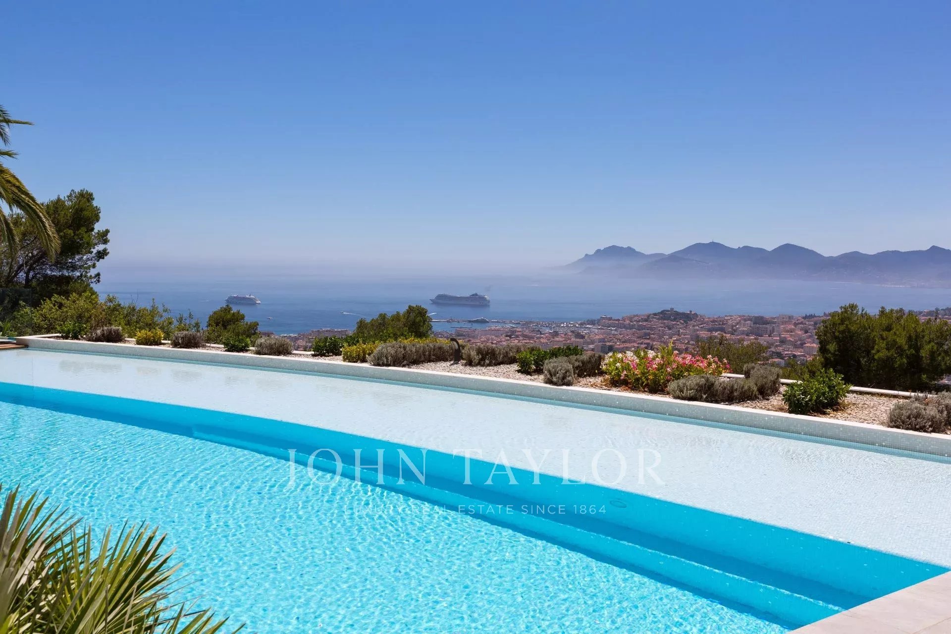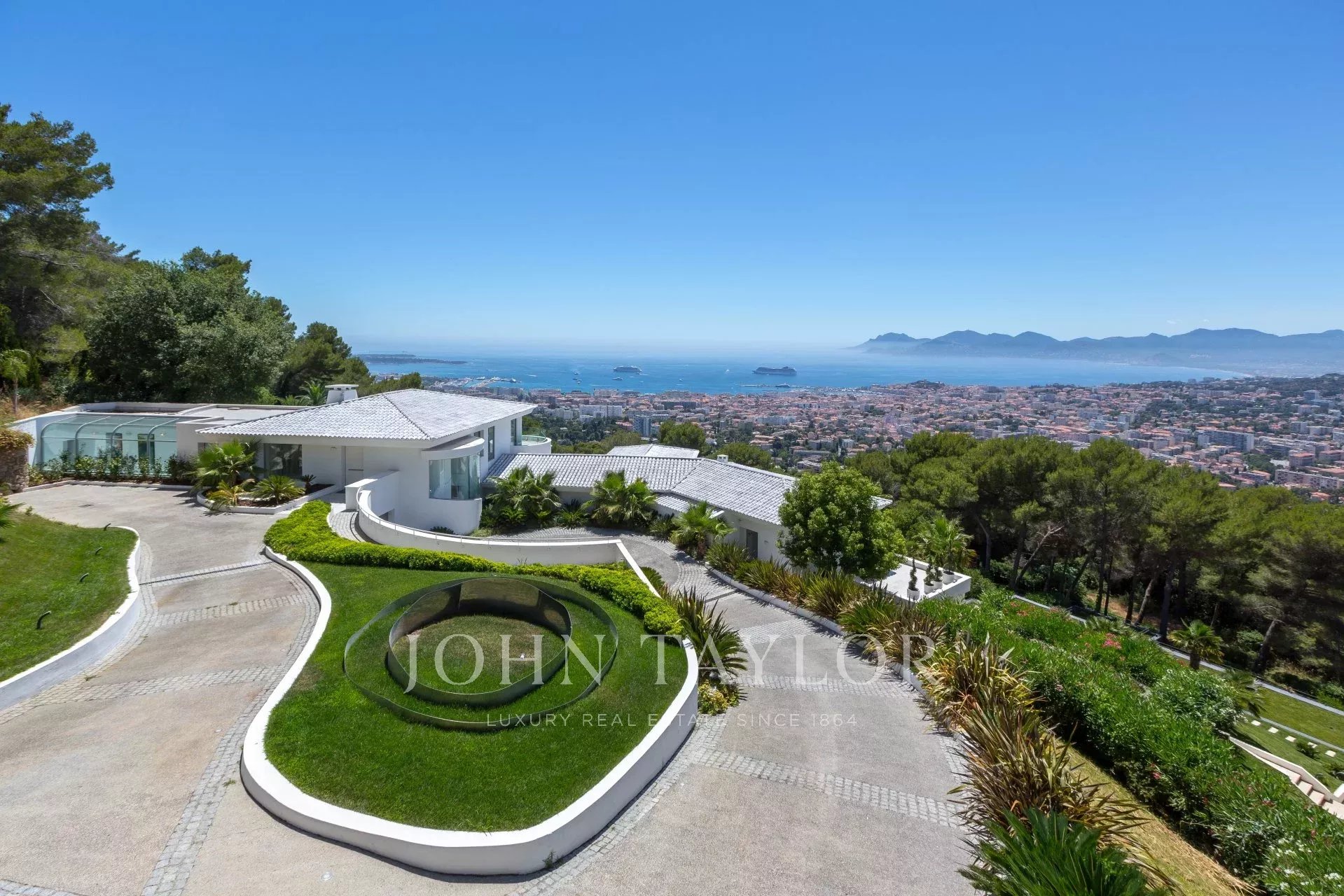 On the heights of Cannes, overlooking the Bay, exceptional and unique property of over 2 000 sq.m living area surrounded with approximately 13 750 sq.m grounds with 2 different accesses by car and sea view from all bedrooms.