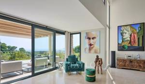 Large and bright reception area with TV corner and lounge with triple exposure and opening onto two terraces equipped with lounge and summer dining room, overlooking the bay of Cannes