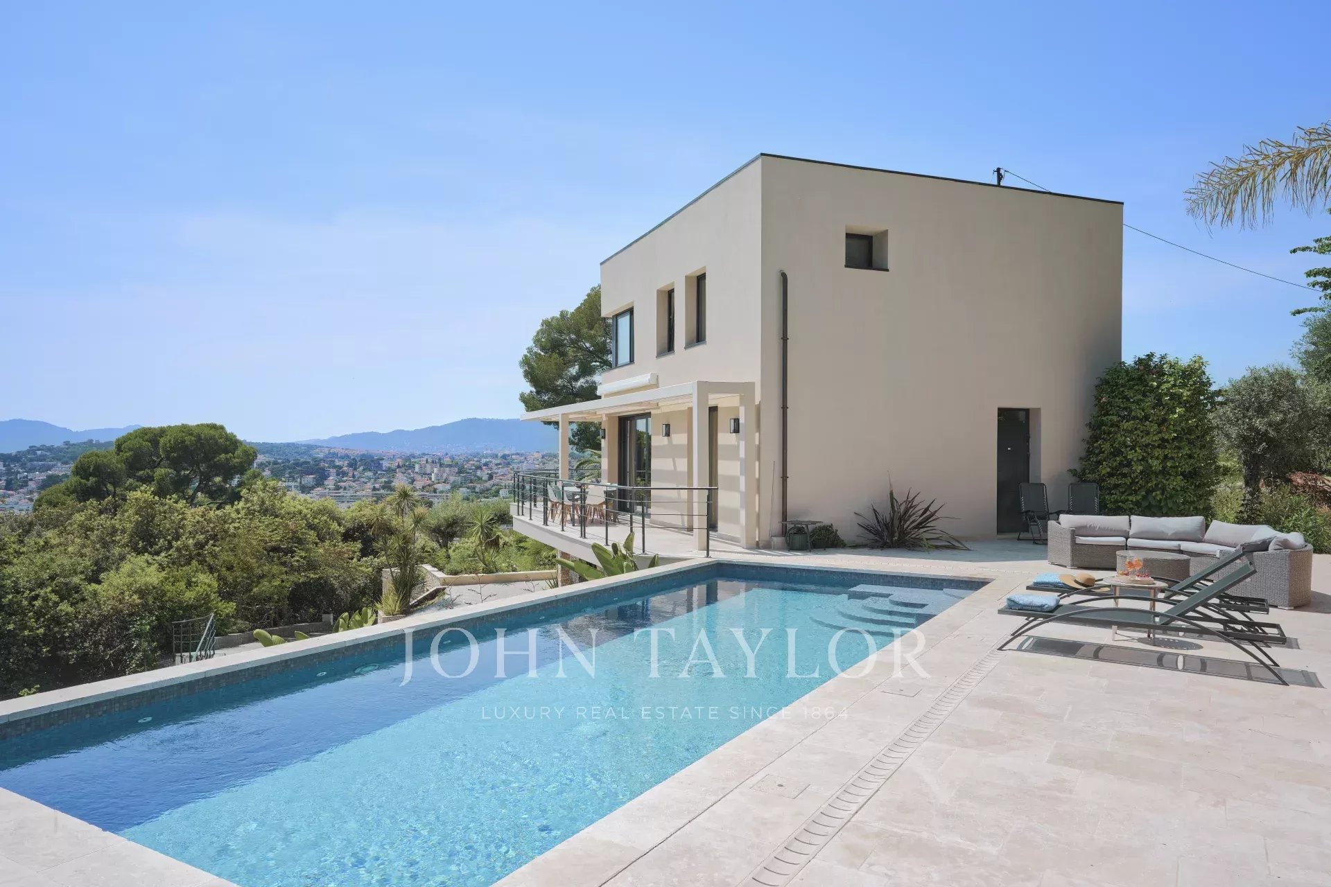 Located on the heights of Cannes in a quiet residential area, 10 minutes from the city centre of Cannes, very attractive contemporary villa of about 300 sq.m fully renovated with top of the range appointments throughout.