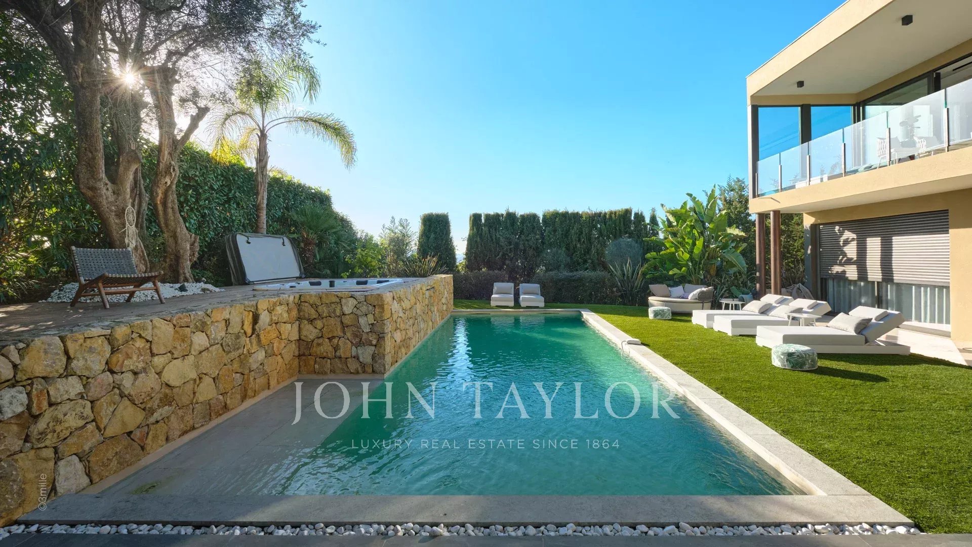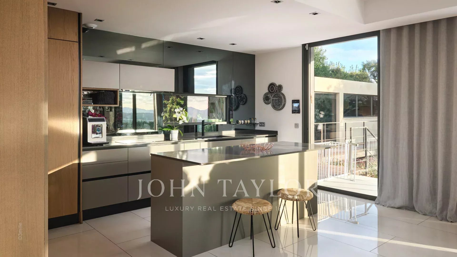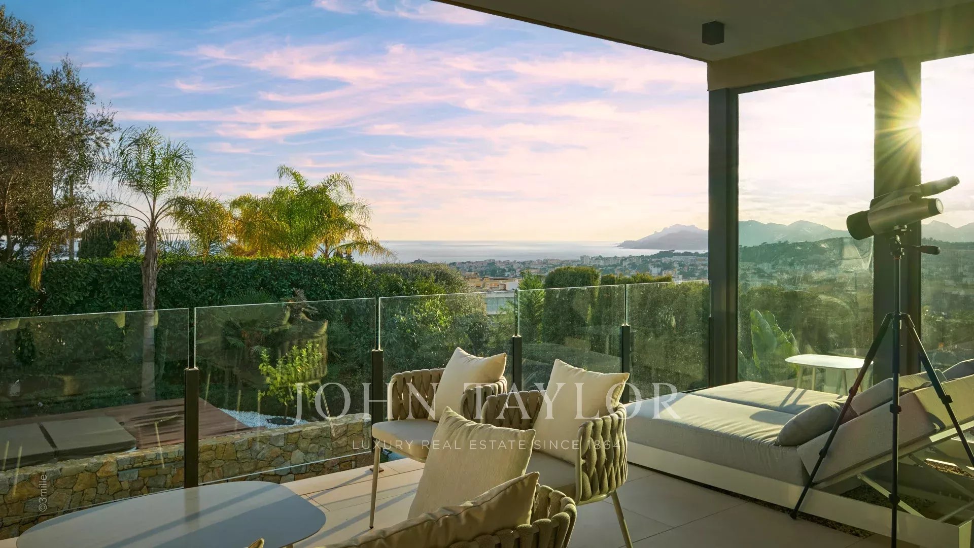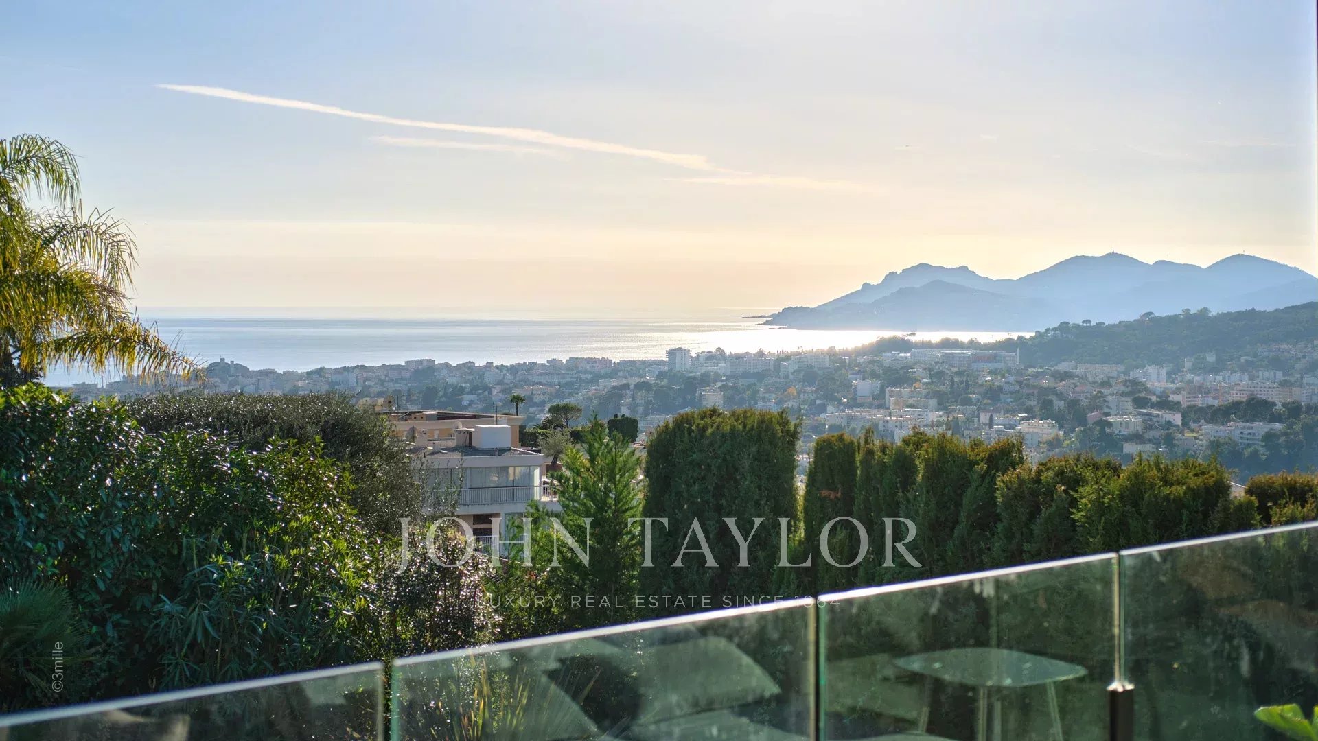 Nestled on the heights of Cannes, in the heart of a 1200 sq.m land, this superb contemporary villa offers a beautiful panorama of the sea and the Lérins Islands.
