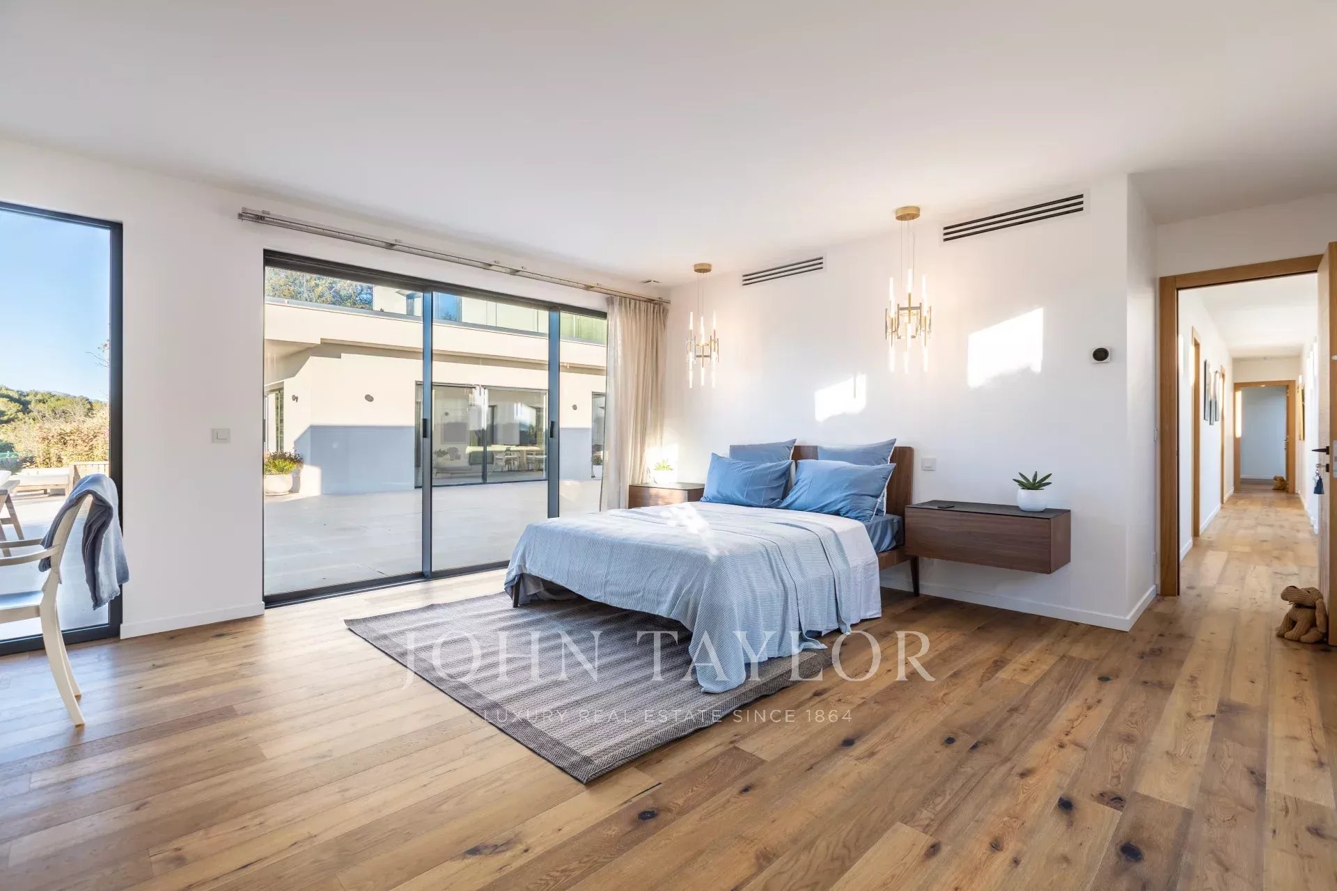 The main villa, inspired by Californian architecture, spans over 550 m² and impresses with its generous volumes and natural light. It includes a spectacular 120 m² double living area, a fully equipped kitchen with central island and dining space, and six en-suite bedrooms. The top floor hosts a magnificent 90 m² master suite complete with a walk-in closet, luxurious bathroom, and access to a spacious terrace with breathtaking views of the Estérel hills and a glimpse of the sea.