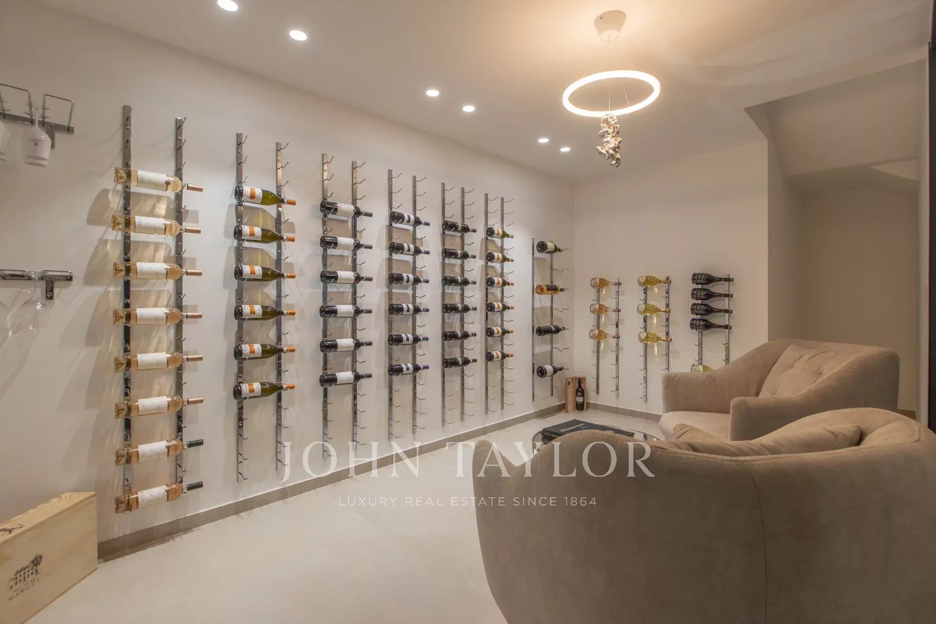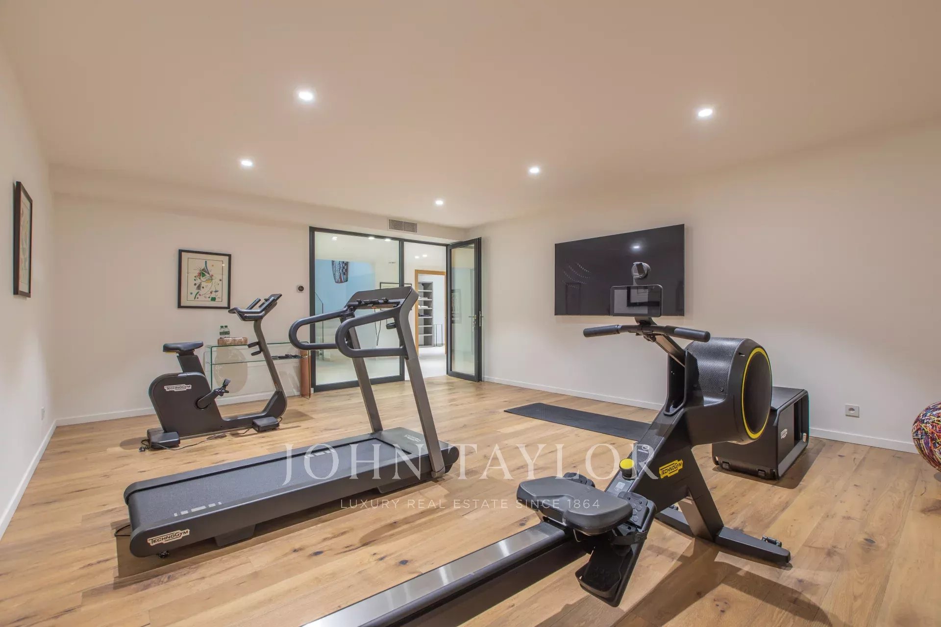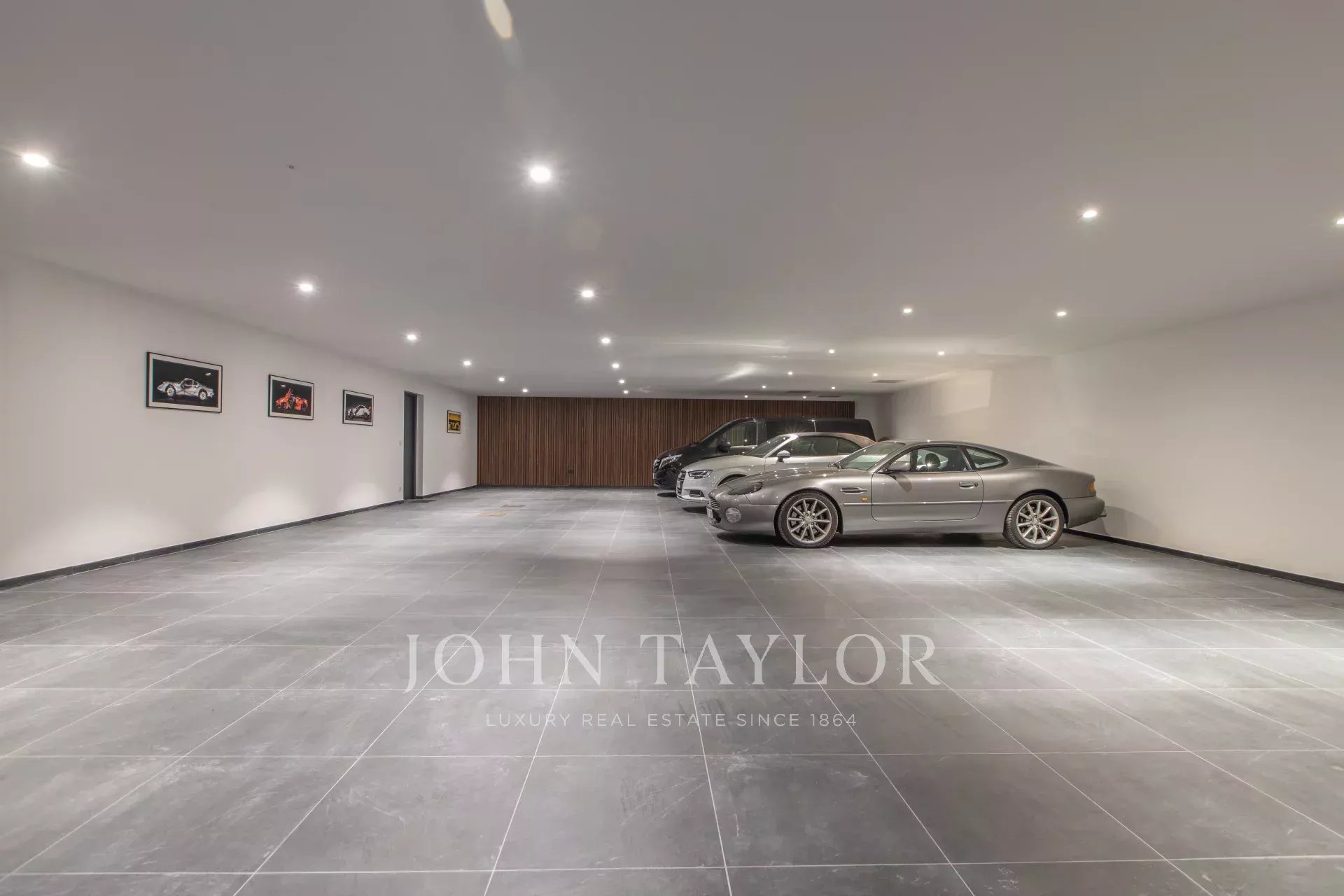 The lower level is dedicated to leisure and wellness, featuring a Technogym-equipped fitness room, a game room with billiards, a wine cellar, laundry facilities, and an exceptional 250 m² garage that can accommodate up to 12 cars.