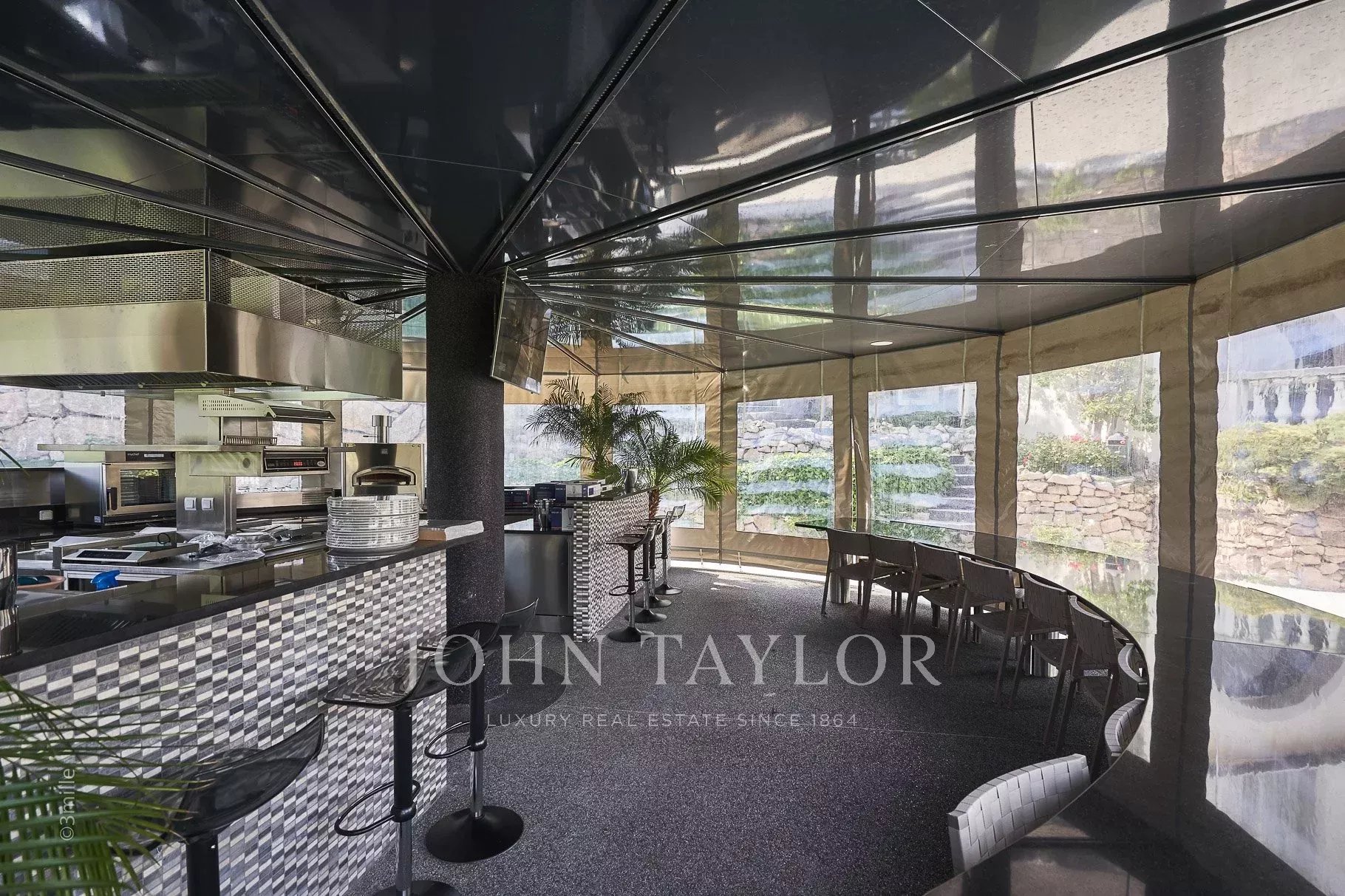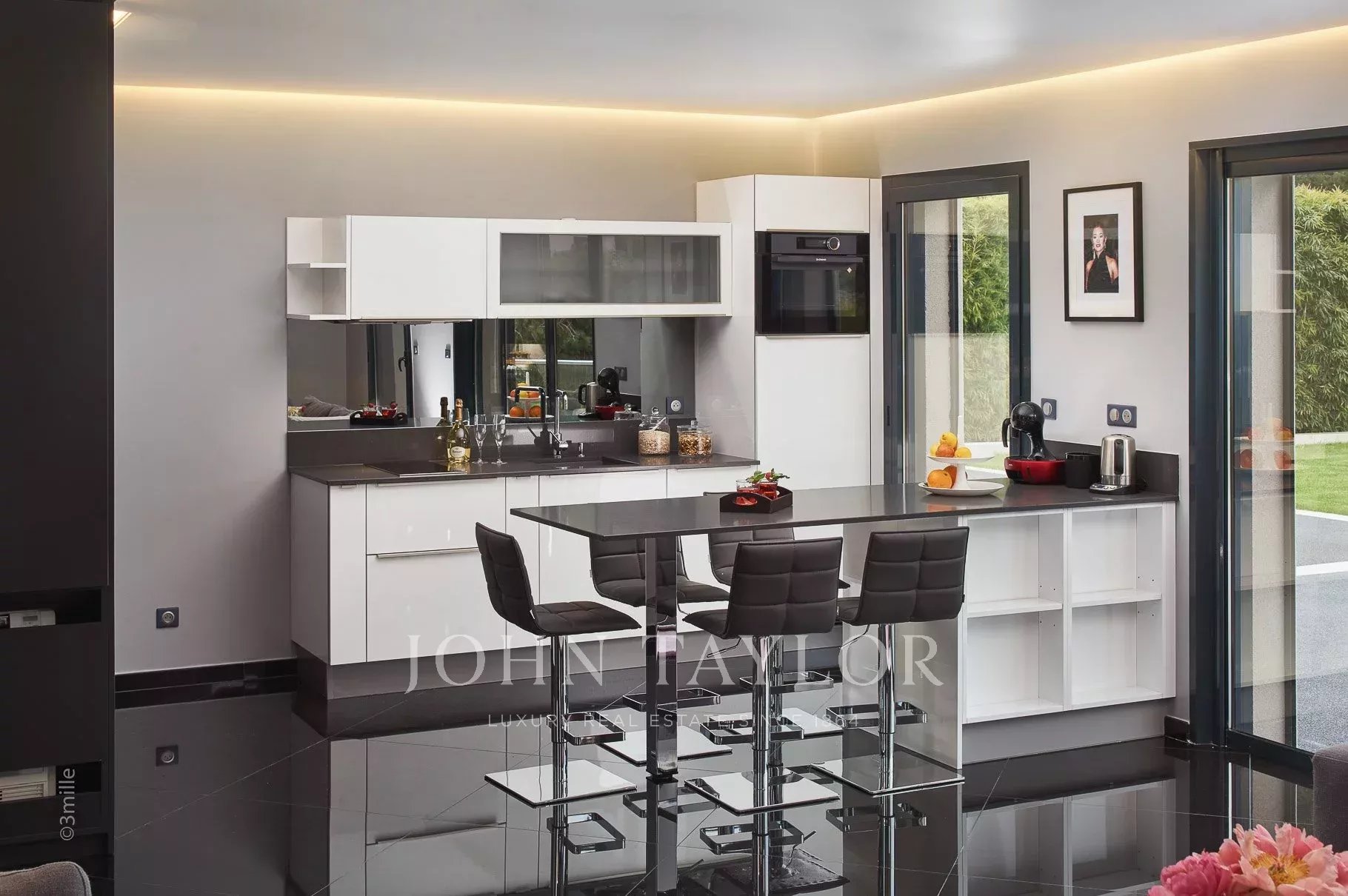 Professional kitchen equipped with an outdoor barbecue and opening onto terrace, perfect for breakfast