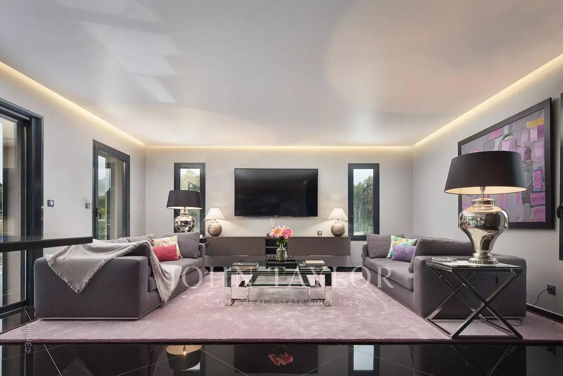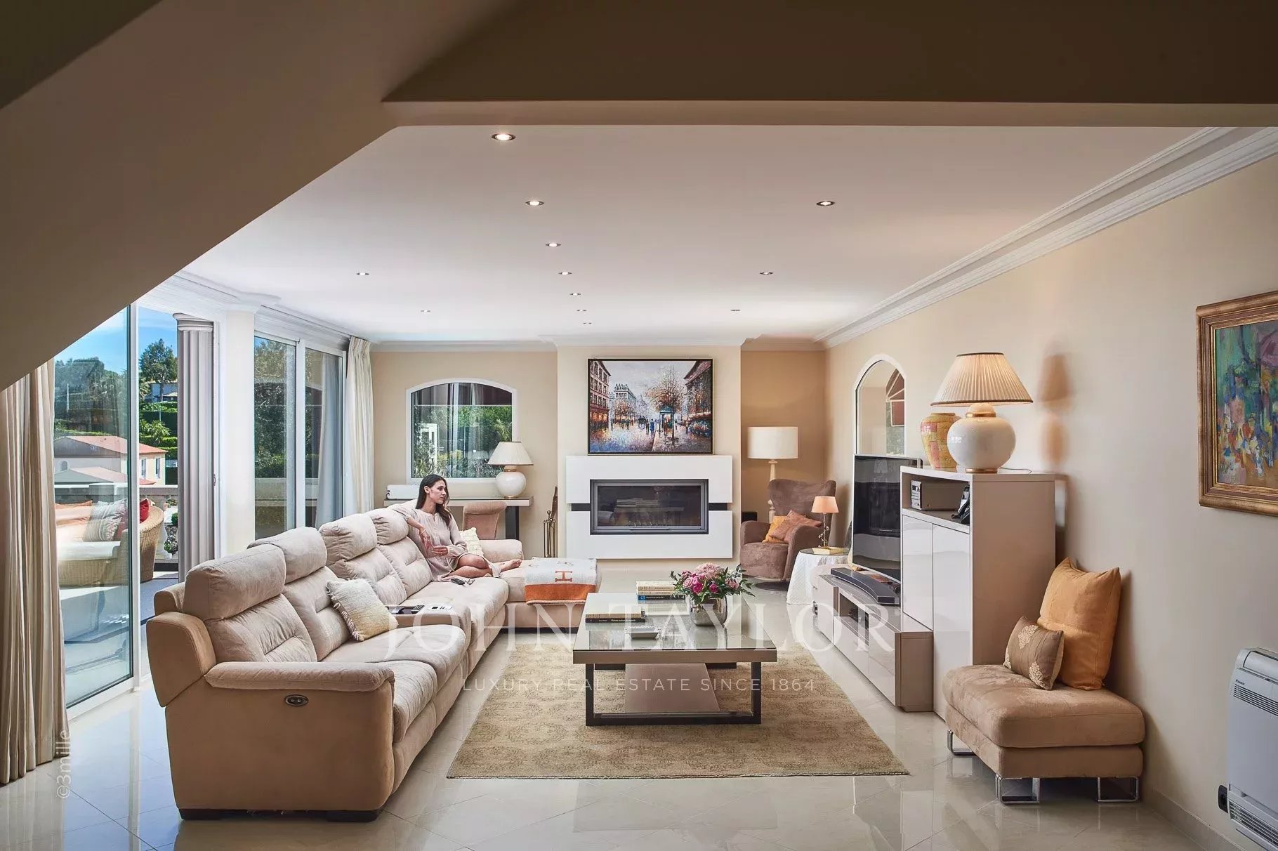 Living room with fireplace, equipped with a large plasma screen, opening onto a large terrace with sea and montain views, equipped with summer lounge