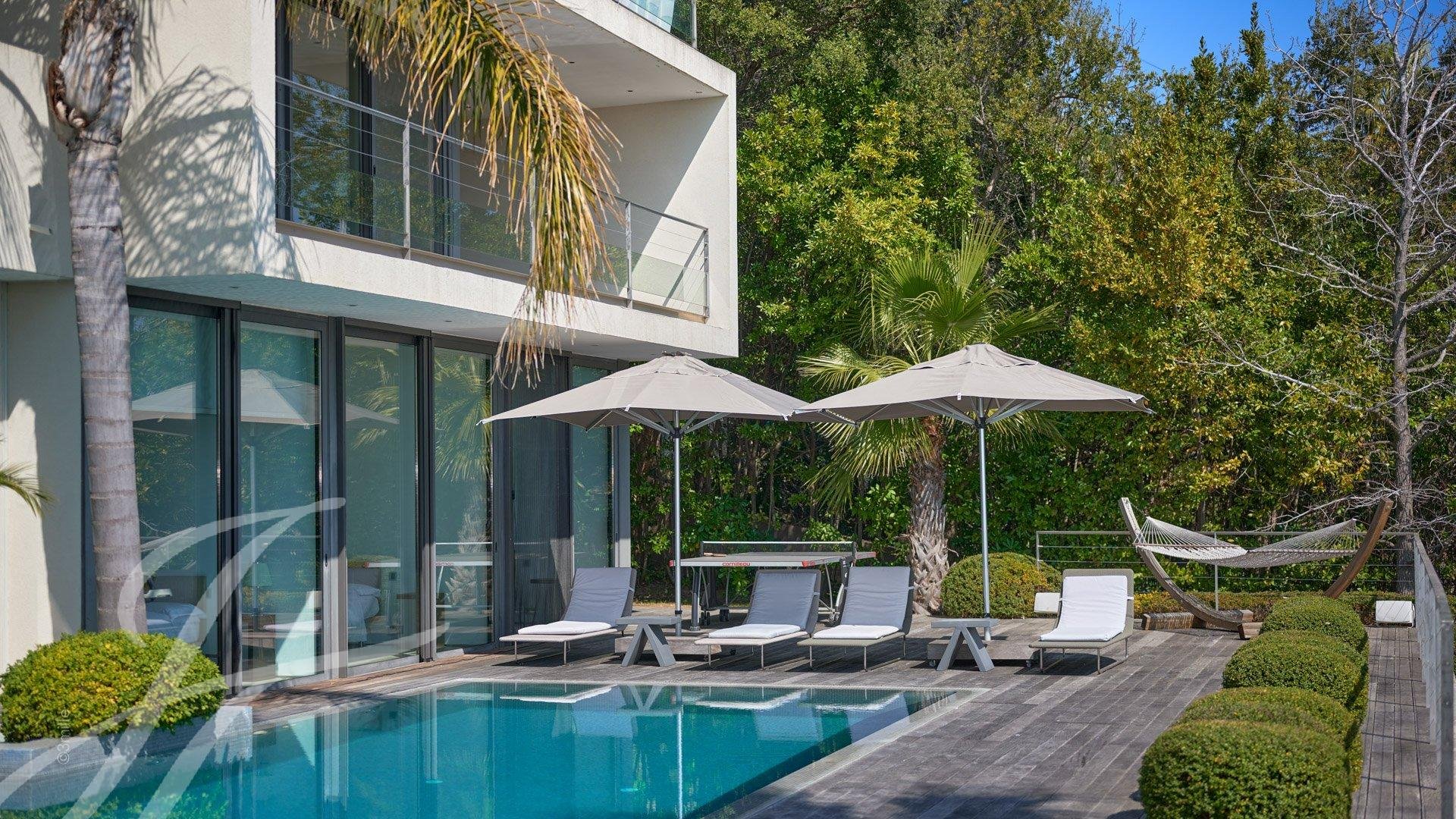 The villa boasts a swimming pool, part of which is covered and can be heated, as well as an outdoor shower.