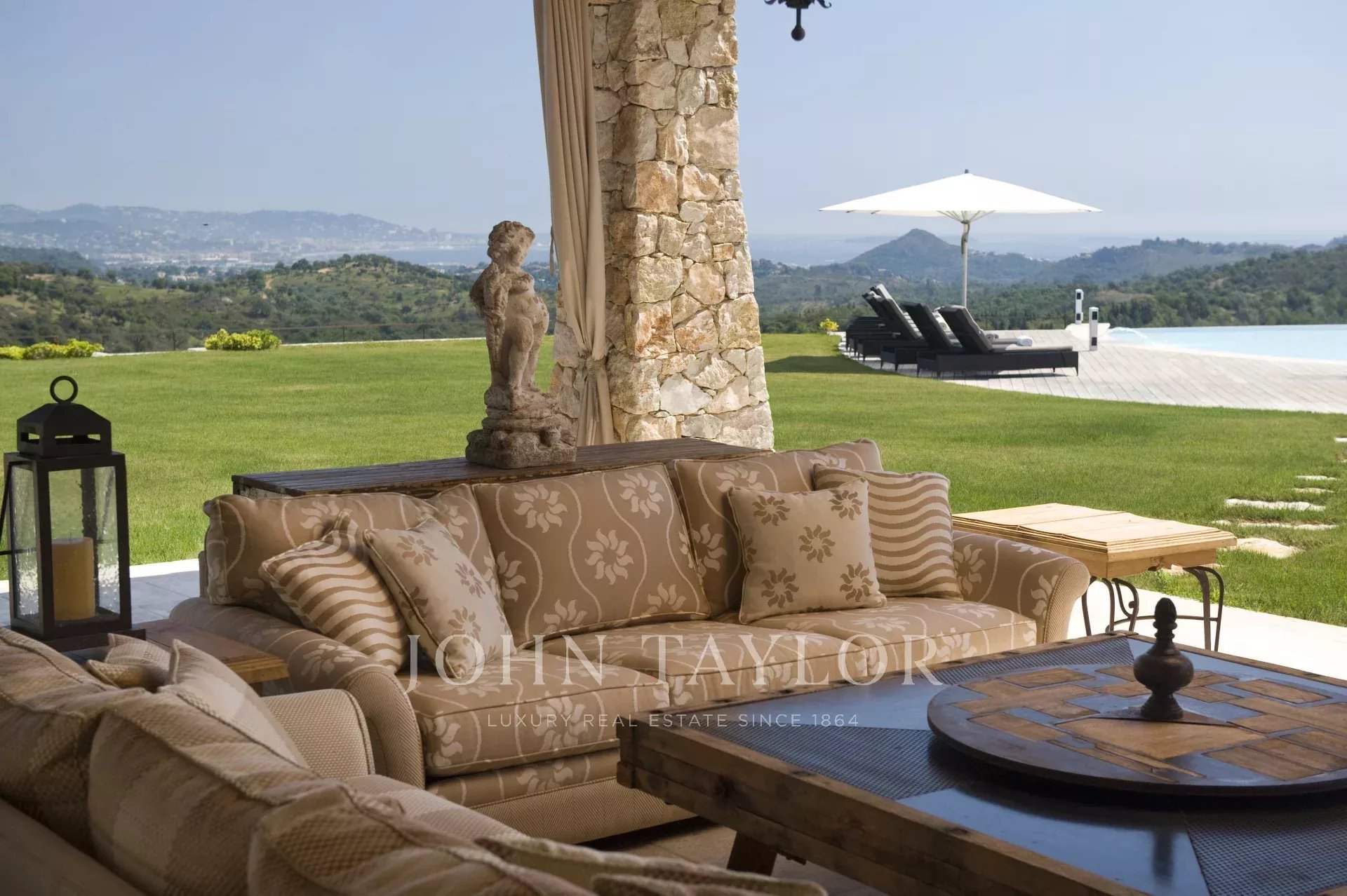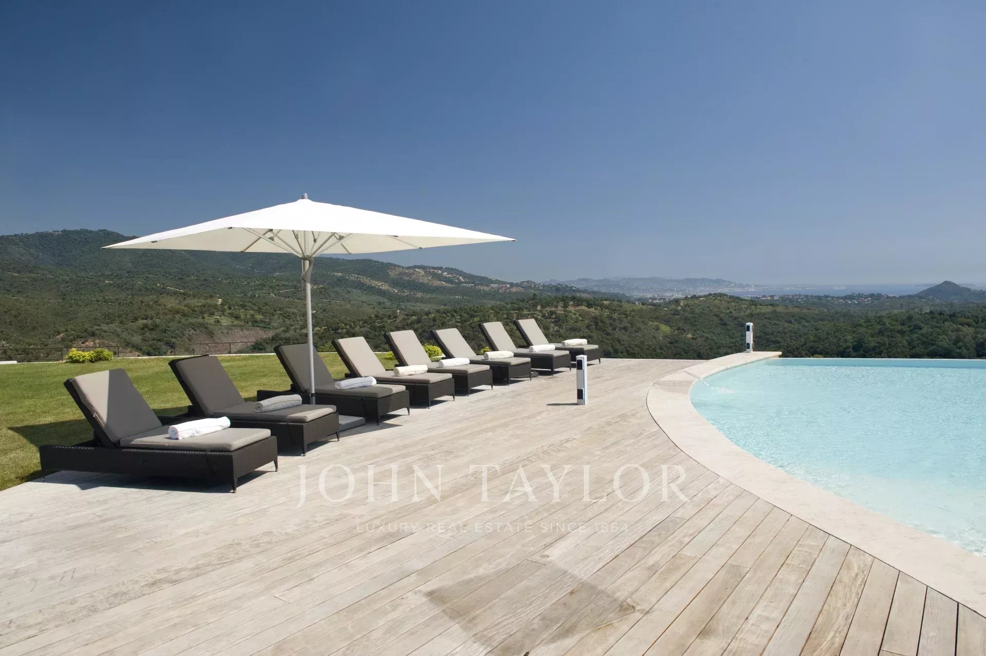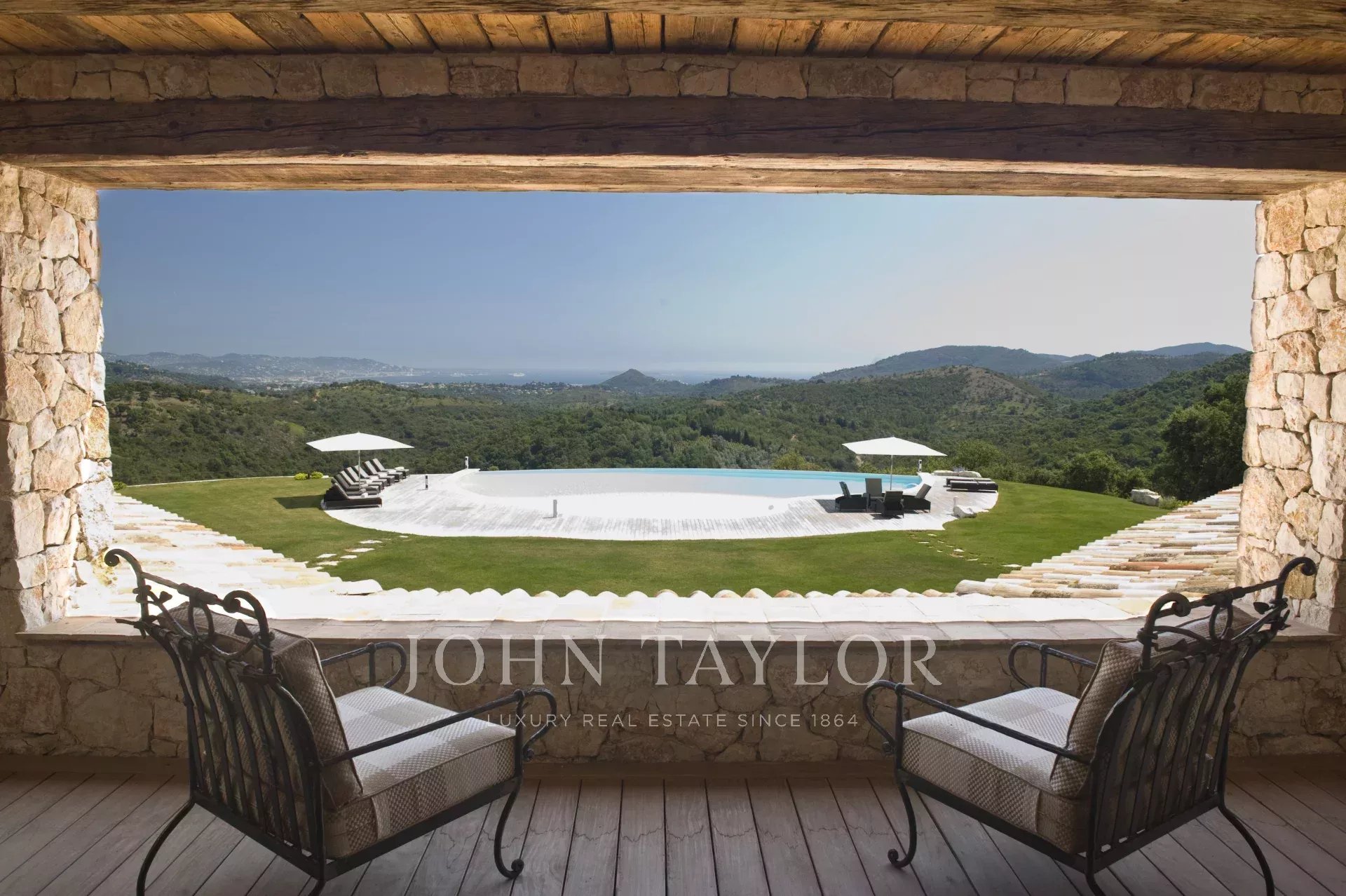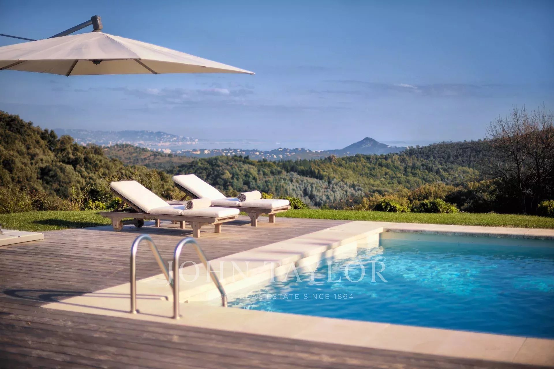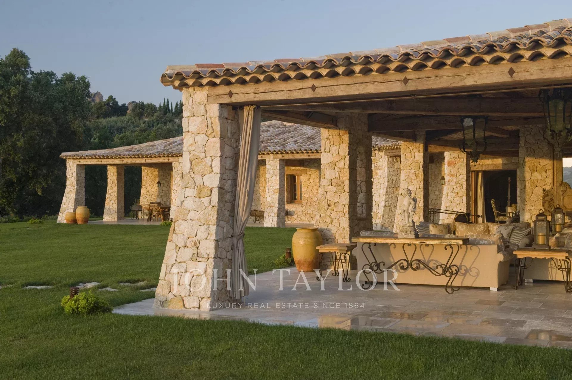 This unique and exceptional property is at only 20 minutes from Croisette in Cannes and 10 minutes from Cannes Mandelieu Airport. Private estate of 30 hectares laids out with care of hundred years old olive trees, lavender fields, lawns, tennis court, footpath or jogging (4 km) and heliport. Spectacular view overlooking the Bay of Cannes, Les Iles de Lerins and the Esterel Mountains.